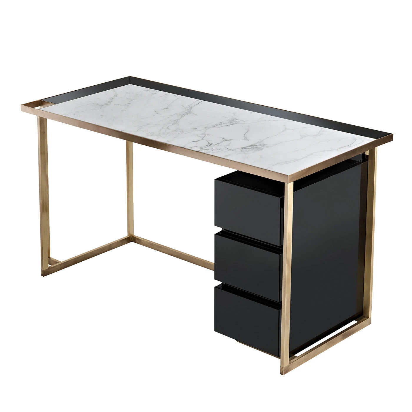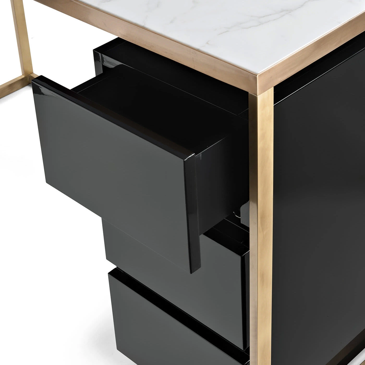 This distinctive desk features an elegant brass frame supporting a mounted marble top highlighted with back-painted glass in black for a striking contrast. Three drawers in black-lacquered wood are placed on one side adding storage space to this superb object of functional decor for a contemporary private study. The desk was designed by Studio 63 and introduced at the 2019 Salone del Mobile in Milan. All the materials of the piece can be personalized, please contact the Concierge for information.