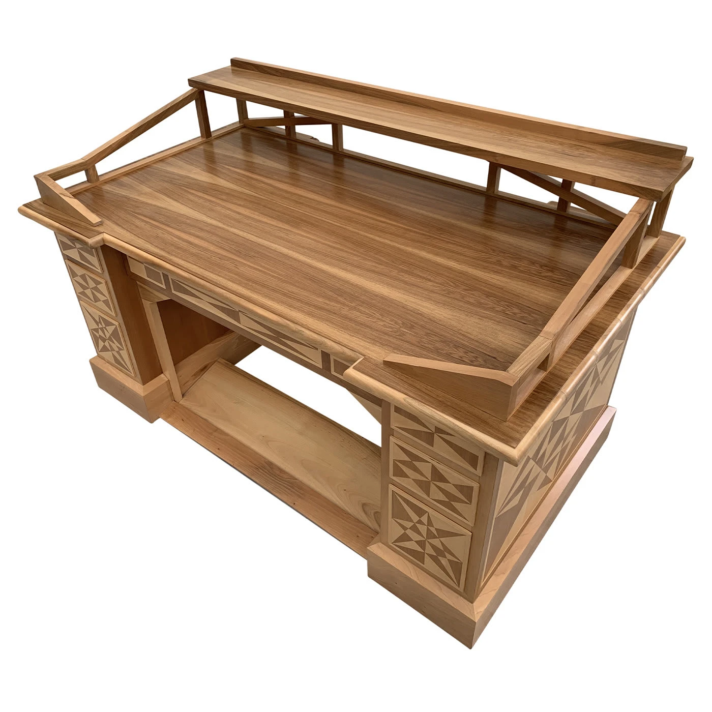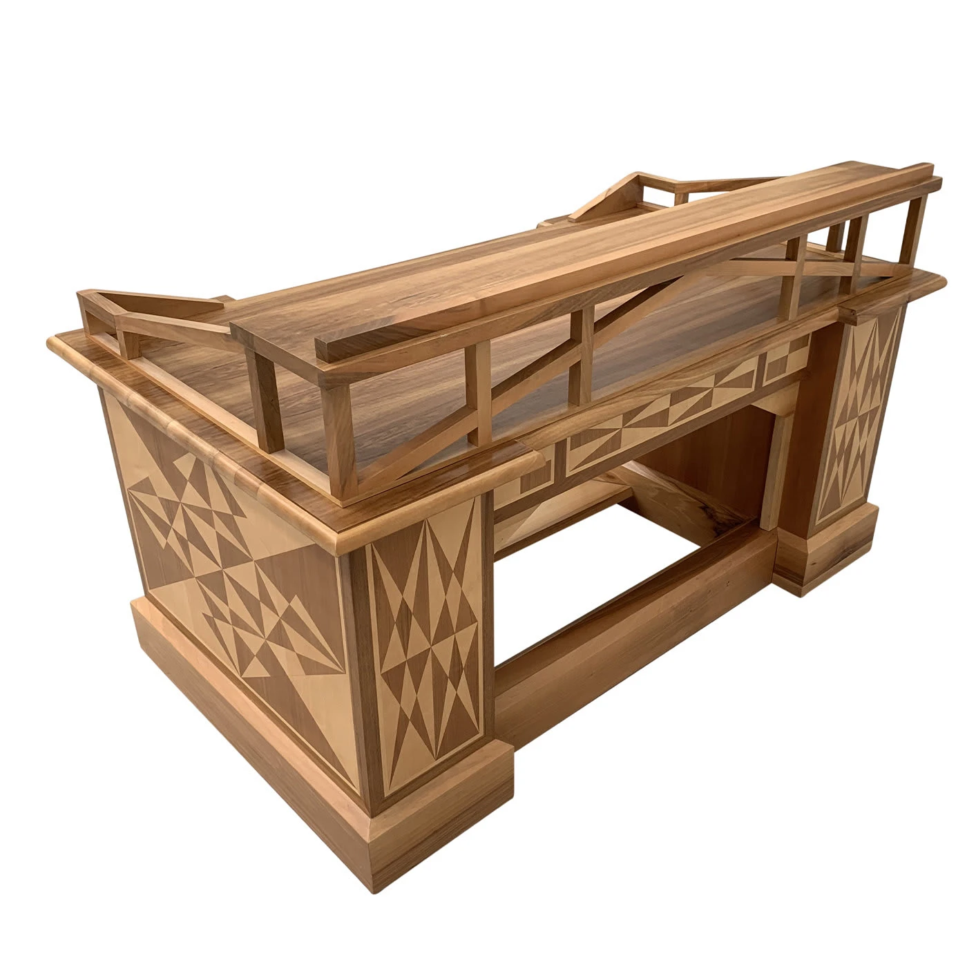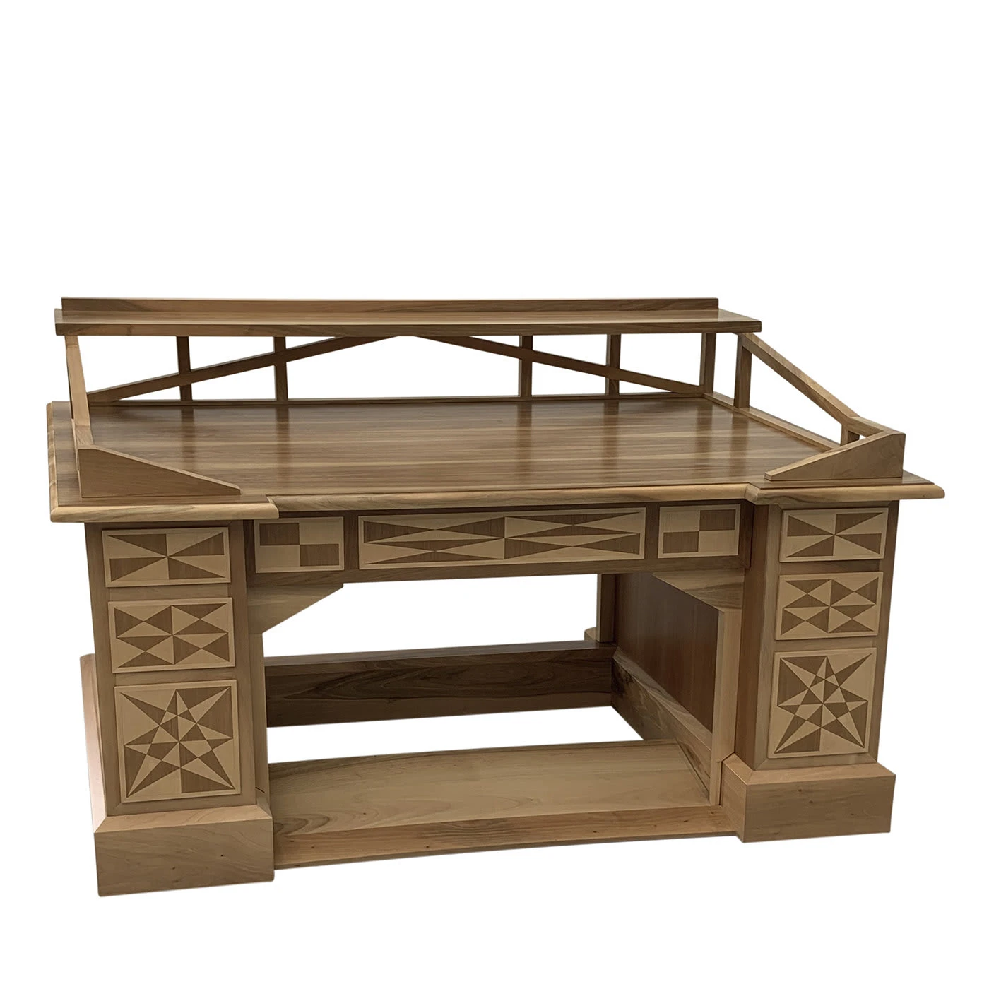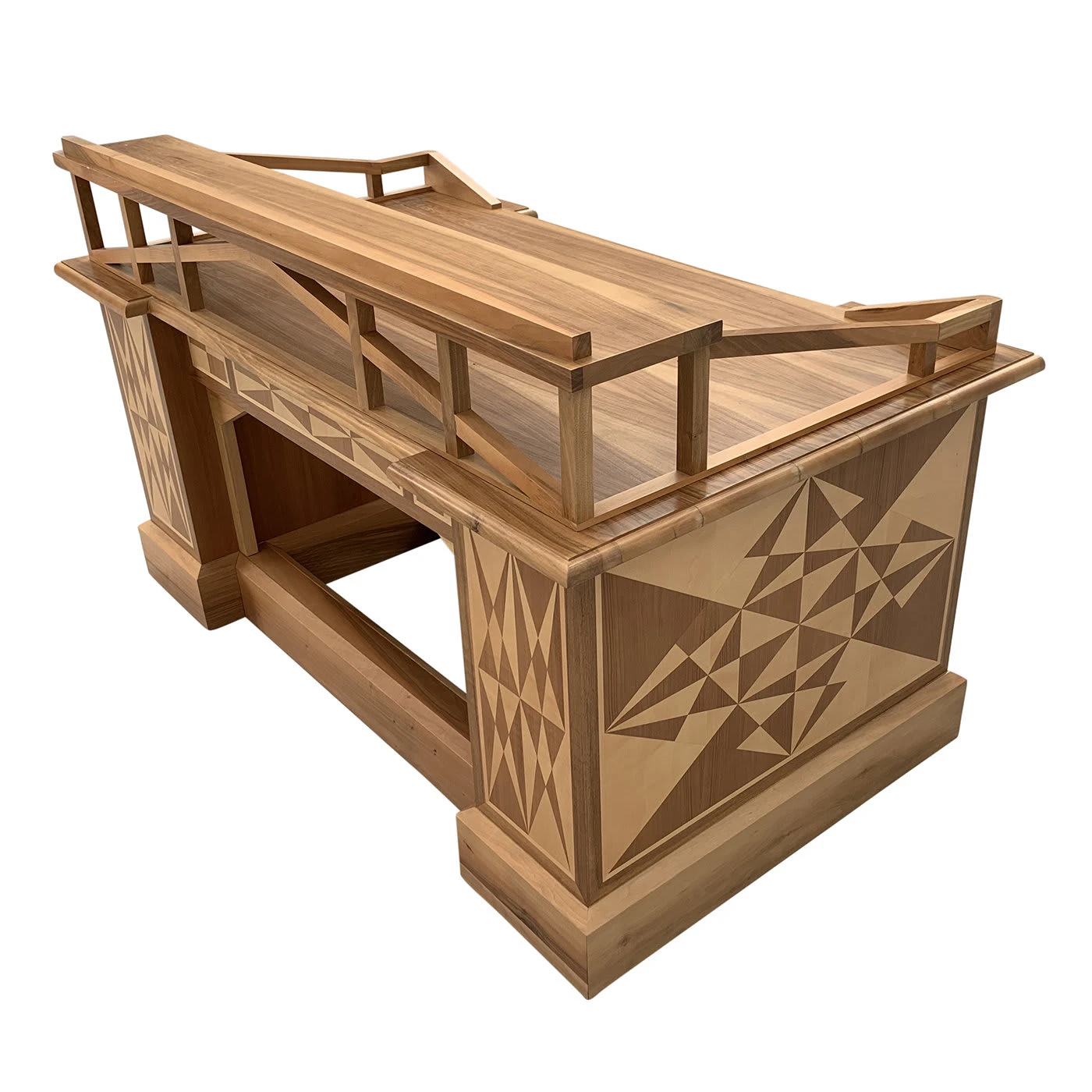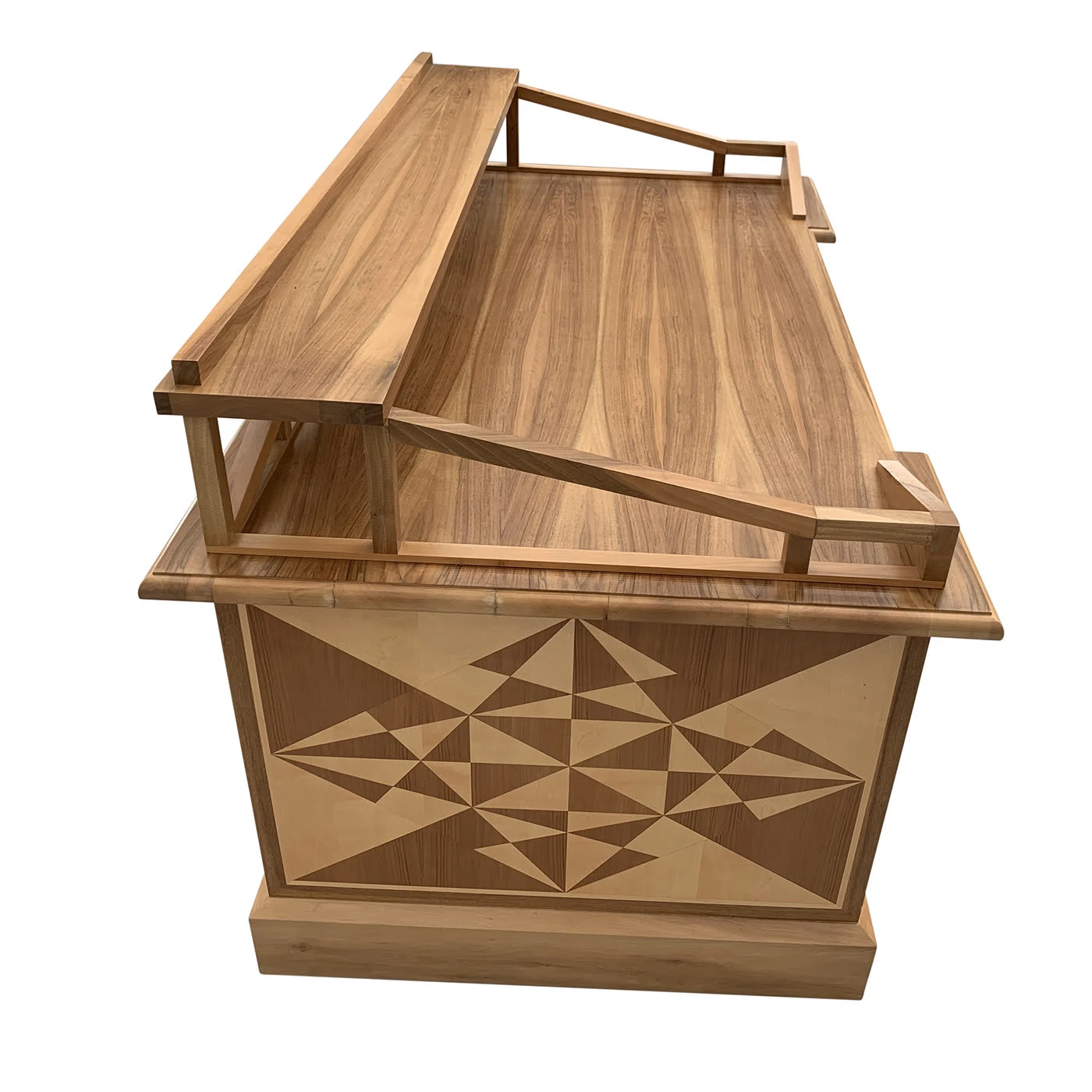 A bold and stately piece of functional decor, this desk is a unique work of art that combines Futurist and Art Deco inspiration in its striking design. Part of a two-piece series created according to architect and artist Gerardo Dottori’s original drawings, dating back to 1922, it is handcrafted of solid wood and distinguished by captivating geometric decorations showcasing two different veneers. Effortlessly adorning classic or contemporary studios or living rooms, it can be used as a display piece or desk.