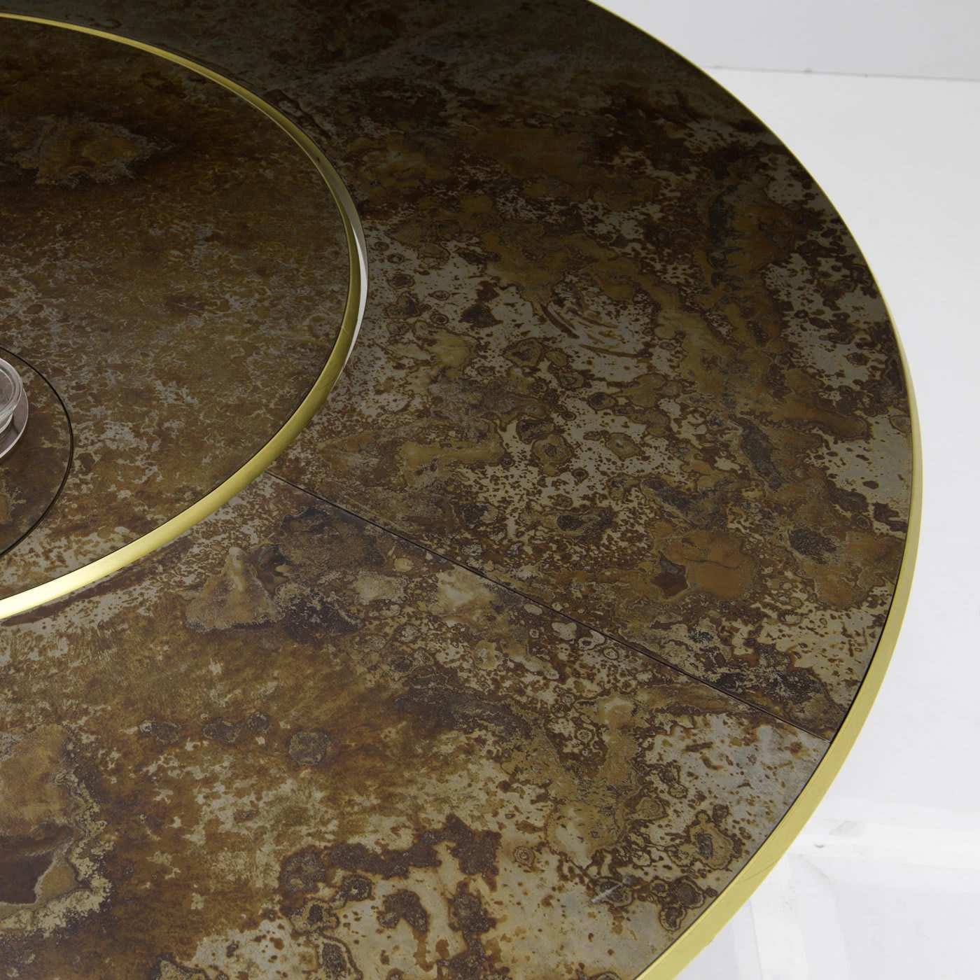 This striking wooden dining table is comprised of a system of three rotating disks to serve and share food. The disks rotate independently on their axis. Five bent metal legs support this unique top.