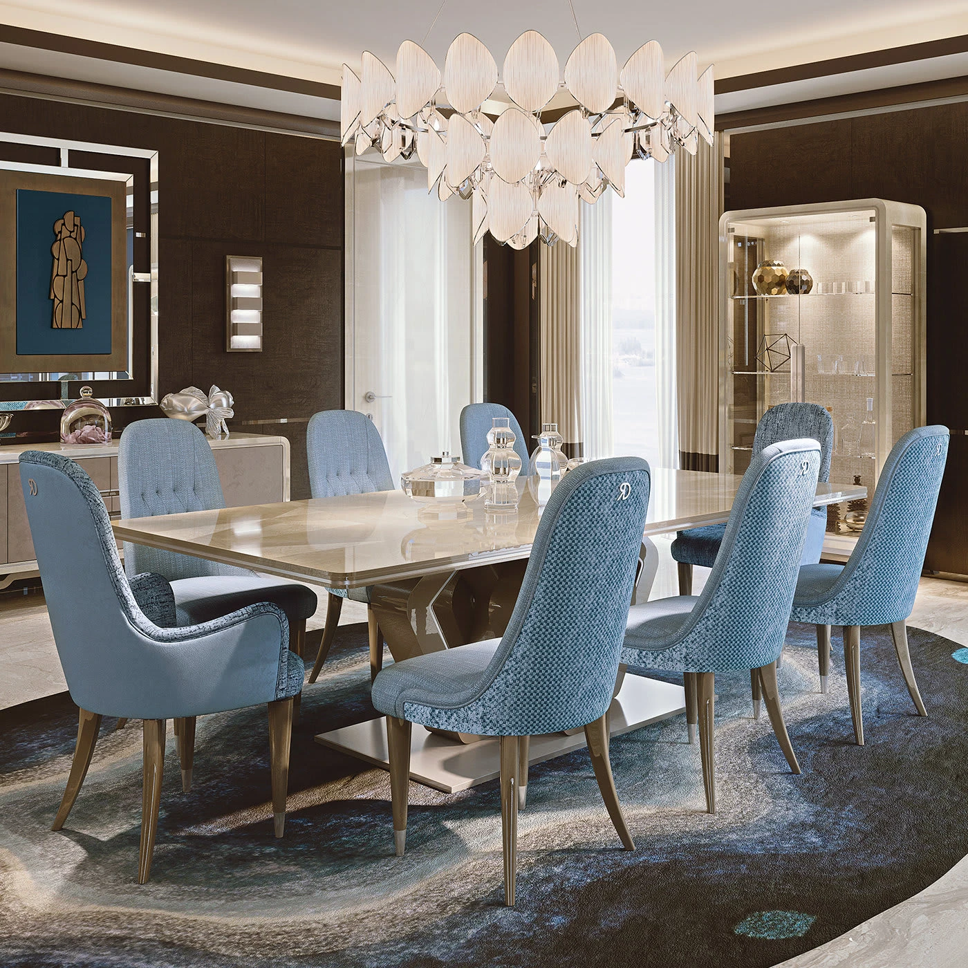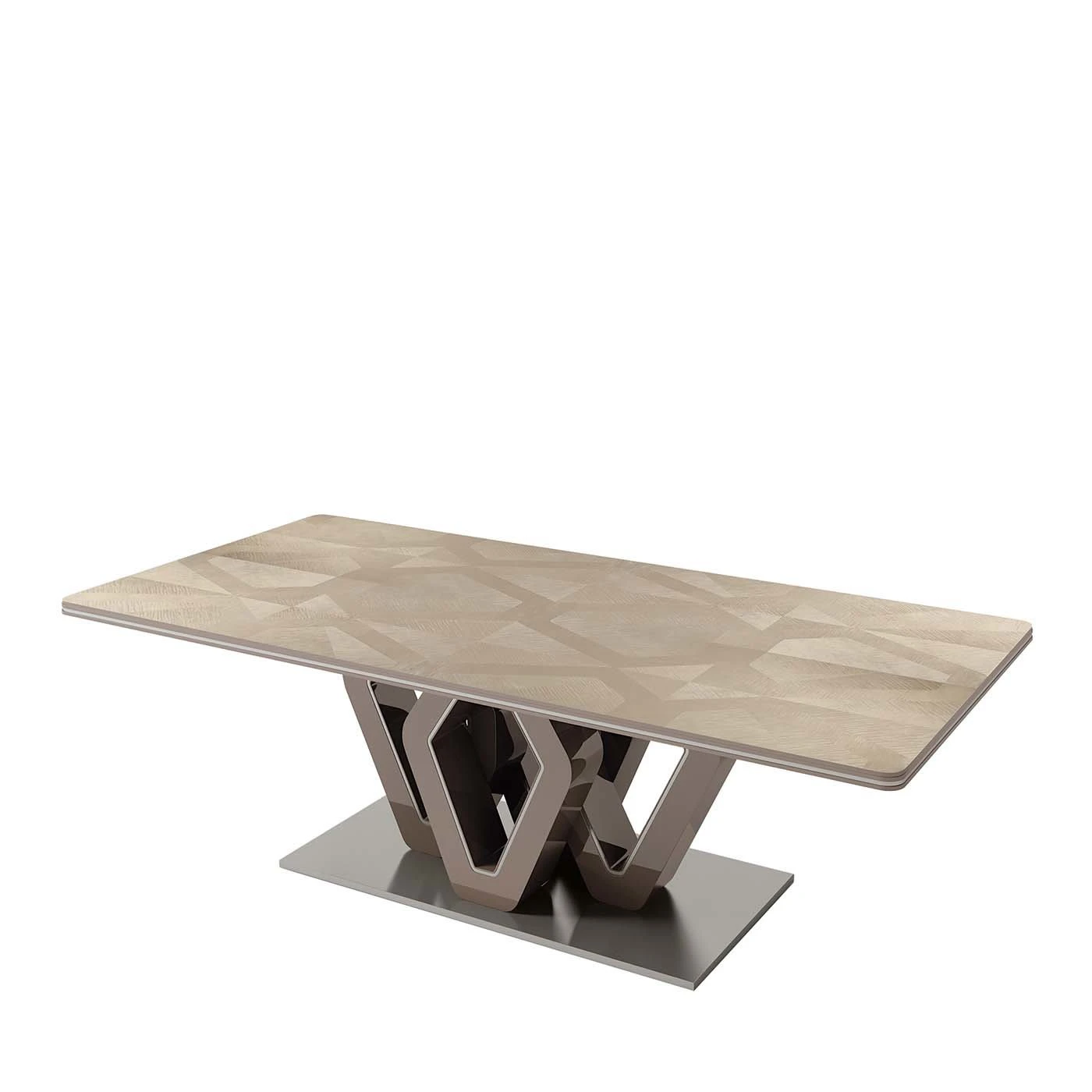 This statement table is distinguished by innovative use of line and form, pairing a plain rectangular top with an eye-catching geometric base. Beautifully crafted from solid wood, this piece combines two contrasting finishes: polyester Visone lacquer and high-gloss Sycamore Frisé veneer. Finished with satin palladium metal details, the Hanami Urban Chic Rectangular Table makes a unique addition to any contemporary home.