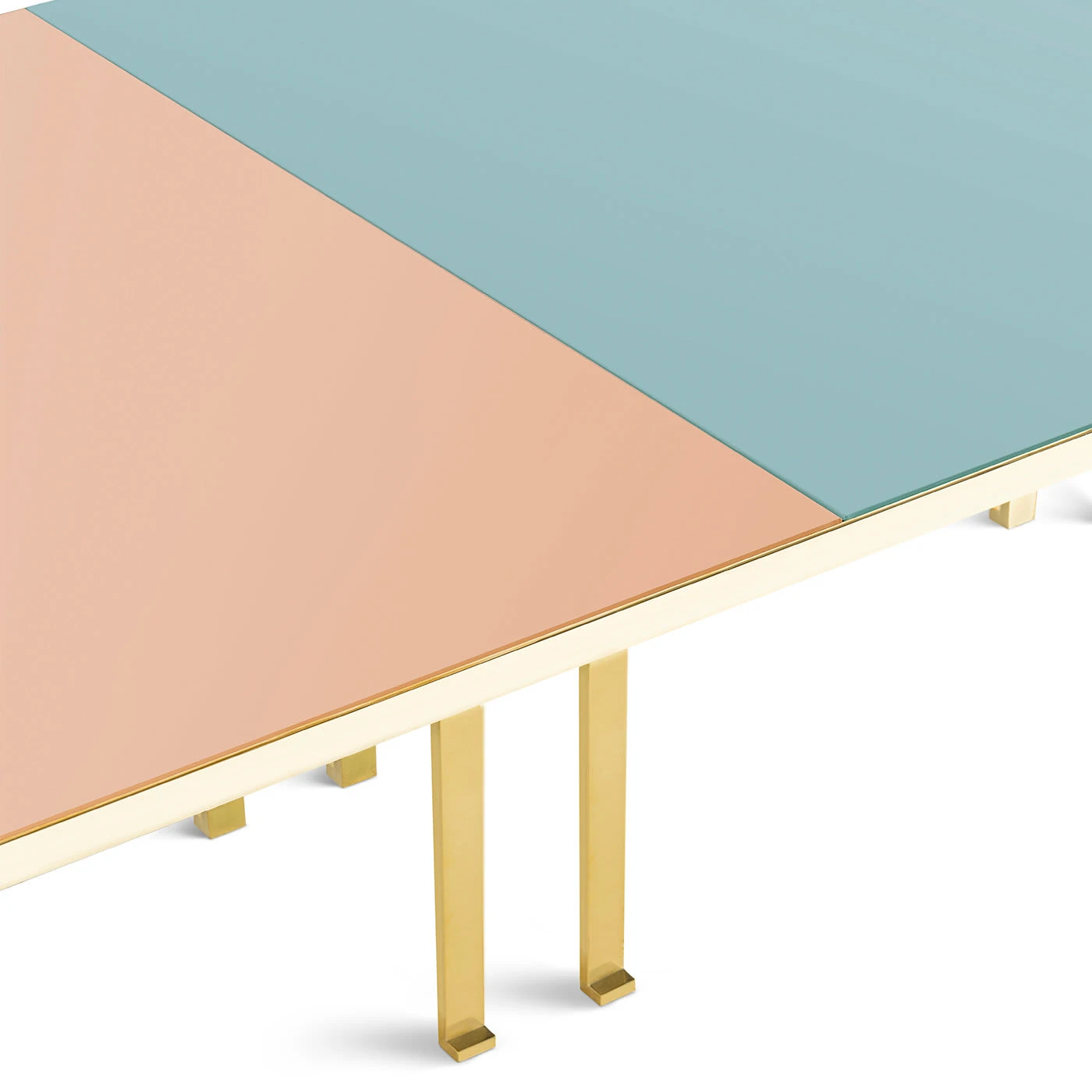 Designed by Filippo Feroldi for Purho and Colleoni Arte, this remarkable table flaunts a distinct geometric inspiration of high visual impact that will undoubtedly elevate any contemporary setting. Its octagonal brass structure comprising 12 legs with slightly bent feet is surmounted by a black-lacquered wooden board, which is concealed by a glass layer back colored in azure for a half and pink for the other. Please ask the Concierge for customization options.
