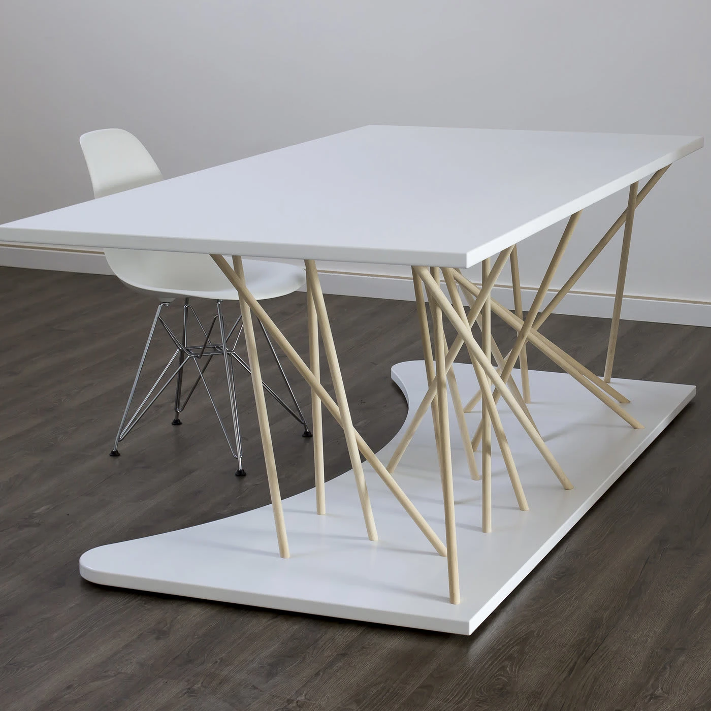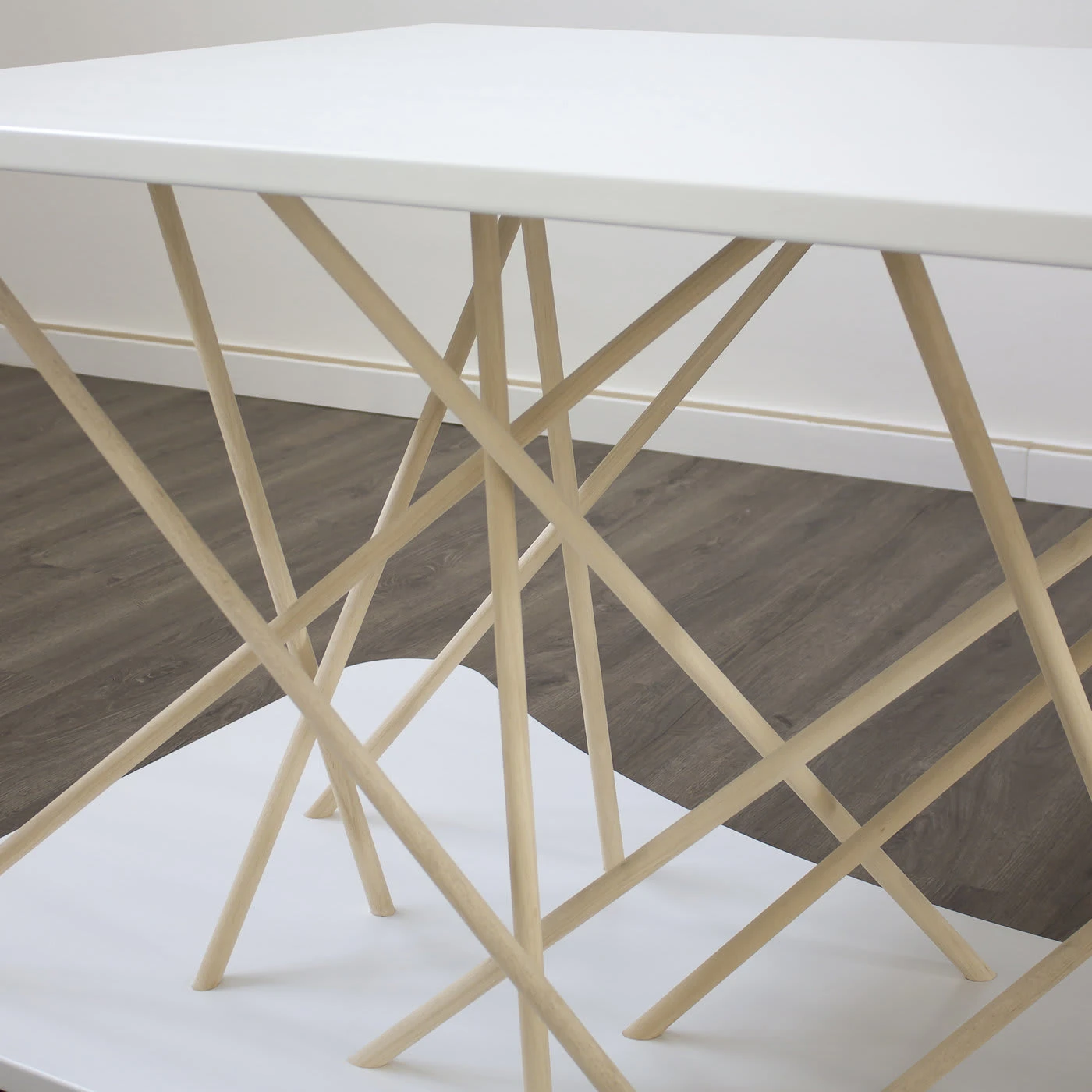 Bold lines and exceptional detailing will make this desk the focal point of any modern-styled office. Handcrafted entirely of solid wood, this piece stands out for its intriguing design achieved by the intersection of natural-finished rods with the rectangular, white-finished top and base. The lines are arranged in a seemingly casual way to translate the idea of order among chaos. The bottom plank features a semicircular indentation to accommodate the desk chair. Each desk is unique and customizable in a wide range of colors Ral or RGB. Ask the concierge for details and pricing.