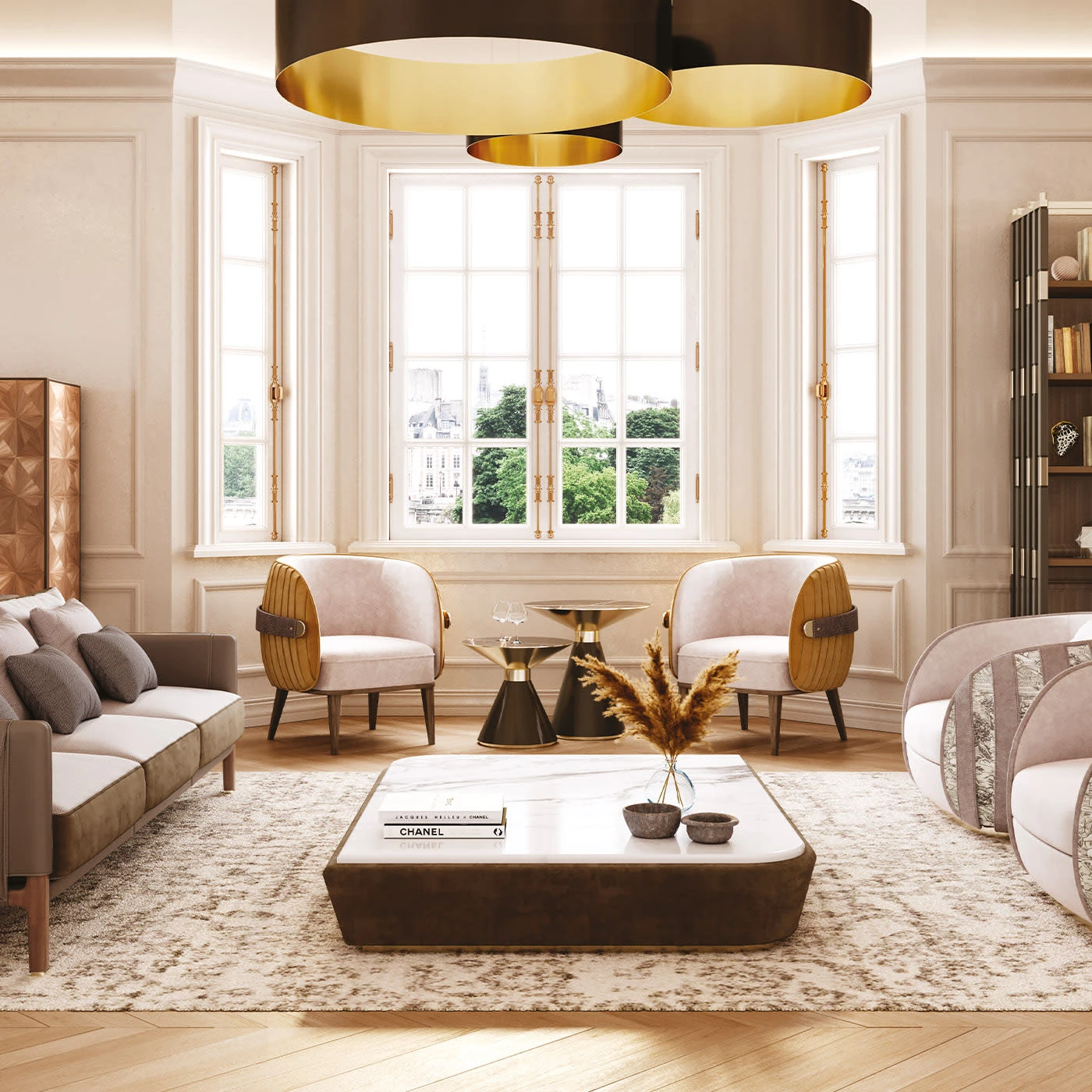 Coffee table with nubuck upholstered frame. Wood base with a metallic champagne finish and white Michelangelo marble top. This piece is part of the Secret Shapes Collection.