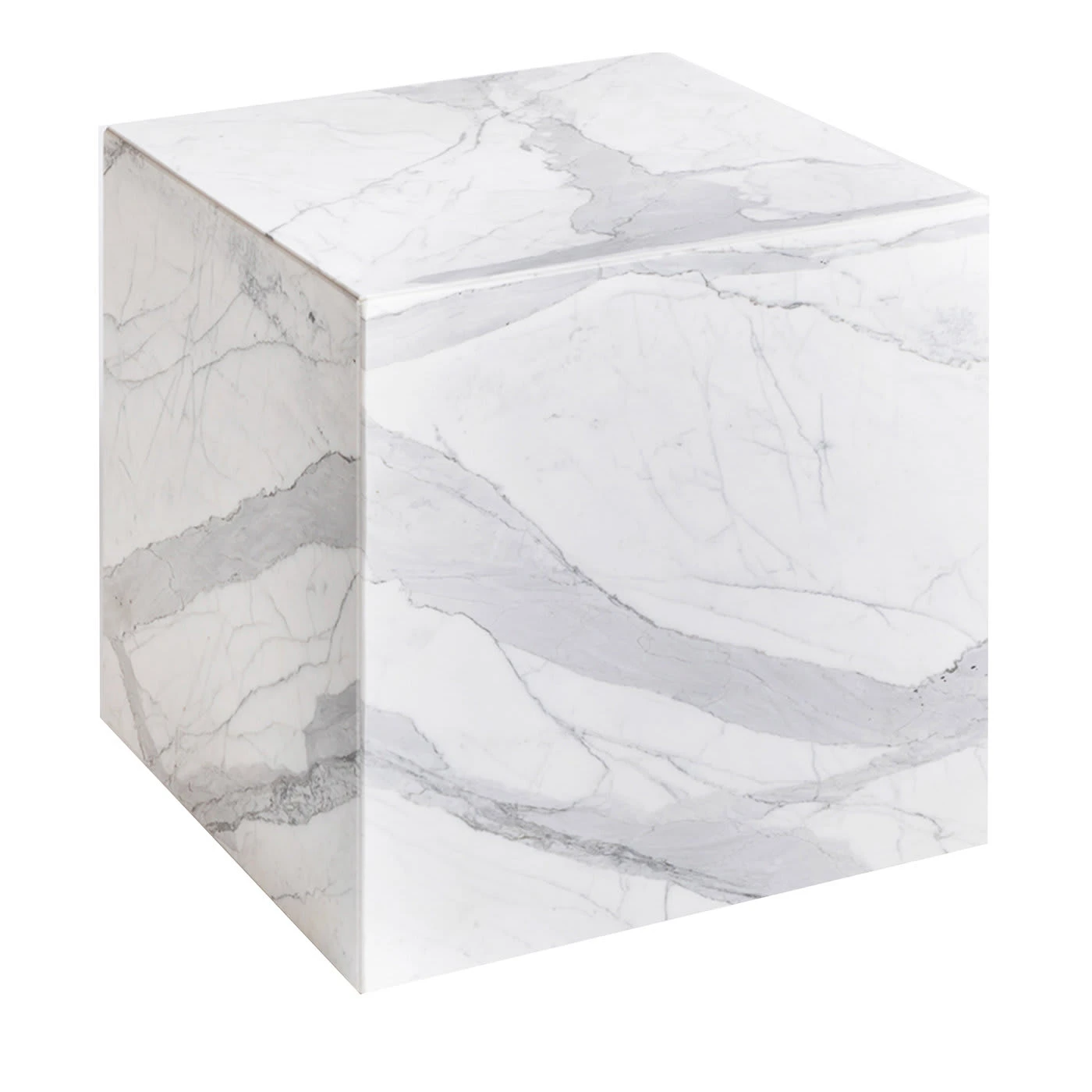 An exercise in minimalist flair distinguishes the strong character of this contemporary coffee table, whose perfectly cubed shape is an homage to the elegance of pure geometric volumes. Completed by a concealed iron frame, it features one-off gray veining creating the tracery that spontaneously graces the white backdrop of its prized statuary Carrara marble design. A wide range of customizations is available, please contact the Concierge for options and pricing.