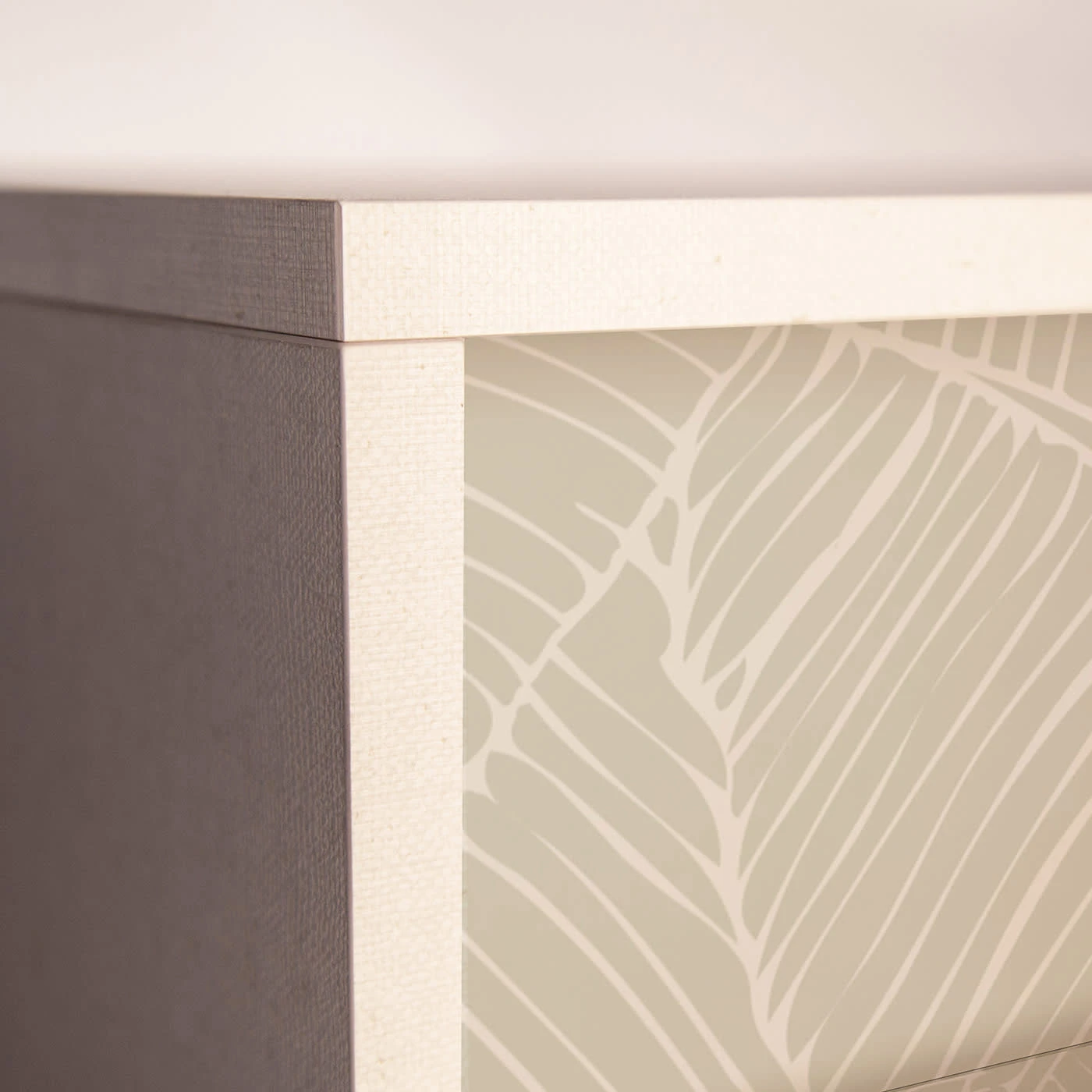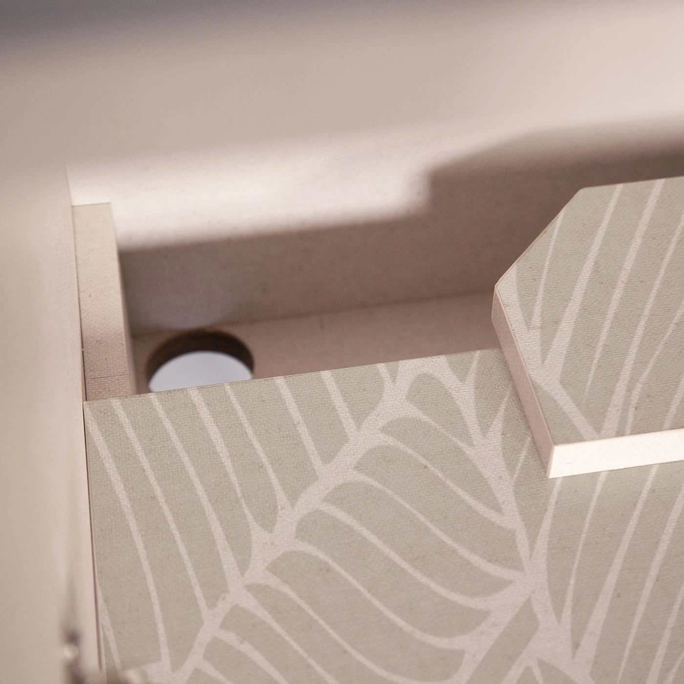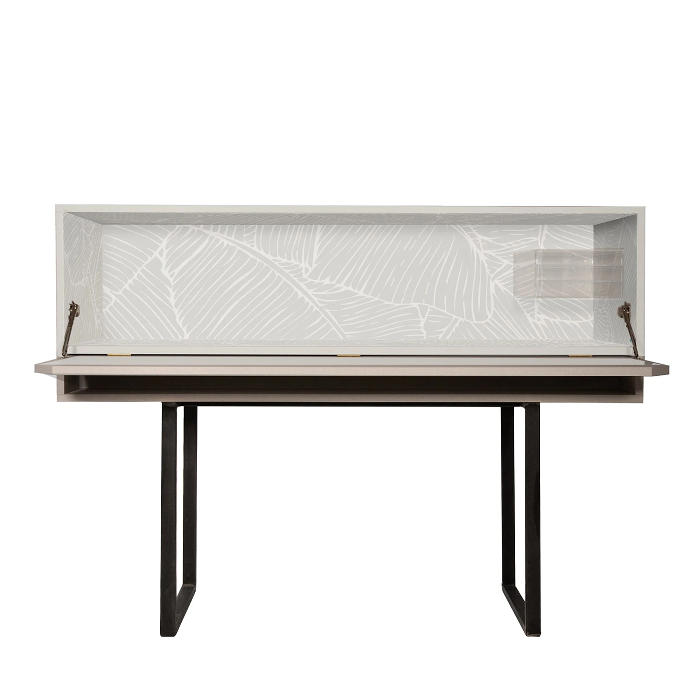 Labor Ecru desk is the smartworking station designed by the Italian-Argentine designer Luciana Gomez, creator of the “soul design concept” by Myin. Like all Myin furniture, Labor amazes at the moment of opening, revealing internal texture inspired by tropical nature. Handmade in poplar melamine linen effect, with a useful stationery container and iron legs. UV polymerization printing technique.