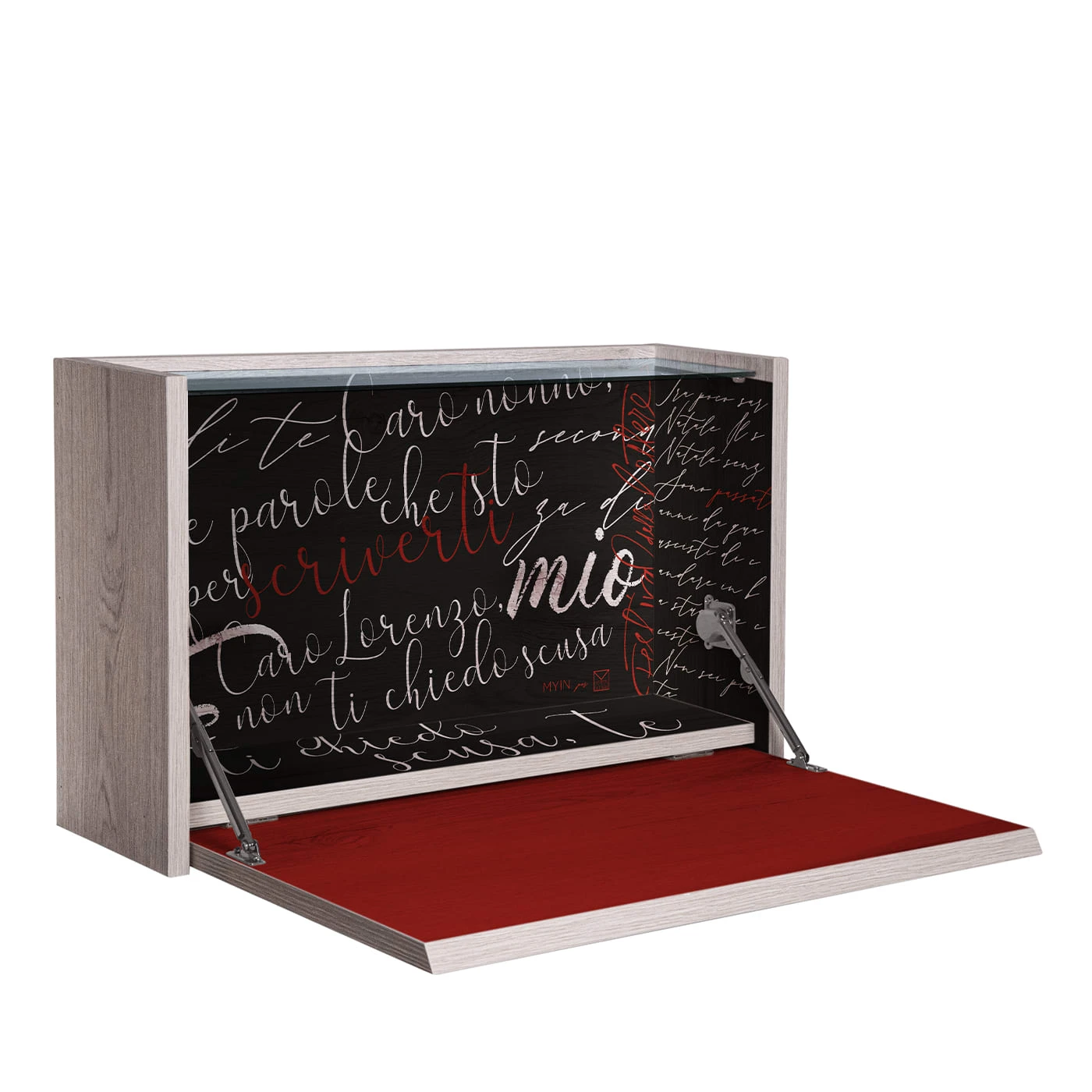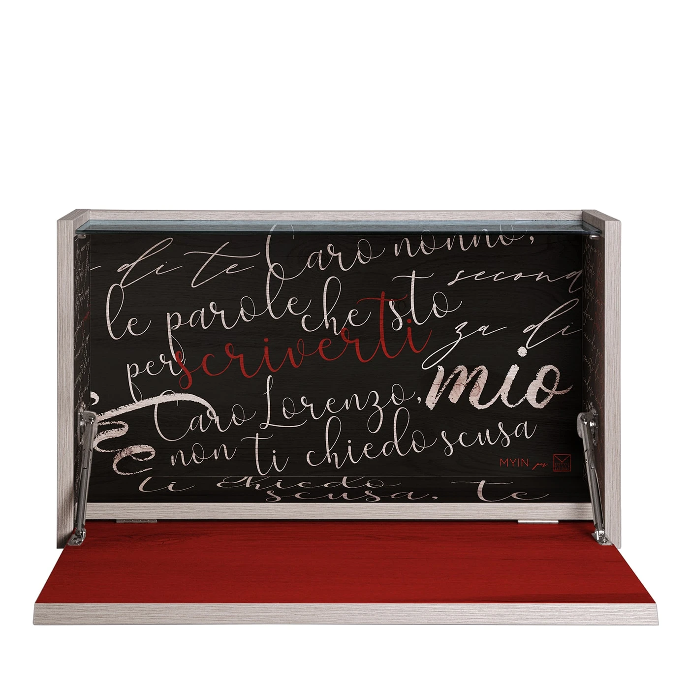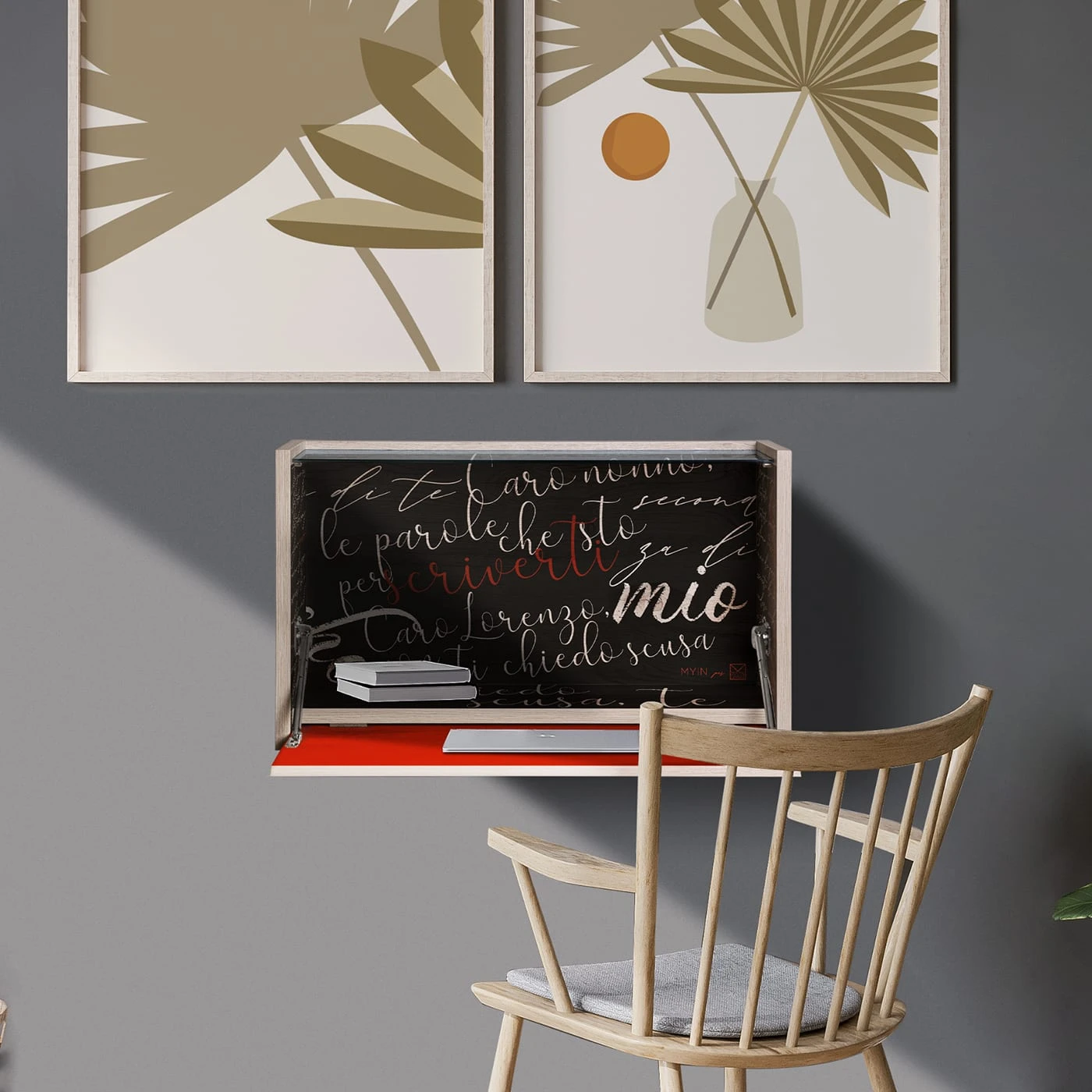 The Festival delle lettere − Italy’s key cultural event dedicated to epistolary literature − served as inspiration for a texture creation that places the accent on the emotional and aesthetic impacts of handwriting. Designer Luciana Gomez drew inspiration from the thousands of letters received by the Festival over the years, for her striking graphic work, also highlighting the official colour used for the event (black as ink, white as paper and red as the passions we read between the lines). The desk is raised, thanks to its wall-mounting system.