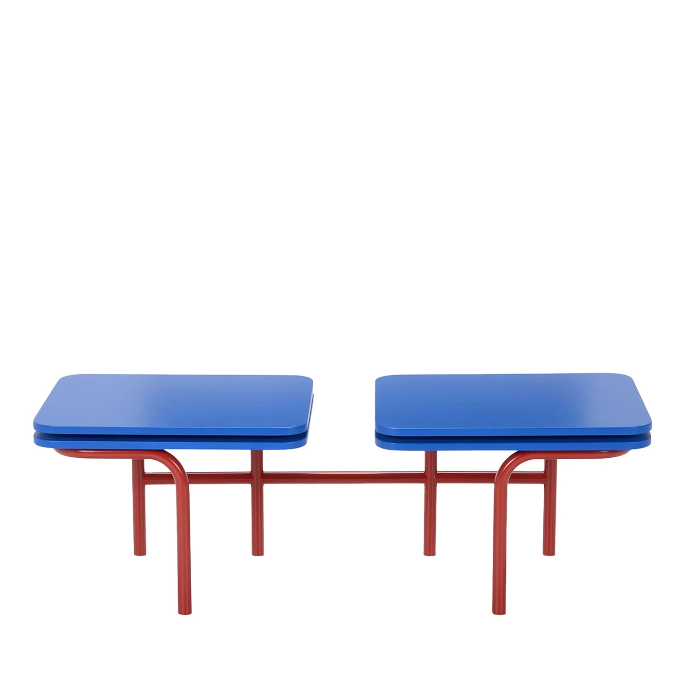 A daring chromatic contrast and clever double-top design distinguish this coffee table Daria Zinovatnaya designed as an eccentric addition to lively contemporary decors. The two MDF tops with a tiered, sandwiched design are lacquered in a vibrant blue hue and sit on a sturdy yet lightweight cylindrical metal base varnished in vibrant red. More color options are available in the Artemest catalog.