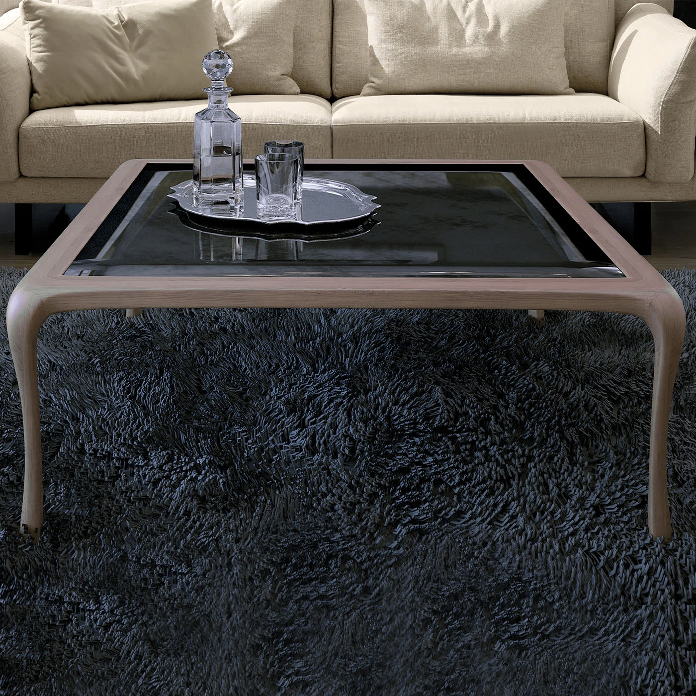 A graceful frame in solid beech embellished with a delicate finish of light walnut lends this sophisticated coffee table an enchanting allure reminiscent of phytomorphic elements. Devoid of any sharp angularity, it frames a precious, square glass top (8mm thick) with beveled edges. Ideally placed in the middle of neutral-toned, fresh living space, the design preserves its quality untouched if carefully cleaned using only a cloth.
