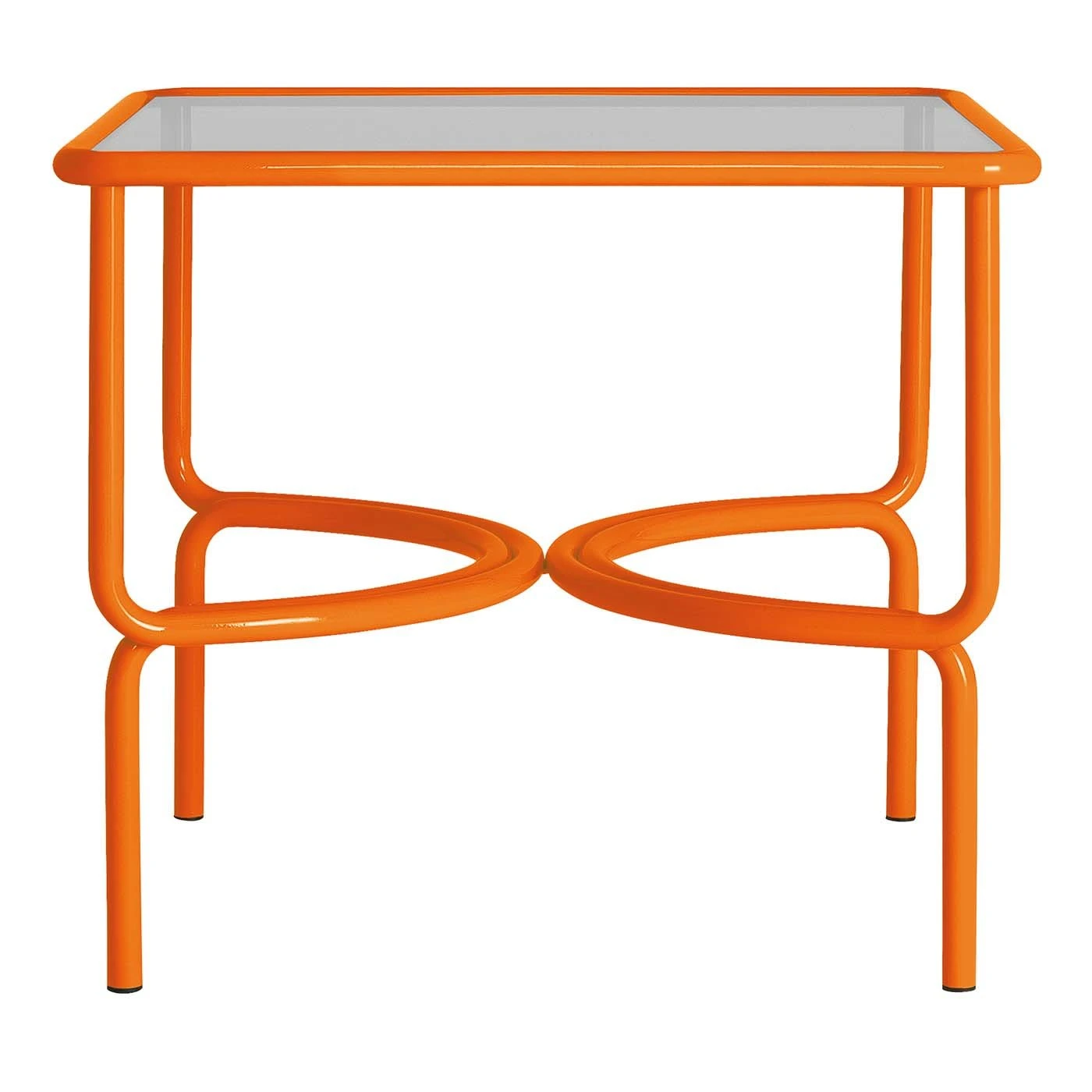This dining table is an original design from the Locus Solus series of outdoor furniture designed by Gae Aulenti in 1964, brought back by Exteta in 2016. The linear frame of tubular steel is enriched by unexpected curves along the base that recall the iconic architectural works by the late Italian designer. Finished in bright orange, the square top is in extra-light tempered glass.