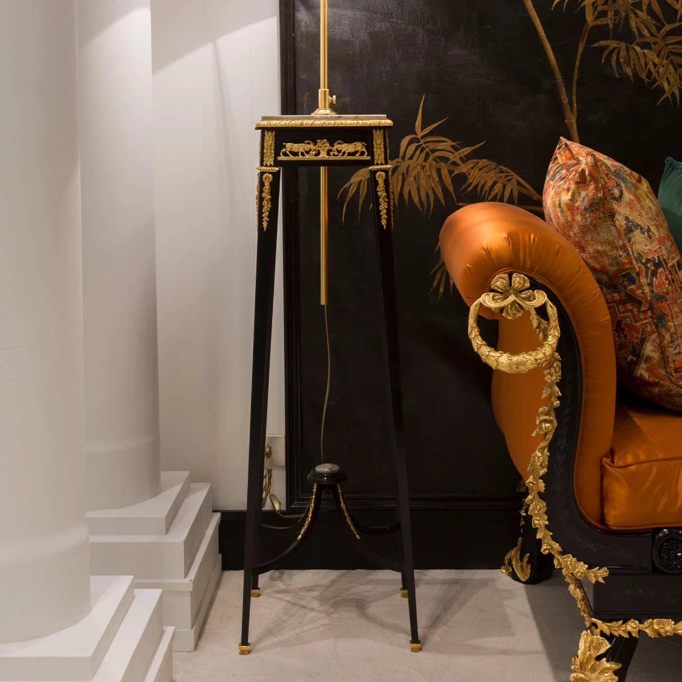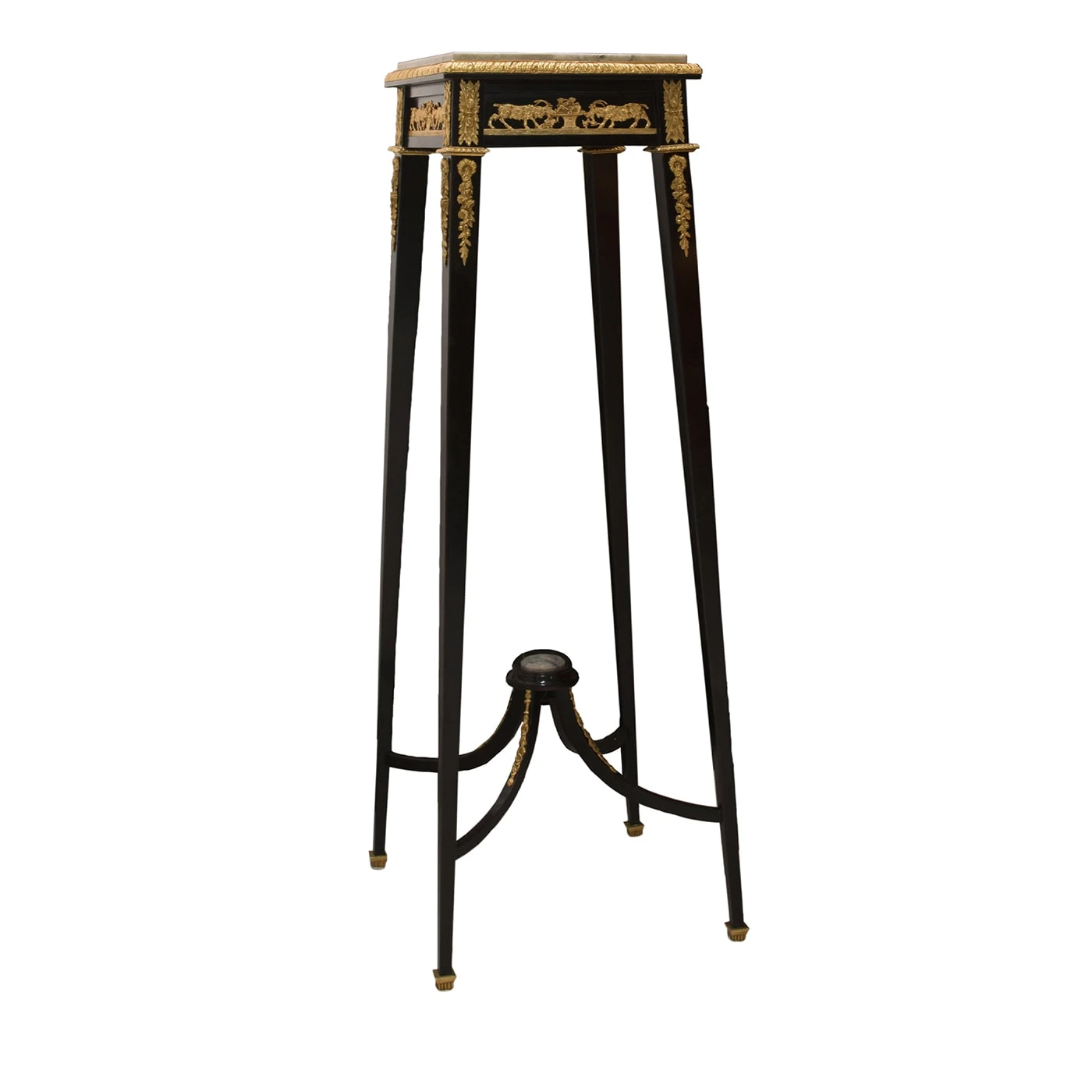 Showcased as a functional side table or as an iconic decorative objet d’art, this stupendous column in Louis XVI style will be a statement piece in classic and refined interiors. Handmade of black-lacquered wood, it is decorated with 24K gold-plated bronze details. The top is fashioned of marble that matches the central detail on the lower structure.