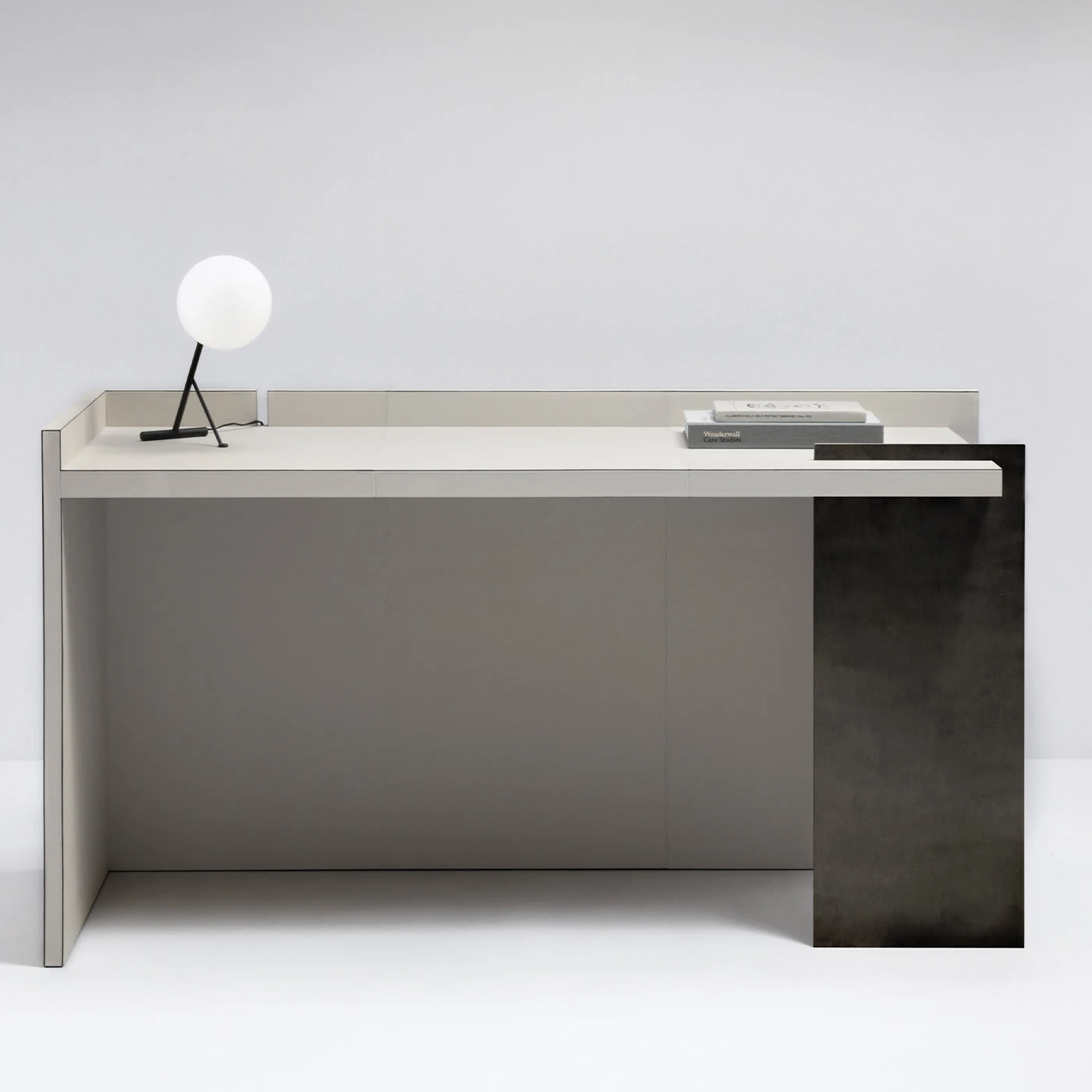 A superb combination of contrasting materials and textures, this exclusive desk by Parisian designer Stéphane Parmentier pays homage to the famous villa built by Adalberto Libera for the writer Curzio Malaparte. The rigorous geometry and modern simplicity of the frame reconcile functionality and aesthetics, wrapped in soft white leather with one open side sustained by a bronze-finished panel functioning as a leg.