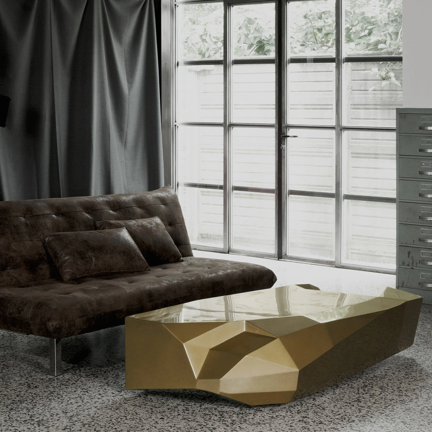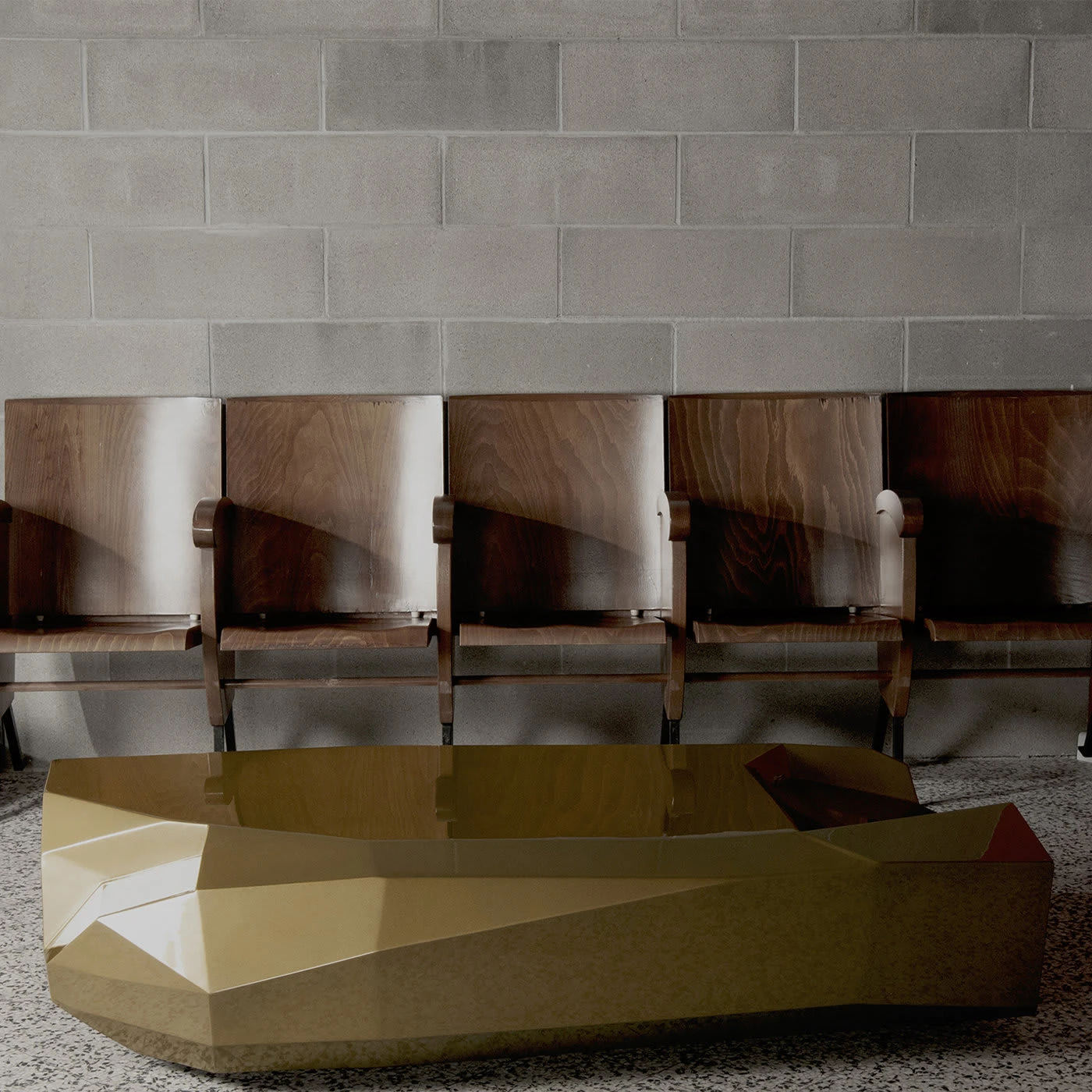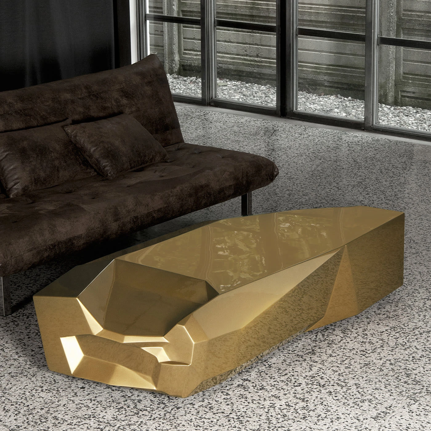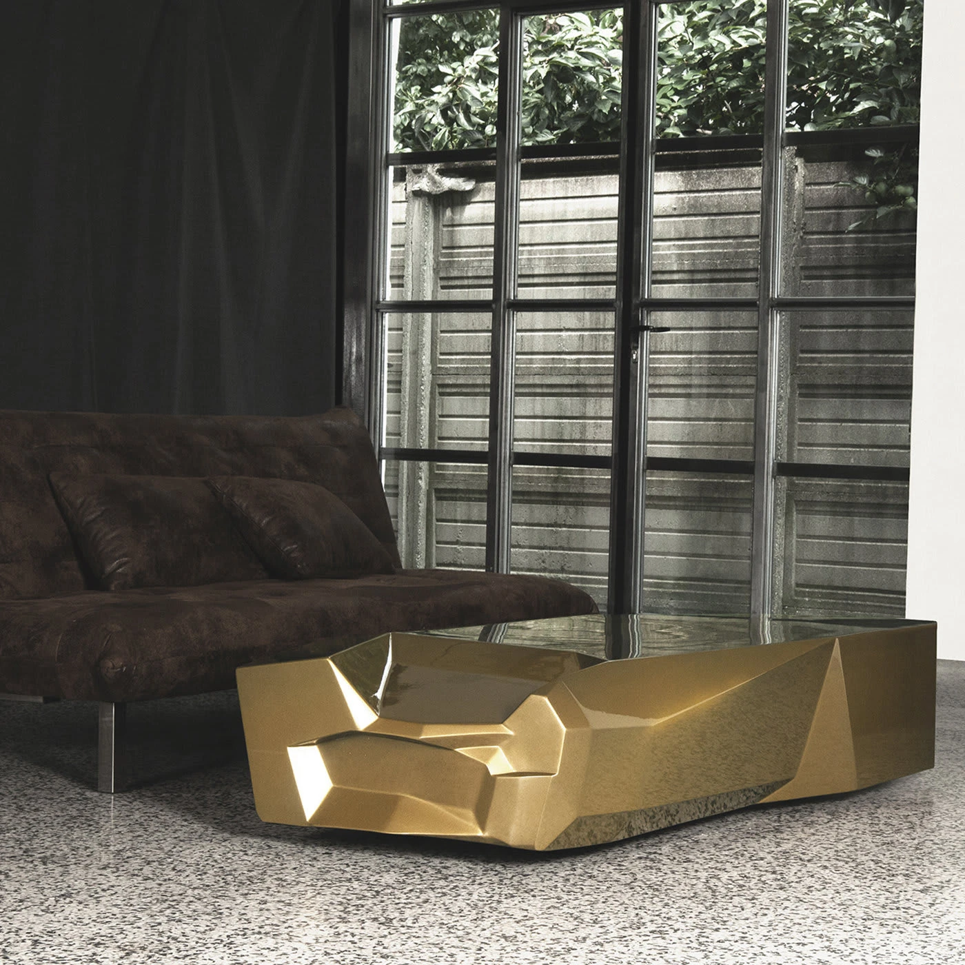 Part of the Kripto Collection, this one-of-a-kind golden coffee table is a sculptural work of art. Inspired by the mid-century Mercedes prototype, its striking structure comprising adjustable feet is fashioned of 73 flat polygons of steel, laser-cut and welded by hand. The velvety finish is obtained through a complex process that upgrades the one featured in luxury car production: the varnishing involves three steps before the application of transparent finish and a final, hand-applied polishing in five steps. Please ask the Concierge for color customizations.