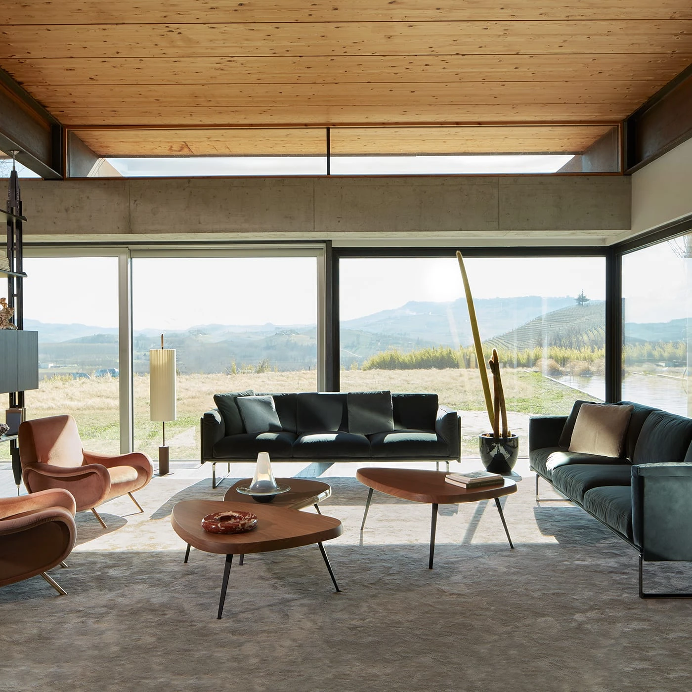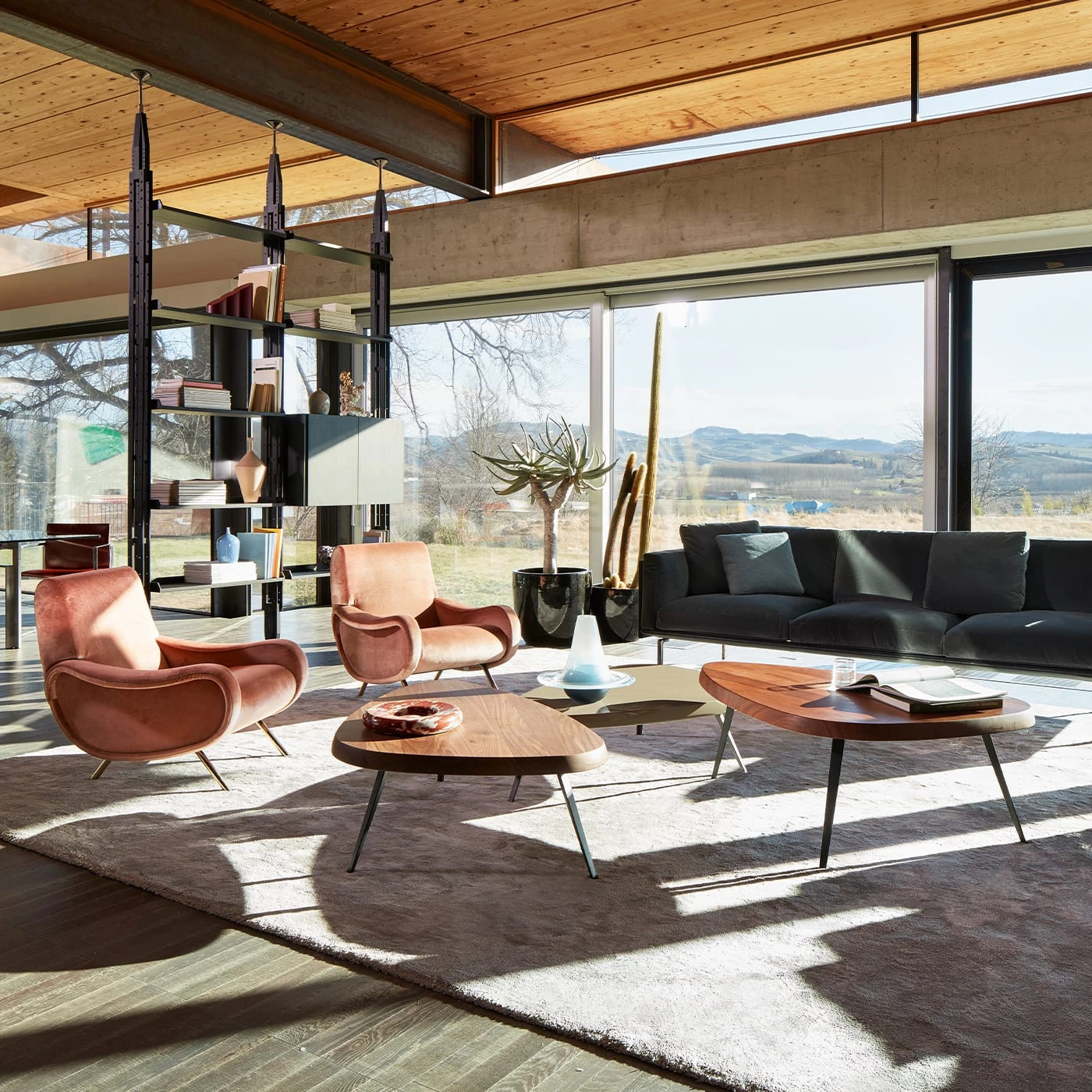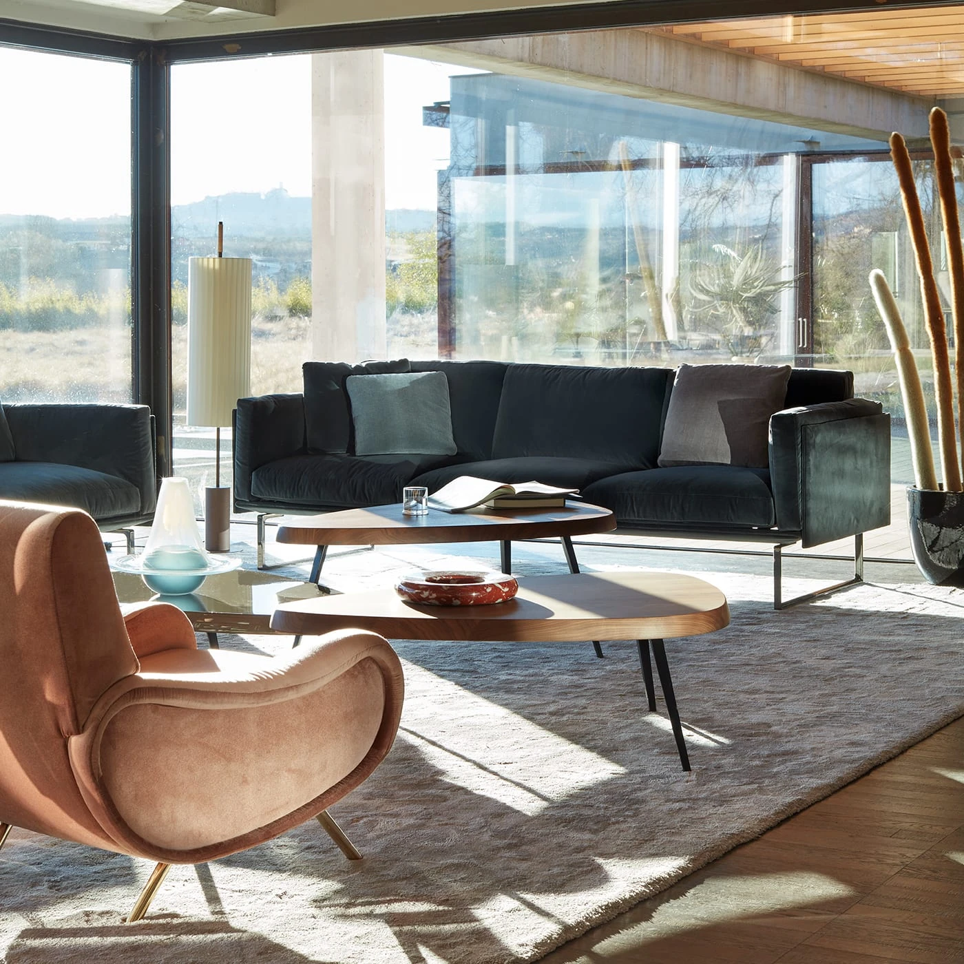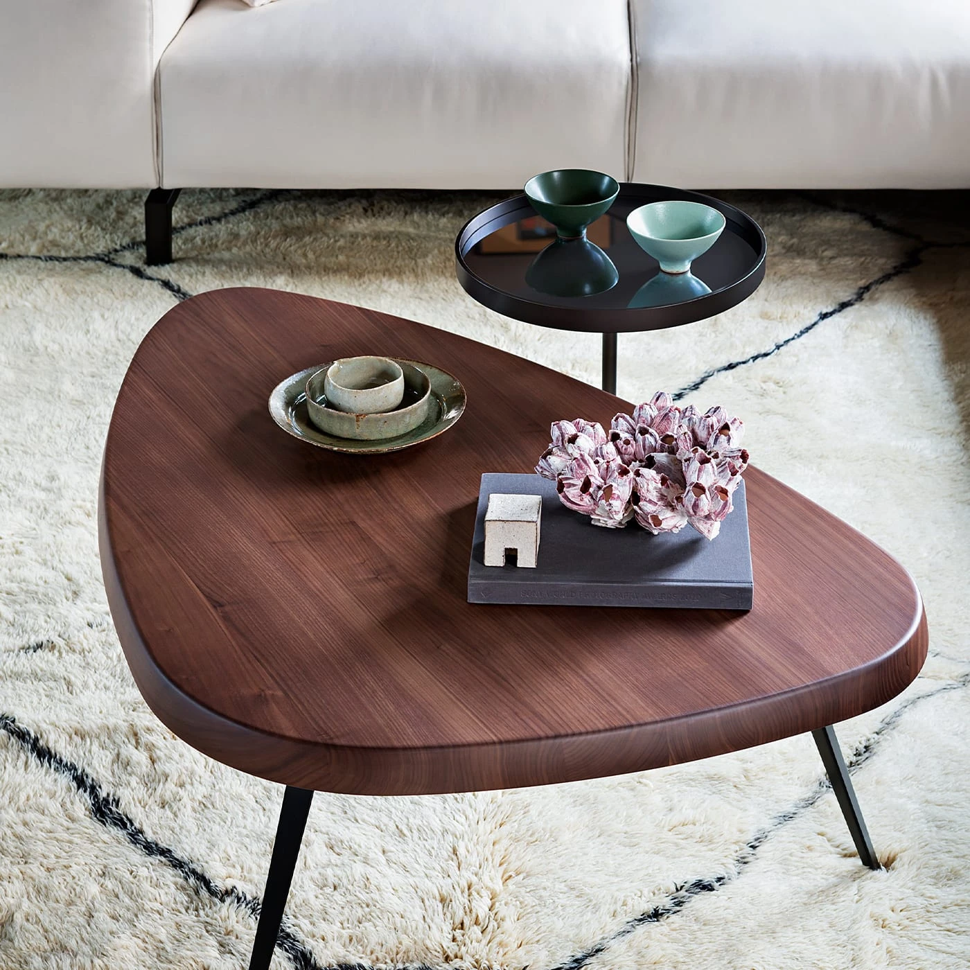 Mexique – Triangular table in american walnut solid wood. Included as one of the tables en forme libre created between 1938 and 1939, the fi nal design was developed in 1952 for the students’ rooms of the Maison du Mexique at the CitĂ© Universitaire Internationale in Paris. With a frame designed to be as compact as possible, the tables could be juxtaposed to create larger, symmetrical units. In 1952, the wooden legs were replaced by triangular-section bent metal. In 1956, the lowlevel version was created for the Galerie Steph Simon in Paris. The generous depth of the wooden table-top, available in solid wood, as well as with a gloss or matte fi nish, resonates with rare beauty. Meanwhile, form follows function in the edges form, refl ecting the size of the human hand. New dining versions are added for 5 or 6 people, a new bar version and two new heights for the low tables. In addition, a number of new fi nishes enhance further the potential for these tables to work together and serve new purposes.