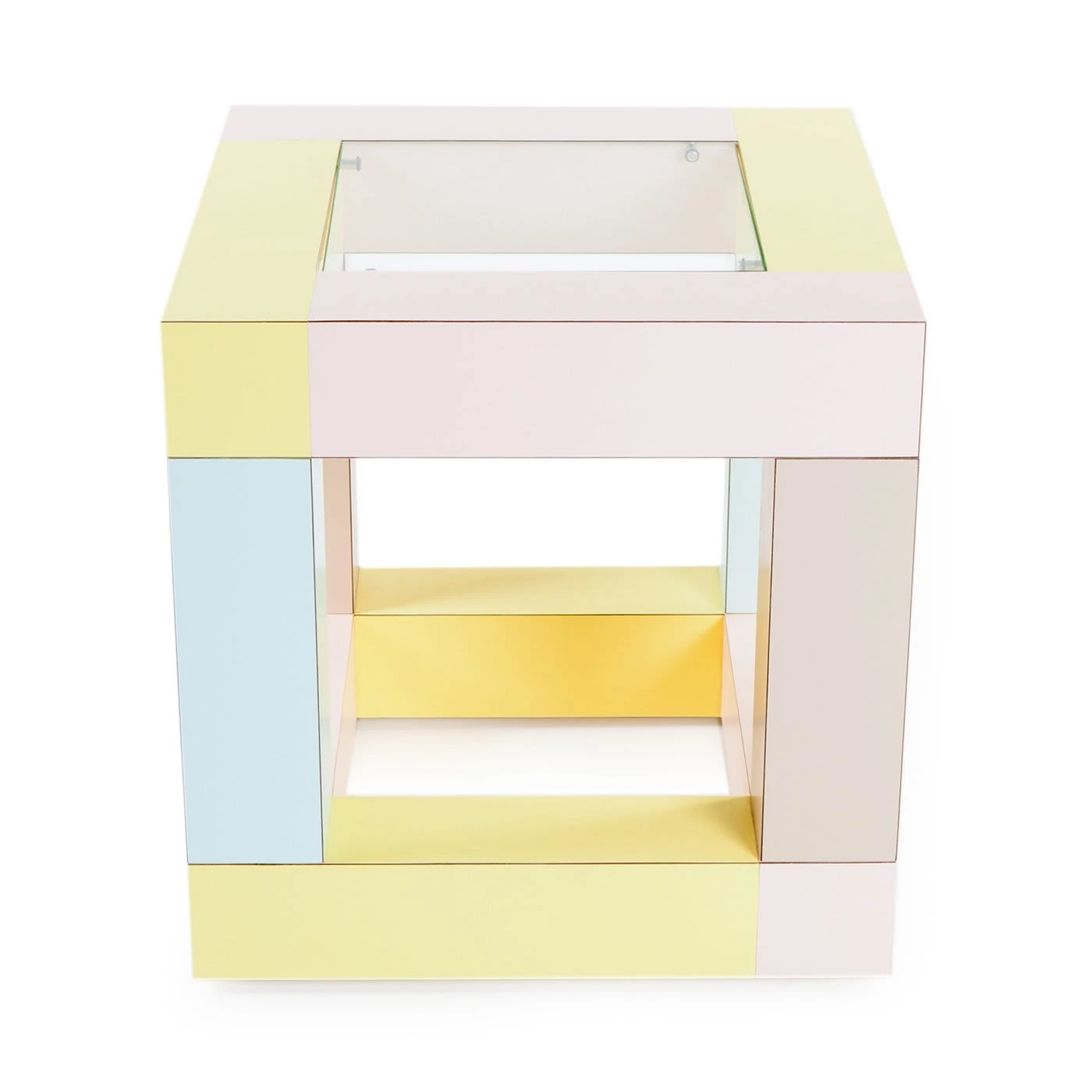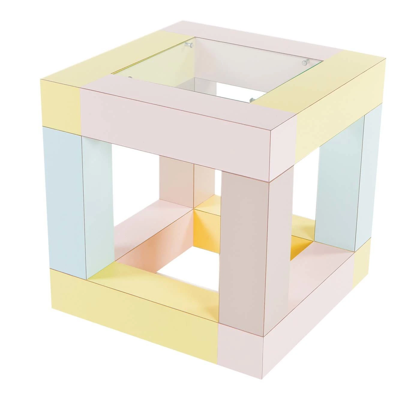 The delicate pastel color of this side table strikingly contrasts with its rigorous geometry, creating an alluring piece that will decorate with unique charm a contemporary interior. Designed by Ettore Sottsass in 1984, this table is crafted of plastic laminate in thick, square-section elements boasting pale blue, yellow, and pink, and enclosing at the top a square glass top. This eye-catching piece will be ideal for supporting and displaying small objects next to an eclectic sofa or armchair.