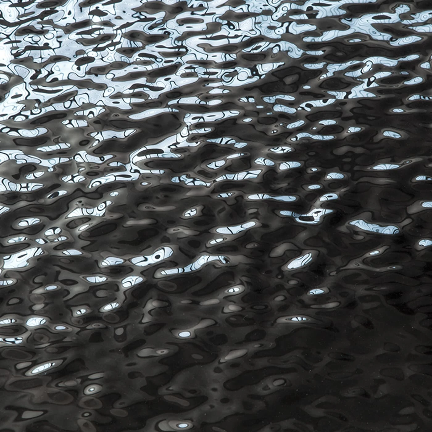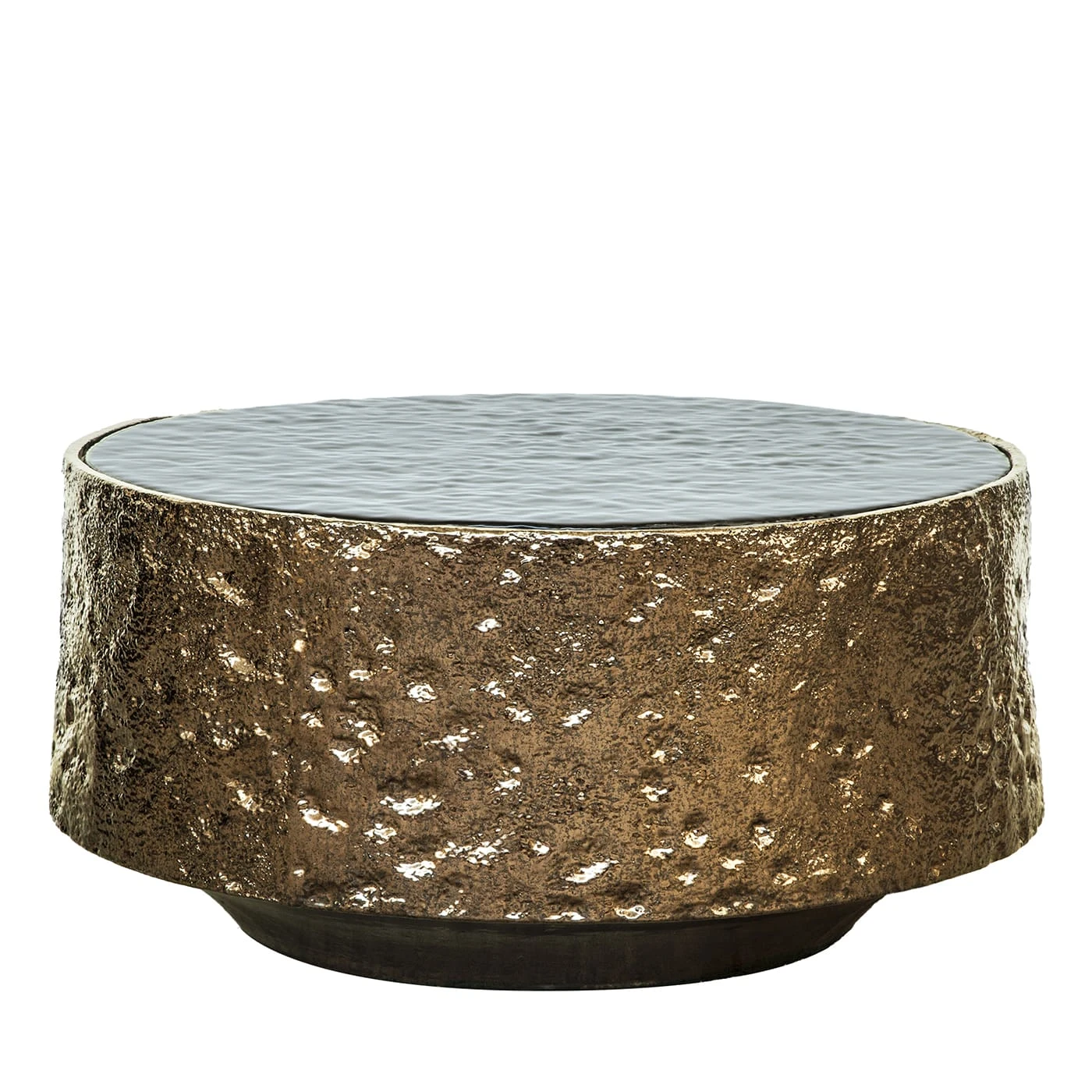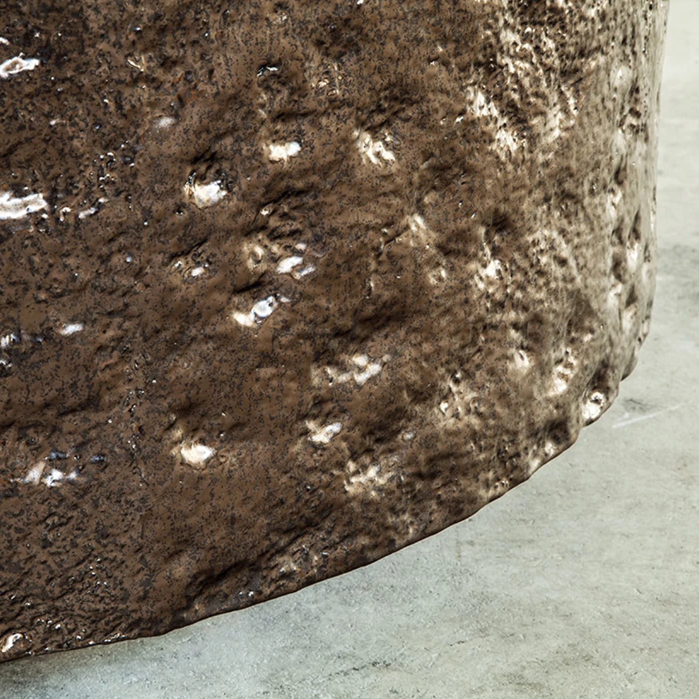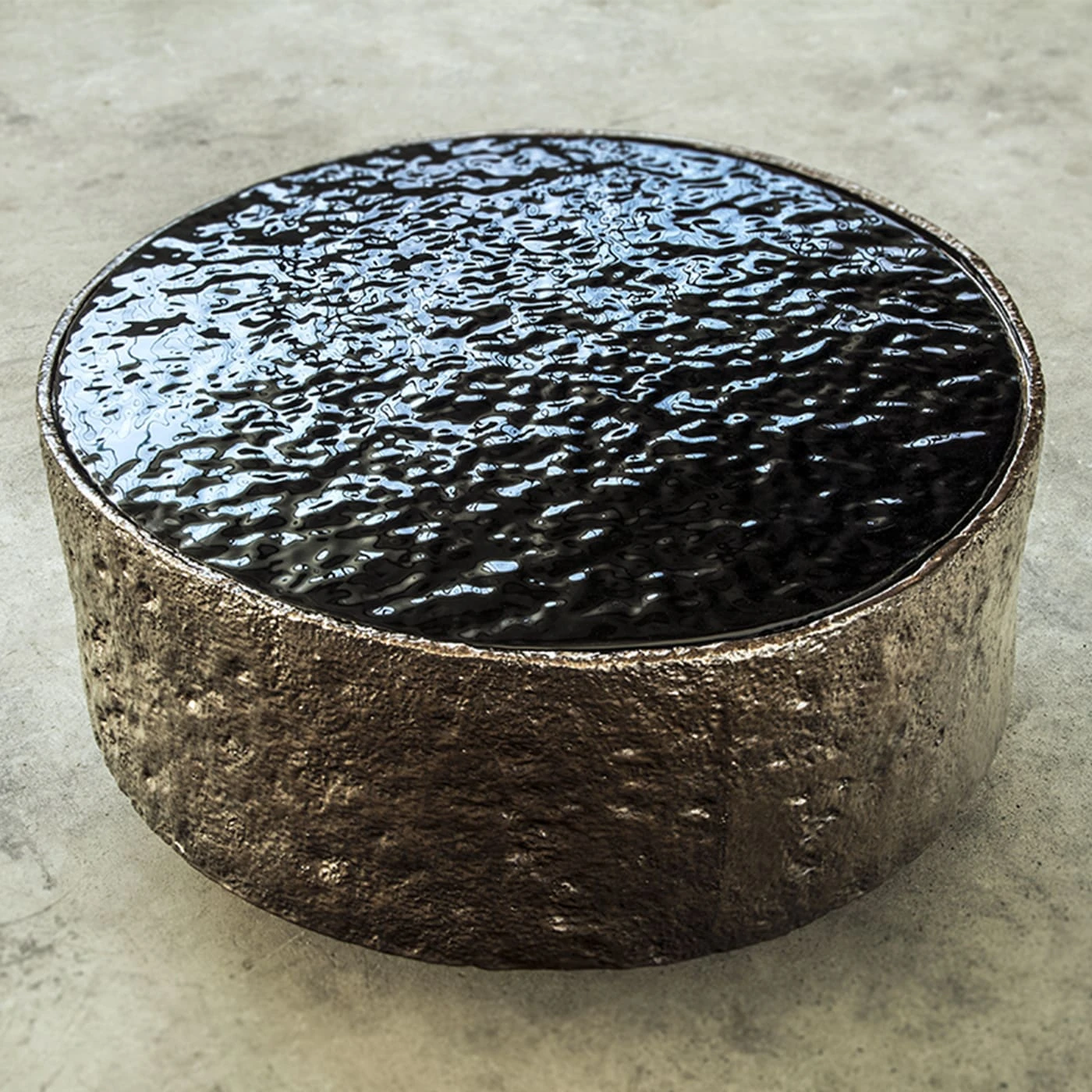Enticing naturalistic suggestions immediately come to mind when observing this one-of-a-kind coffee table. An irregular hammered texture characterizes the sturdy terracotta body that, decorated with a glossy bronze enamel, lends the surface a stunning dewy look. A sophisticated effect also accents the glass top, where the air bubbles trapped within make the surface look like slightly rippled water.