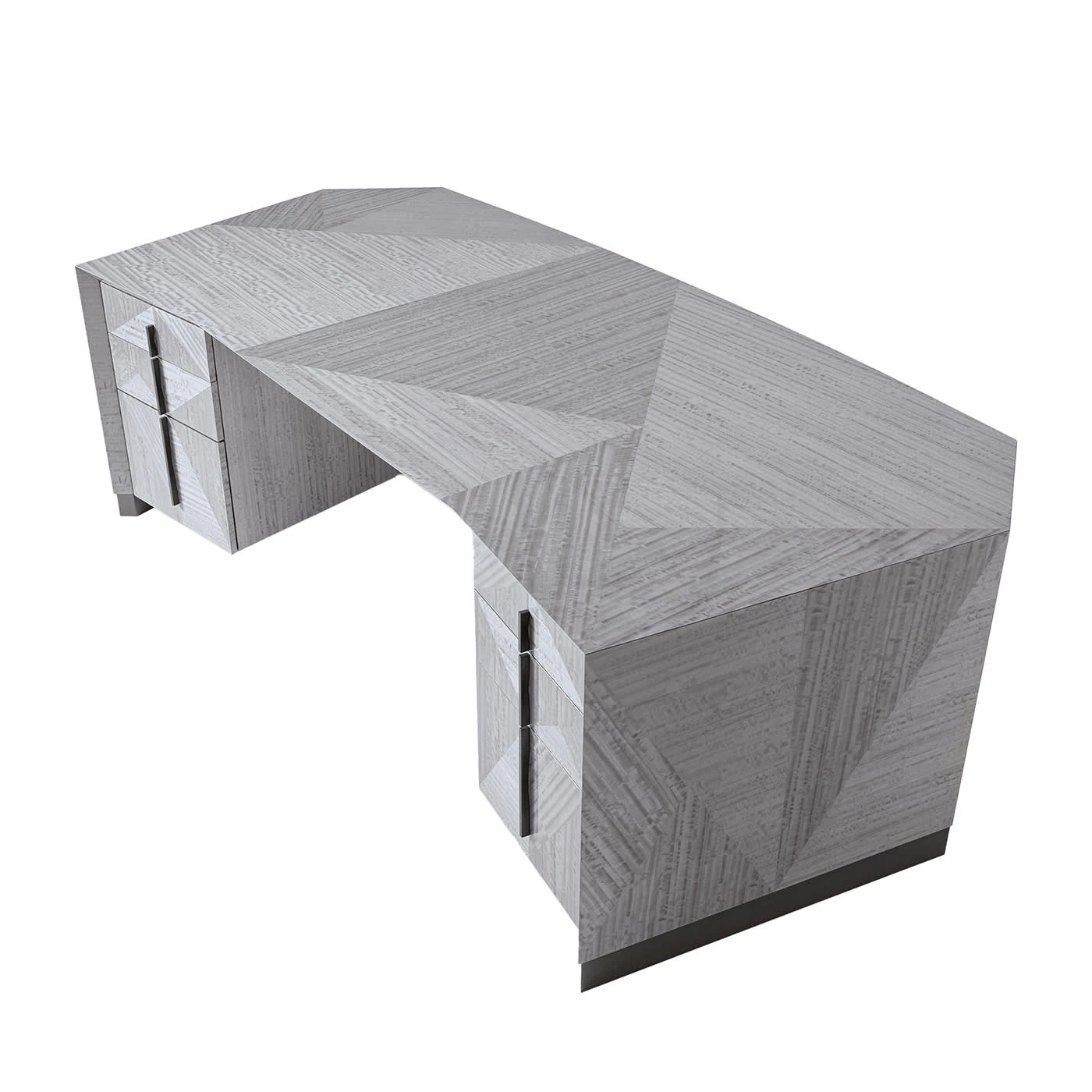 A small desk in inlaid Tasmanian curly Eucalyptus veneer with high gloss polyester finish. 2 full extension drawers with the bottom part in velvet fabric and 1 file drawer on each side. Base and handles in satin grey nickel stainless steel.