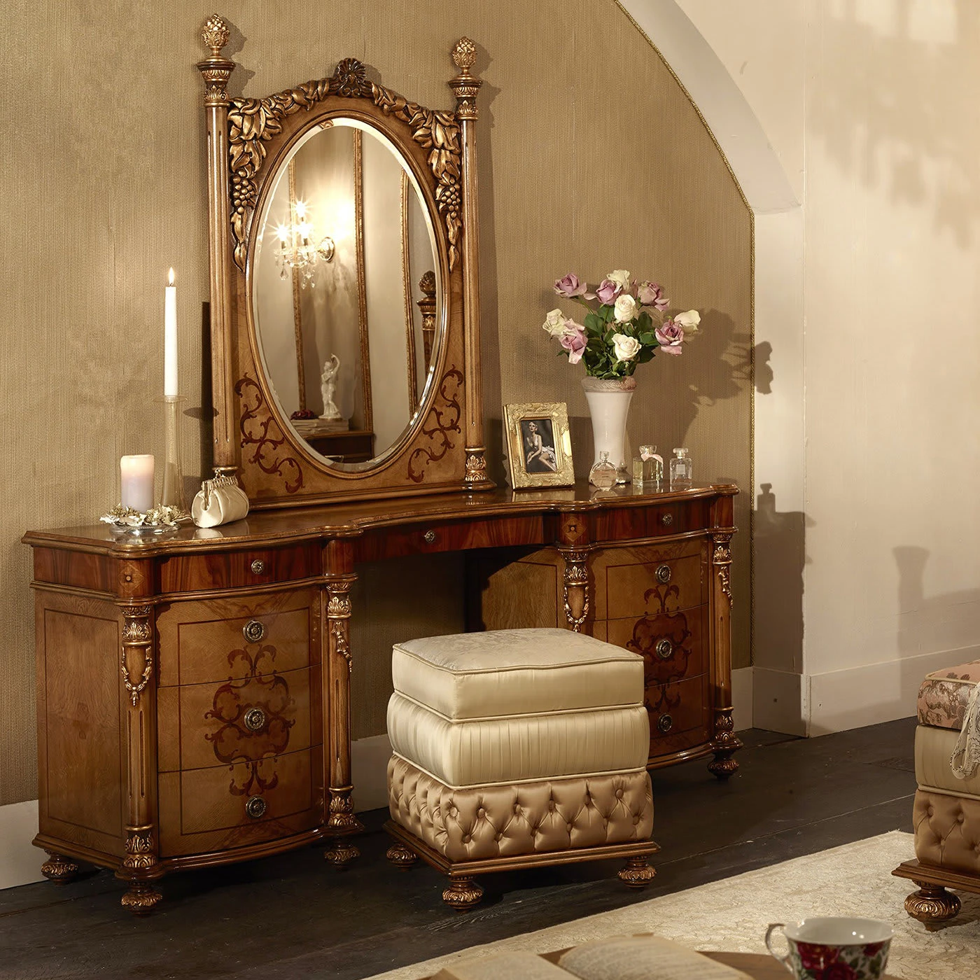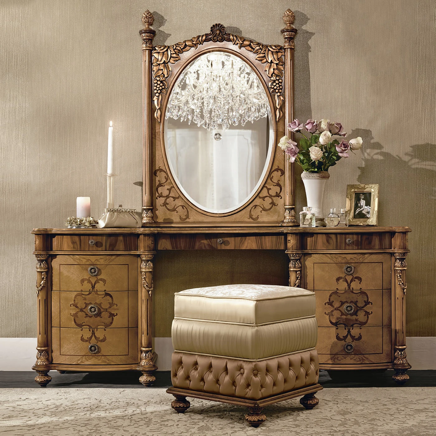 The distinctly classic inspiration of this vanity desk is evident in its bold and ornate silhouette crafted employing prized woods. Its sturdy wooden structure – providing nine drawers for storing make-up and skin-care favorites – boasts fine inlays in rosewood, feathered ash, and walnut briar that impeccably harmonize with the luminous carved elements coated with glistening gold leaf.
