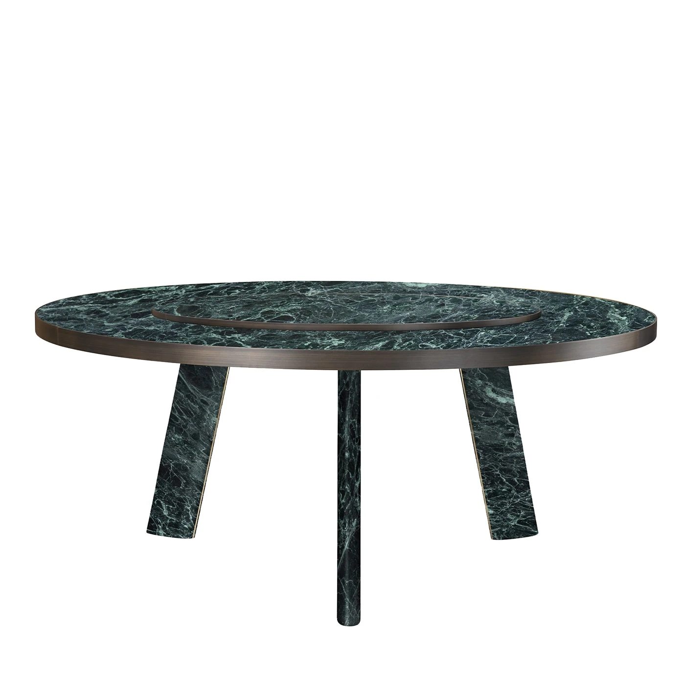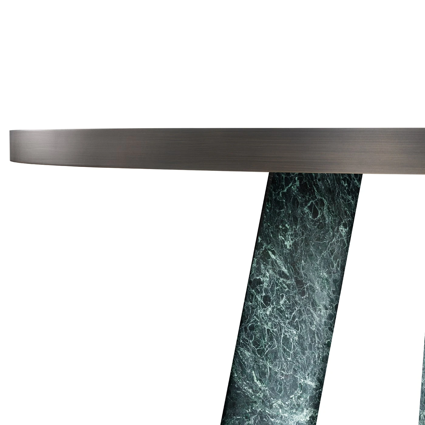 This exquisite dining table is an exercise in bold geometric volumes, their clean aesthetic functional to emphasize the beauty of Verde Alpi marble. The natural stone is seductive in its unpredictable tracery and shades that make each table entirely unique, surprising at every glance. Three slanted slabs sustain the thick, circular top where breakfasts, lunches, and dinners will be served against a precious backdrop.