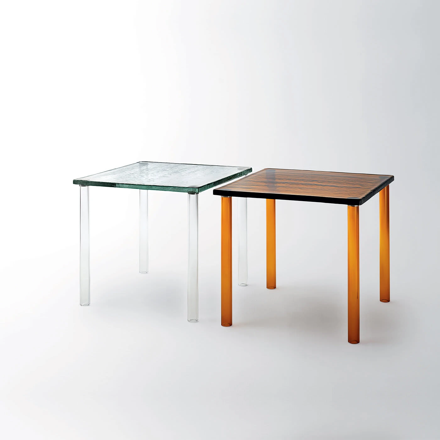 Minimalist and charming, the Nesting Collection of Murano glass tables designed by Ronan & Erwan Bouroullec boast an exquisite top of extremely thick poured glass supported by slender cylindrical legs in blown glass attached to the top with stainless steel plates. Featured in amber, this side table is also available in transparent glass and in a low version of 34-cm height.