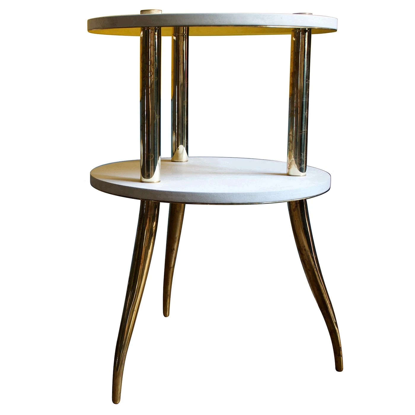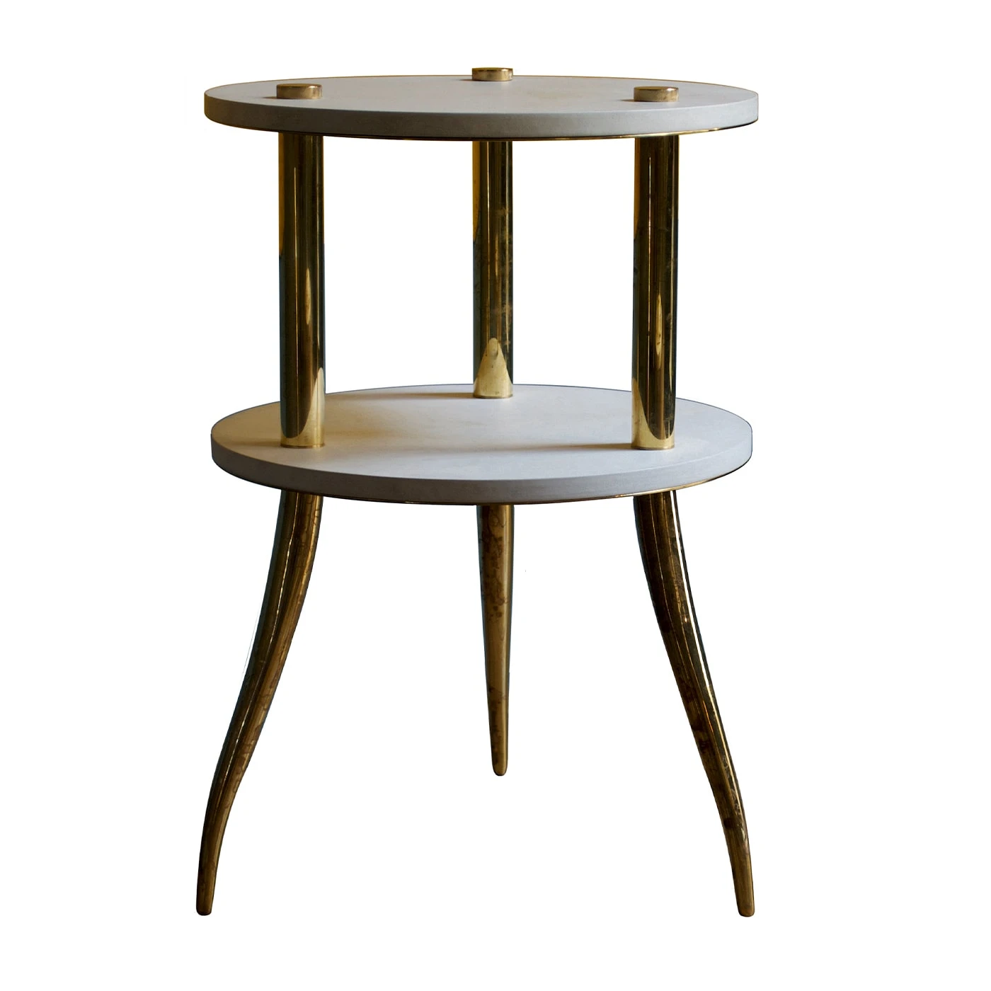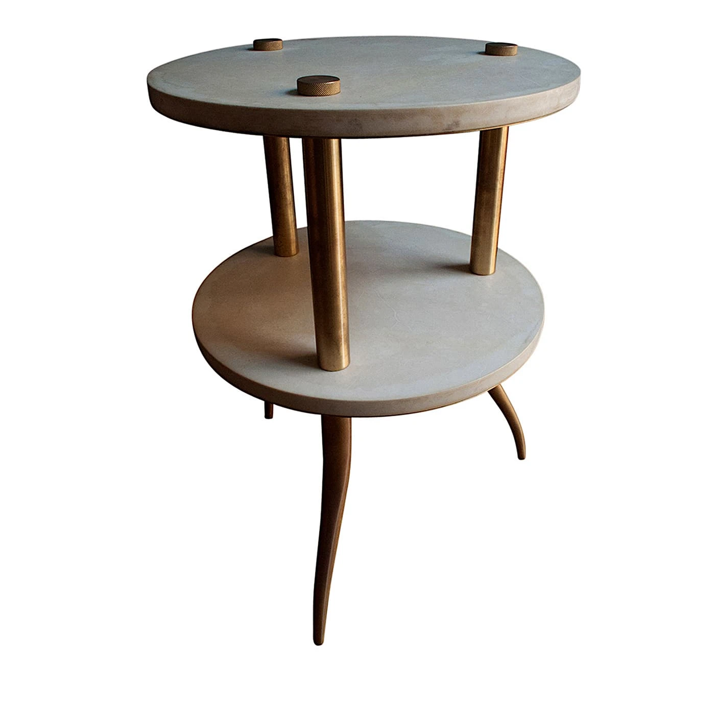 Soft light hues of parchment leather lend a retro charm to this modular étagère table by NB Milano. This piece of furniture features natural brass feet and columns supporting 2 circular shelves, made of poplar marine plywood upholstered with leather and polished with beeswax by Italian master carpenters.