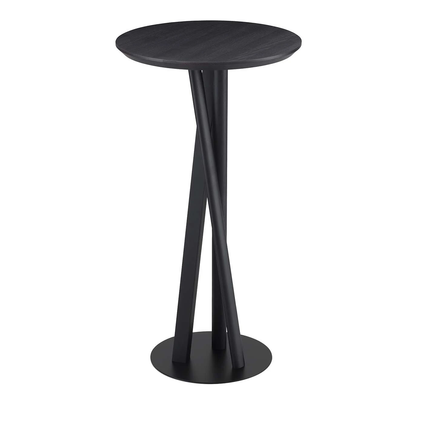 An unconventional design by architect and designer Massimo Broglio, this tall side table will be perfect to enjoy a drink or snack in a lounge or private study. Boasting a total-black look, it combines ash wood and metal in a striking silhouette composed of three crisscrossed legs featuring different geometric shapes (round, oval, and squared). Eclectic and versatile, this design is completed by a round metal base and top. This side table is customizable in height and shape of the top, please ask the Concierge for additional details.