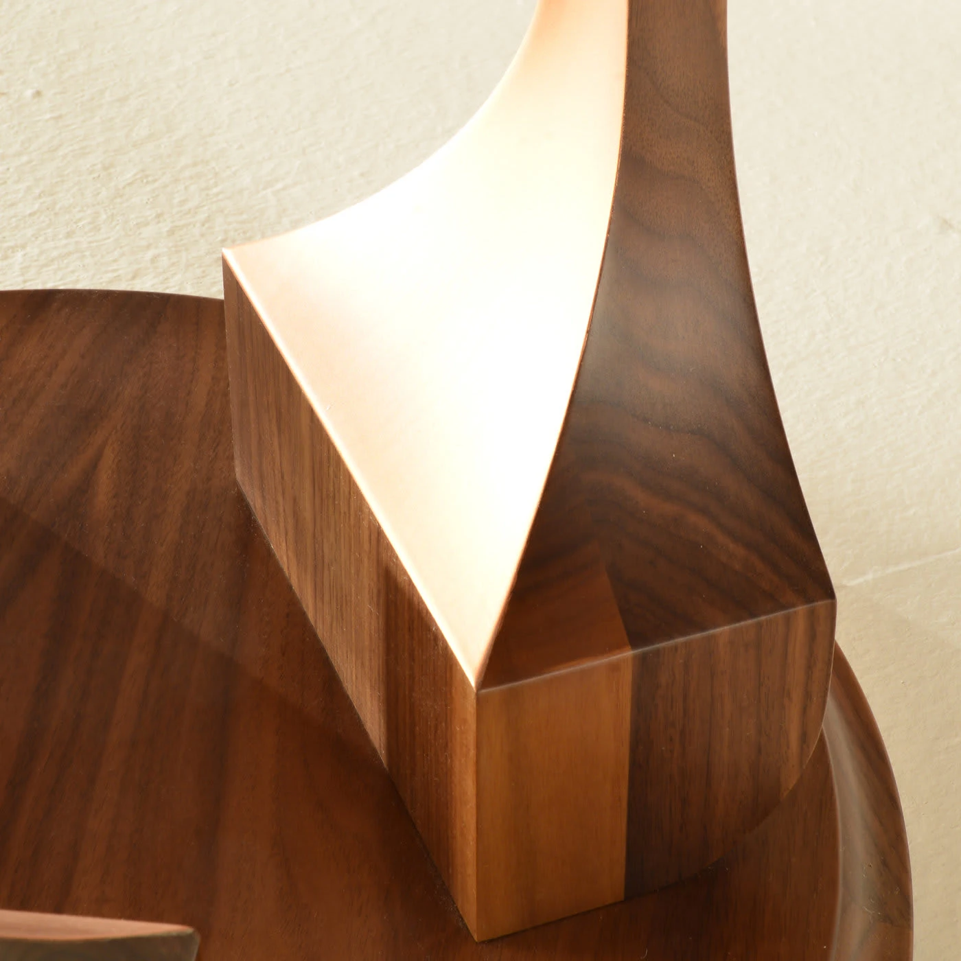 Handcrafted of black American walnut with a matte finish, the harmonious silhouette and contemporary design of this dining table will infuse elegance in both modern and classic interiors. The round top is supported by a distinctive base that captures the attention from all angles. Three slender legs crafted in a stylized spoon shape rise from a round platform, complete with rose gold metal inserts placed along the inside panel, reflecting on the dark finish of the wood. A symbol of quality, innovation, and style, this design brings an original accent to any interior decor.