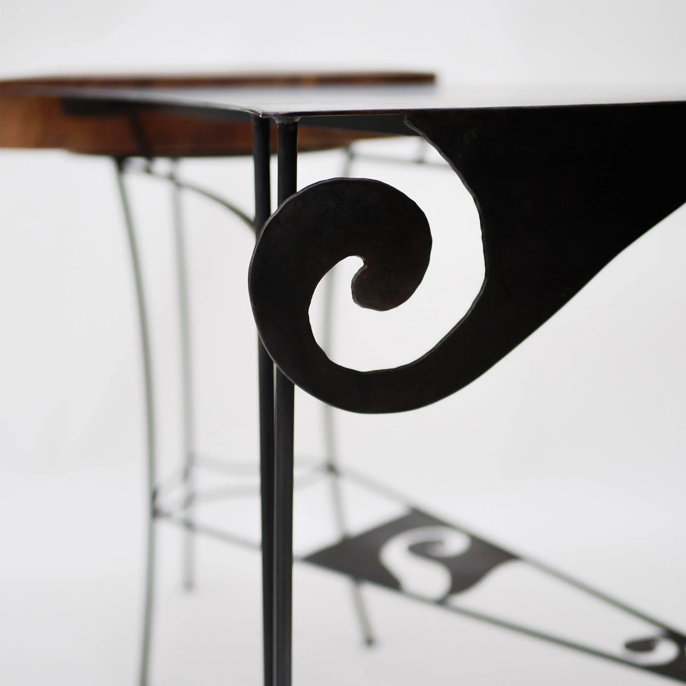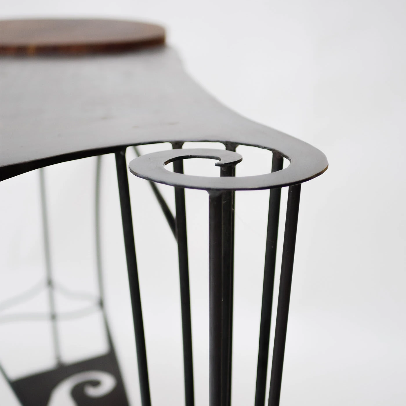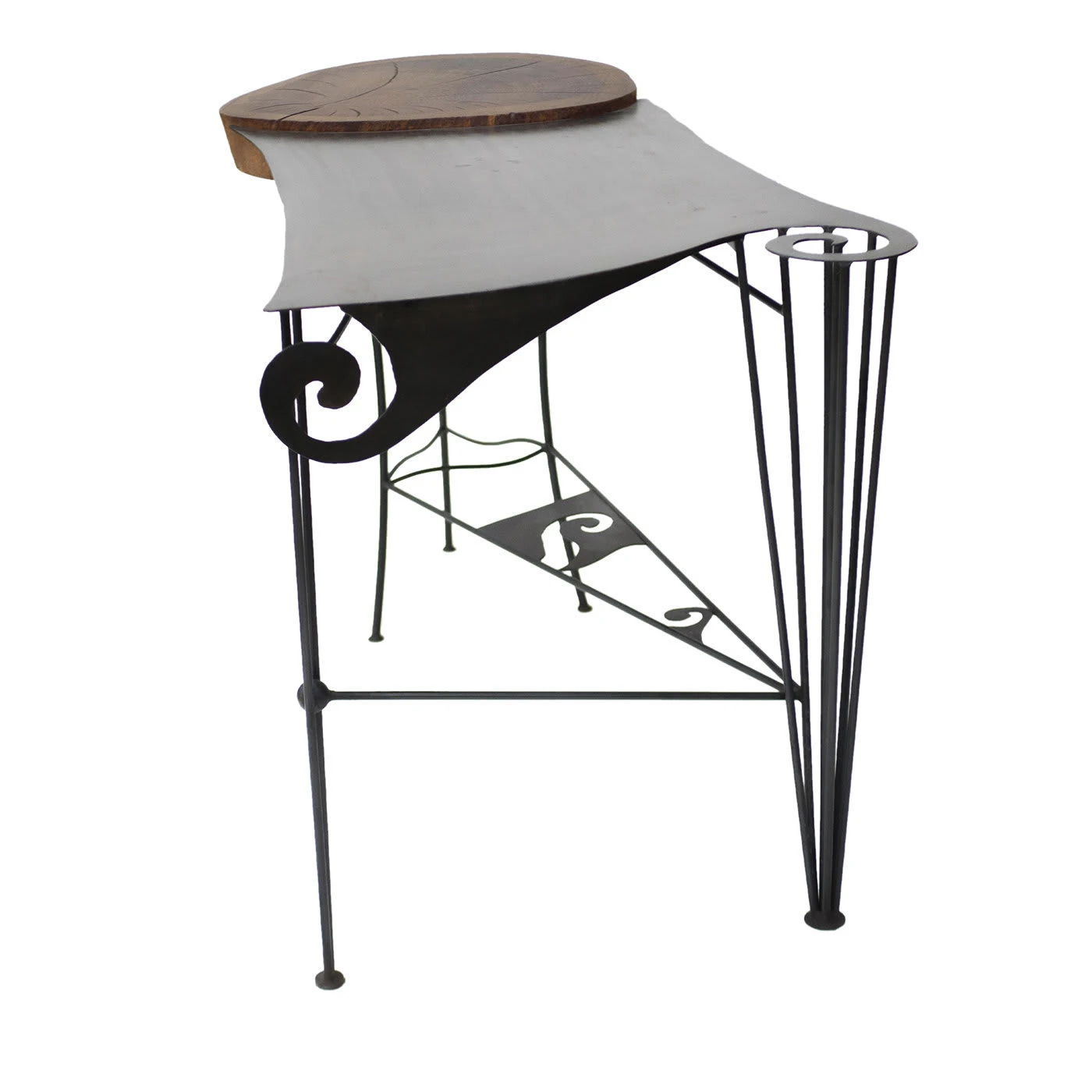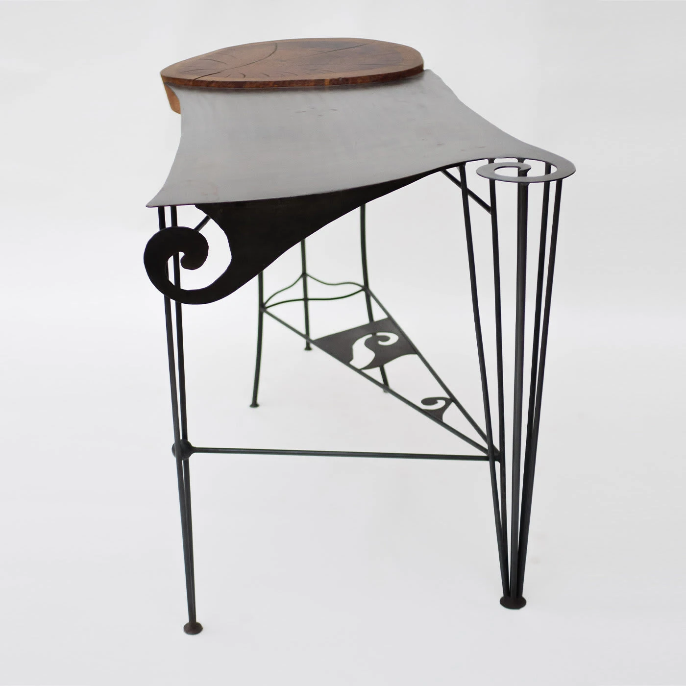 A splendid marriage between solid oak and wrought iron, this enchanting and sophisticated desk will make a refined statement in any private study or bedroom. The smooth curves and curled details enlivening the top and the stretcher connecting the legs result perfectly harmonizing with the thick, round insert in solid oak. The warmth of wood merges with the coolness of iron, giving birth to a minutely handcrafted design exuding harmony and elegance.