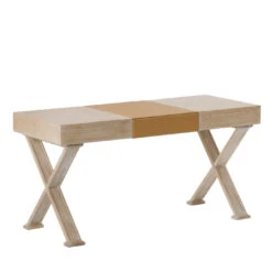 Exuding an understated elegance, this elegant desk is crafted from natural oak with a pickled finish. Supported by modern X-shaped legs, its spacious top is equipped with a genuine leather hand pad and matching drawers with contrast top-stitching. A sophisticated yet functional addition to any contemporary home office or study.