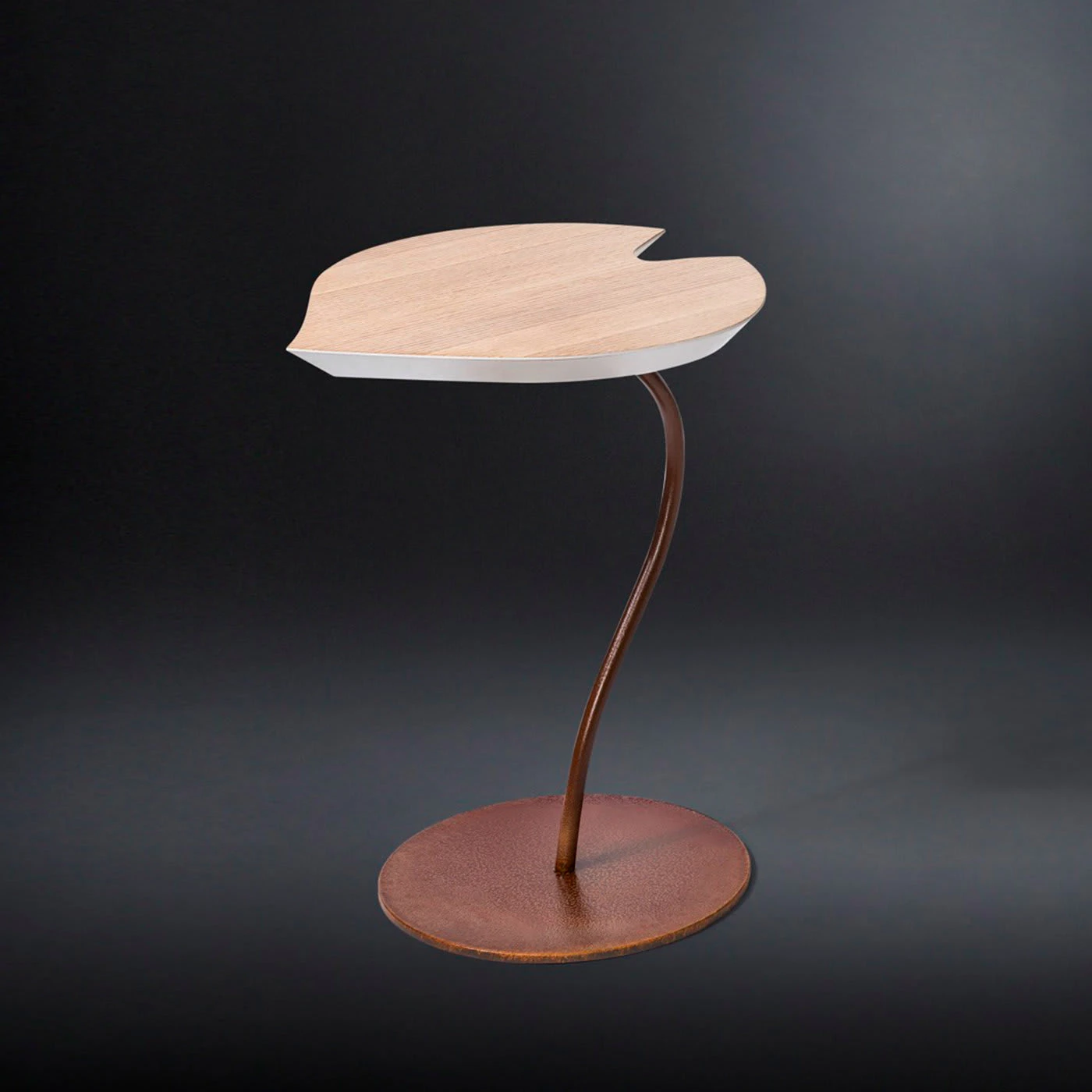 Poetically interpreting the simple elegance of nature, this side table is a delicate addition to both modern and classic interiors. Its top is shaped like a leaf and crafted of MDF with a white oak finish. The support is a curved iron rod stemming from a round iron base, both lacquered to give them an organic effect that resembles Corten. This piece is available in other finishes, please contact the Concierge for other options and details.