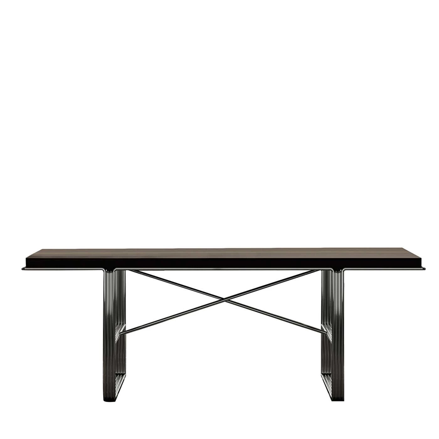 This long, rectangular wood and metal modern table is as much a decorative piece as it is a functional table. Fantastic contemporary design is seen in this piece, which has a chrome steel rod frame with two sections that cross in the middle and act as a support for the eucalyptus wood table top in a dark matte finish.