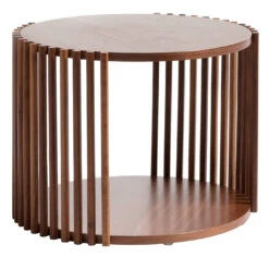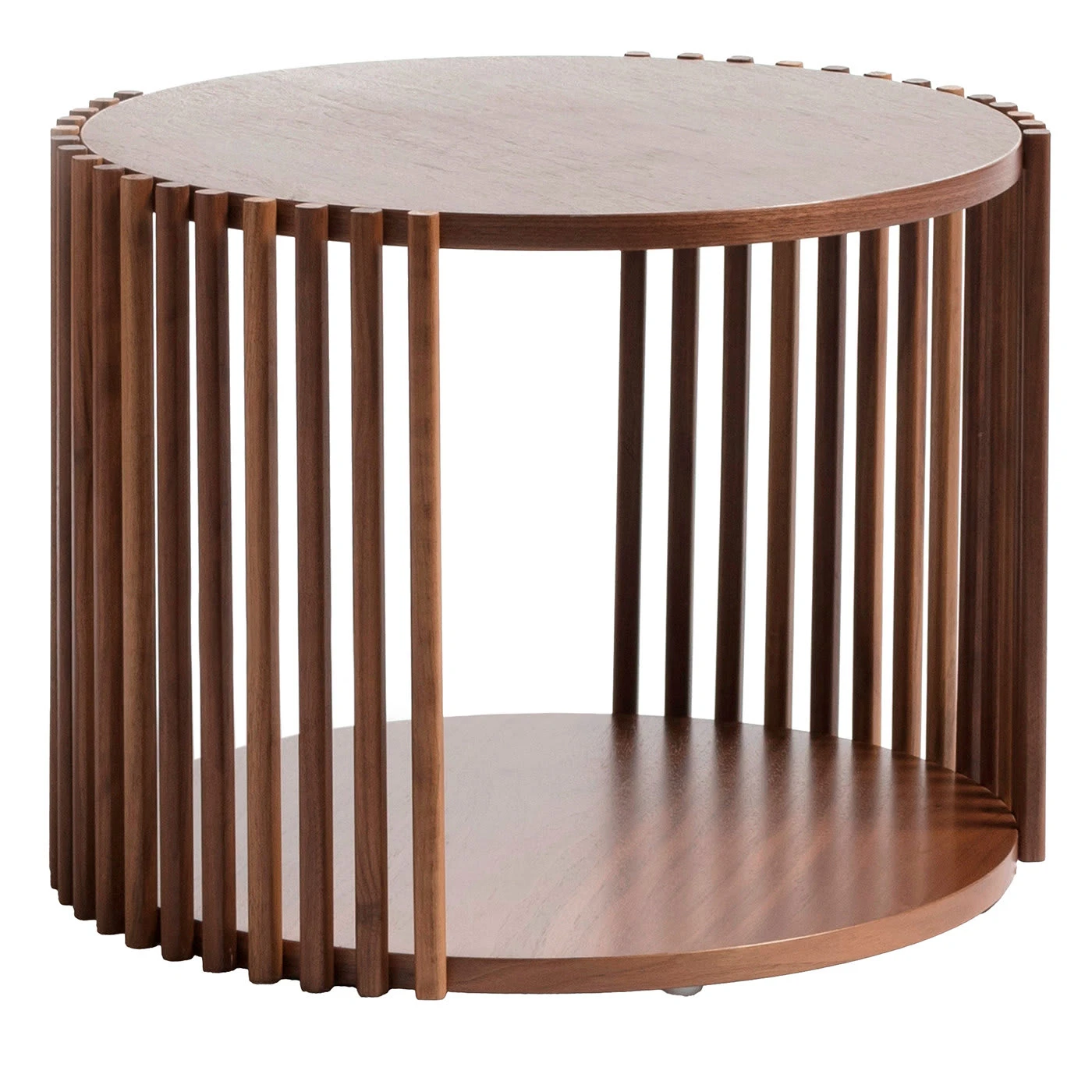 The utterly elegant profile of this coffee table makes it a superb addition to modern decors, where it will easily blend thanks to its pure volumes. The lower and upper wooden tops veneered in walnut with the same perimeter are connected through the vertical ensembles of parallel slats in Canaletto walnut, which lend the design a subtle sculptural effect. The piece is available in lacquered wood or durmast, please inquire with the Concierge for details and pricing.