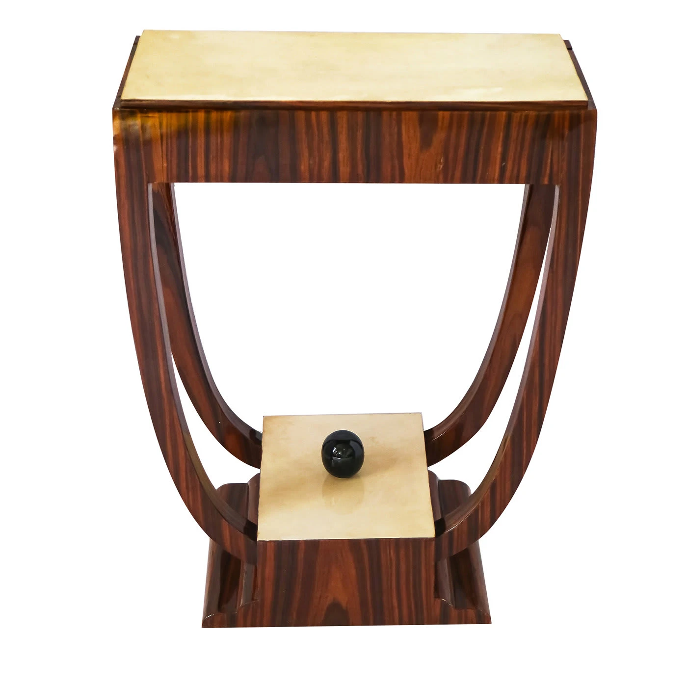 This marvelous side table is an eclectic design of Art Deco inspiration, comprised of a striking variety of sleek shapes, charming shades, and practical features. Made of fir wood, the structure is veneered with precious rosewood, while the top and the bottom shelf are covered with natural parchment. The latter is also adorned with a fascinating, polished black-lacquered sphere in beechwood, adding geometric allure to its elegant design. The top features two side drawers.