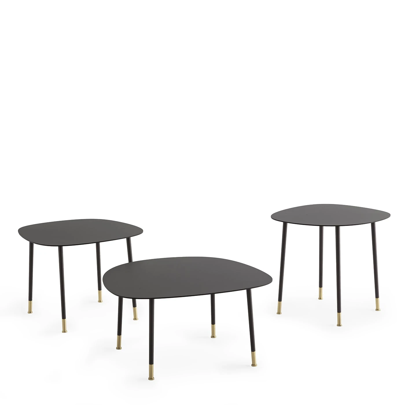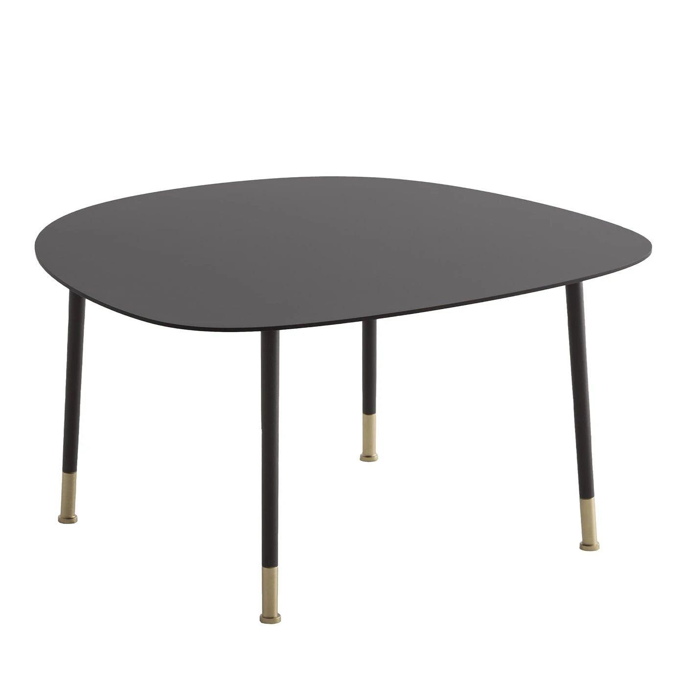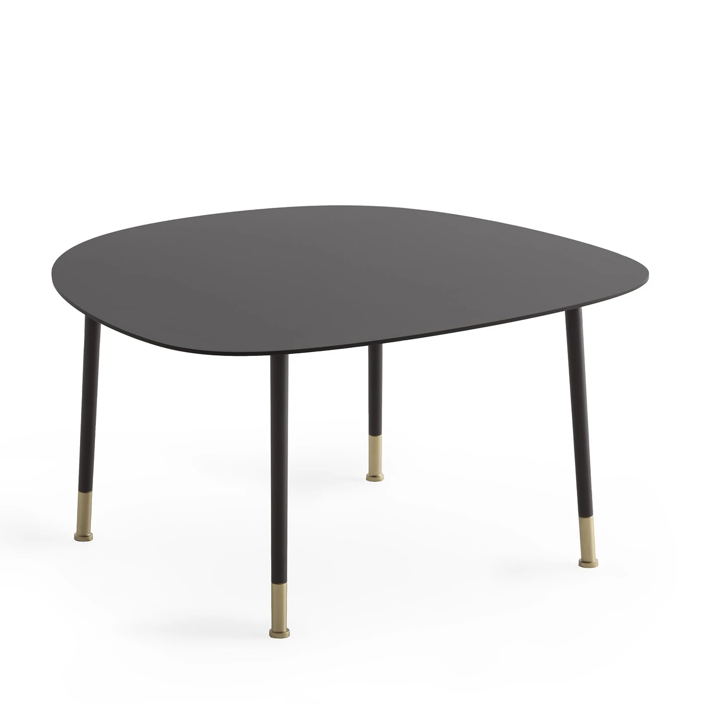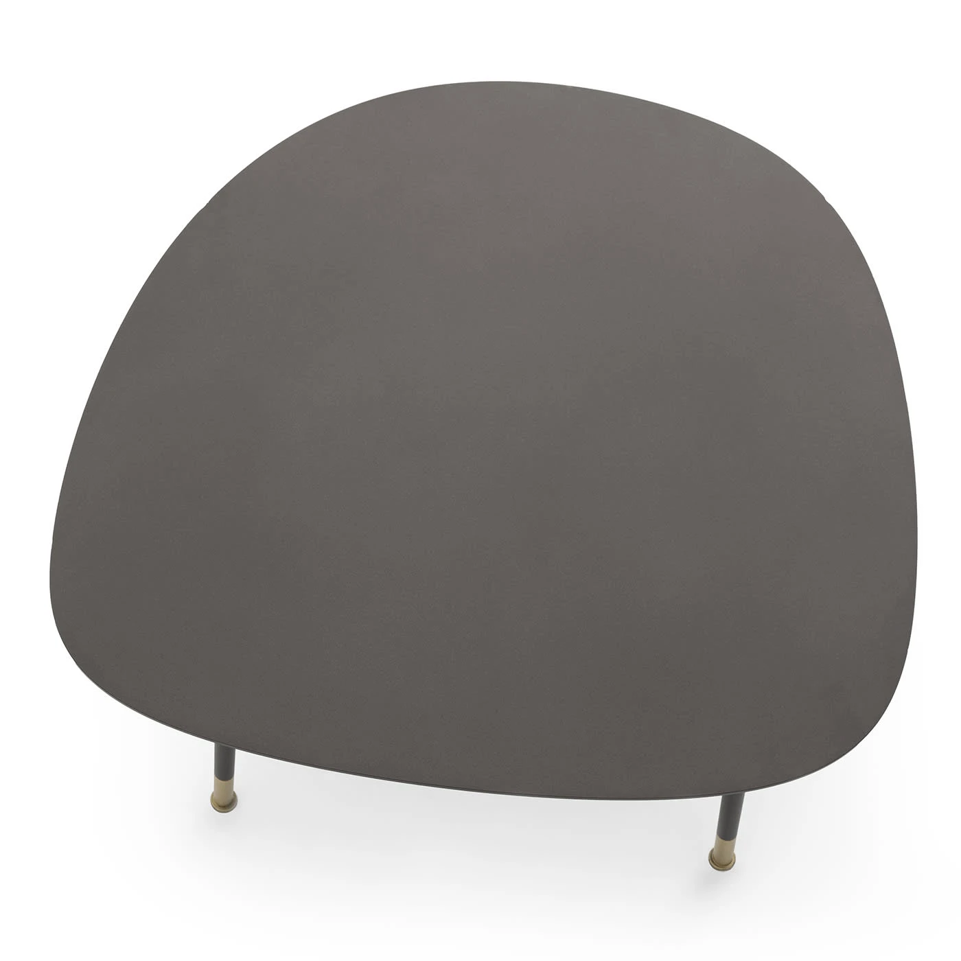 Ironically shaped to hint at a pebble, the top sealing this coffee table is its distinctive element, where the harmony of curves interacts with the quiet elegance of its burnished look. Brushed brass tips accent the sleek cylindrical legs, which share with the rest of the frame the same elegant epoxy-powder-varnished finish. Two smaller options are available in the Artemest catalog.