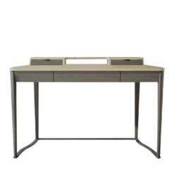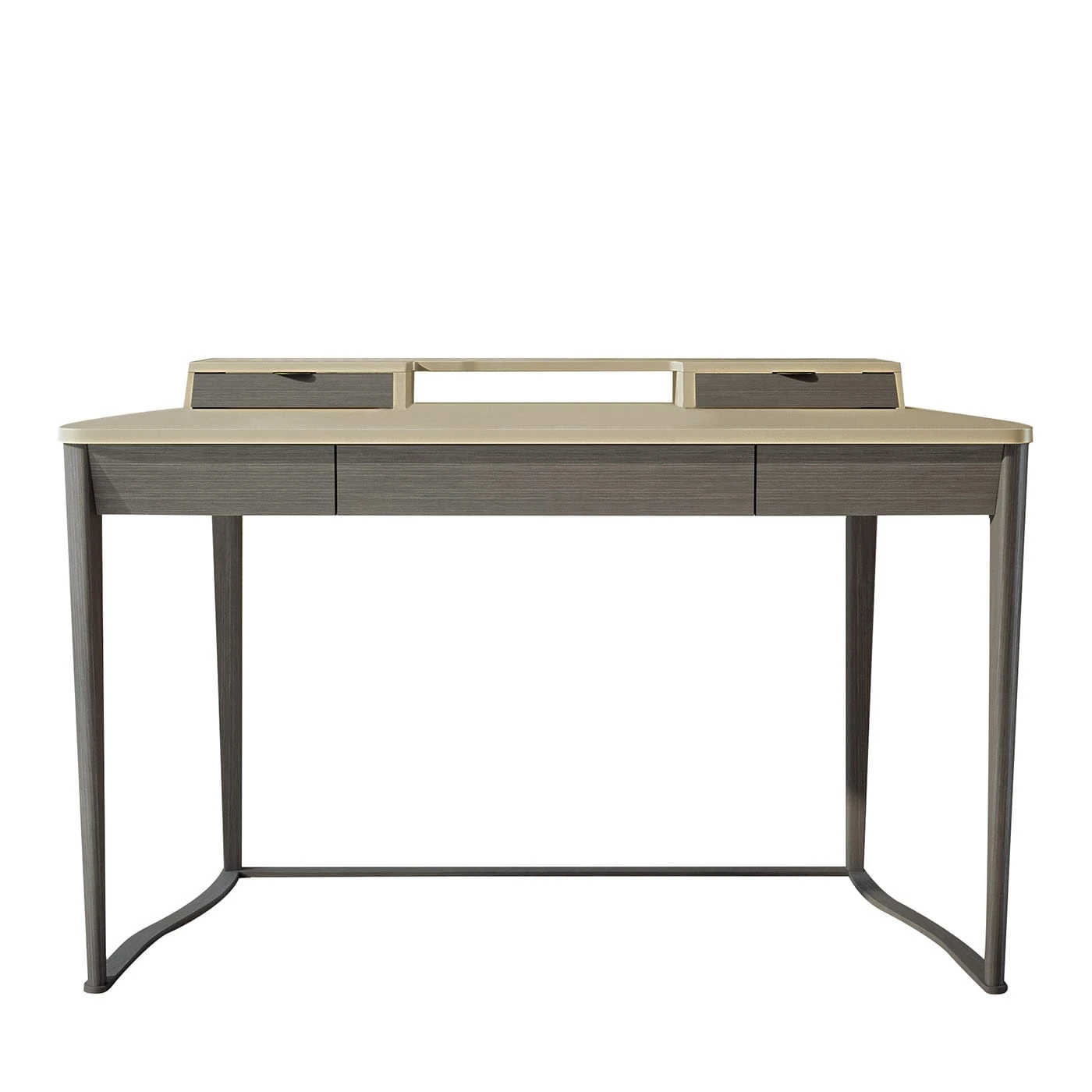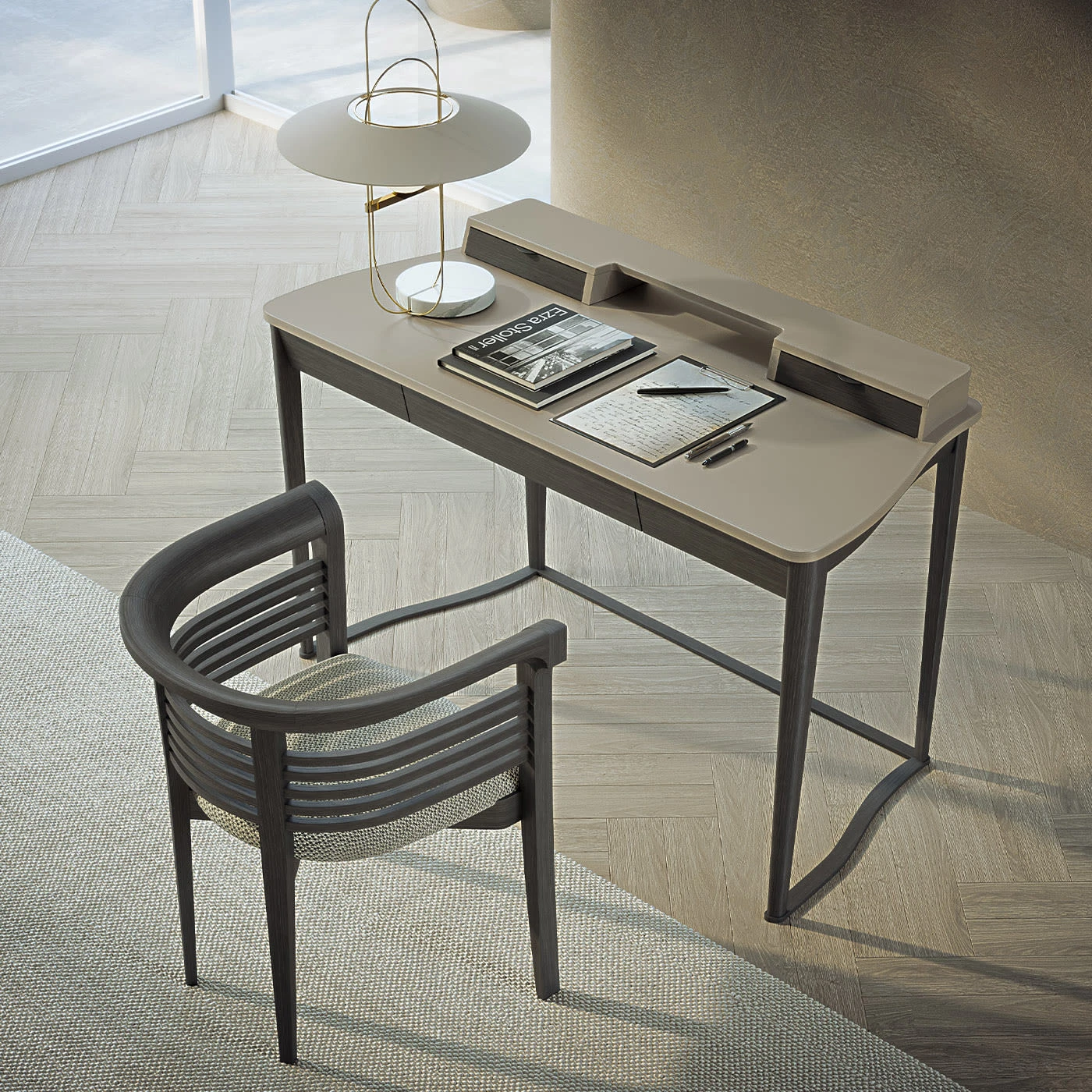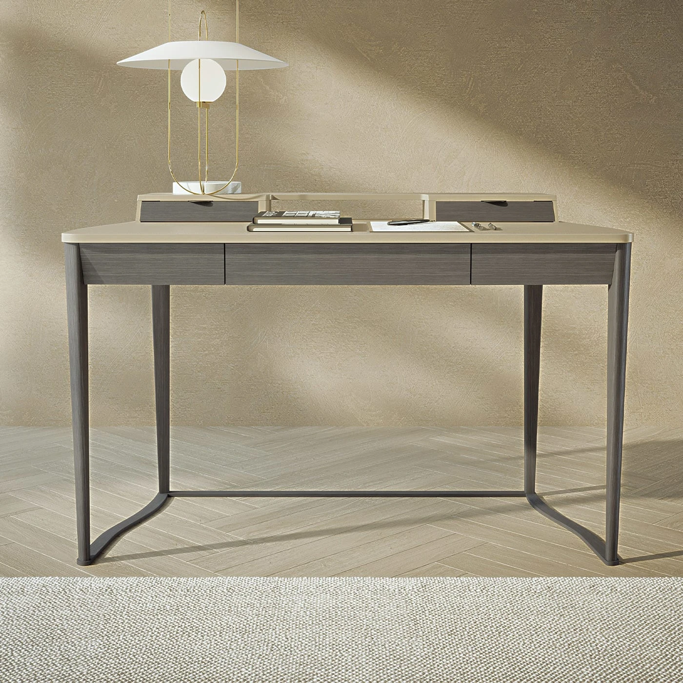 Writing desk in Canaletto walnut with large drawer with push and pull mechanism and small drawers with metal handle in the upper part. Legs in solid wood in Canaletto walnut tone. Top covered in leather, available in different colors. Also available in the dark Tay version.