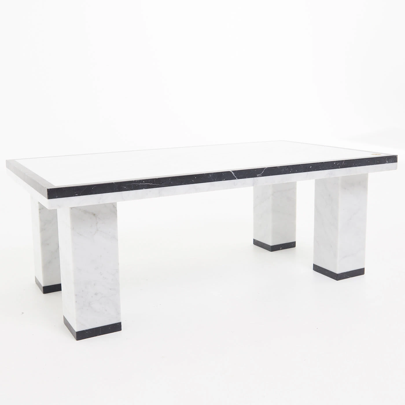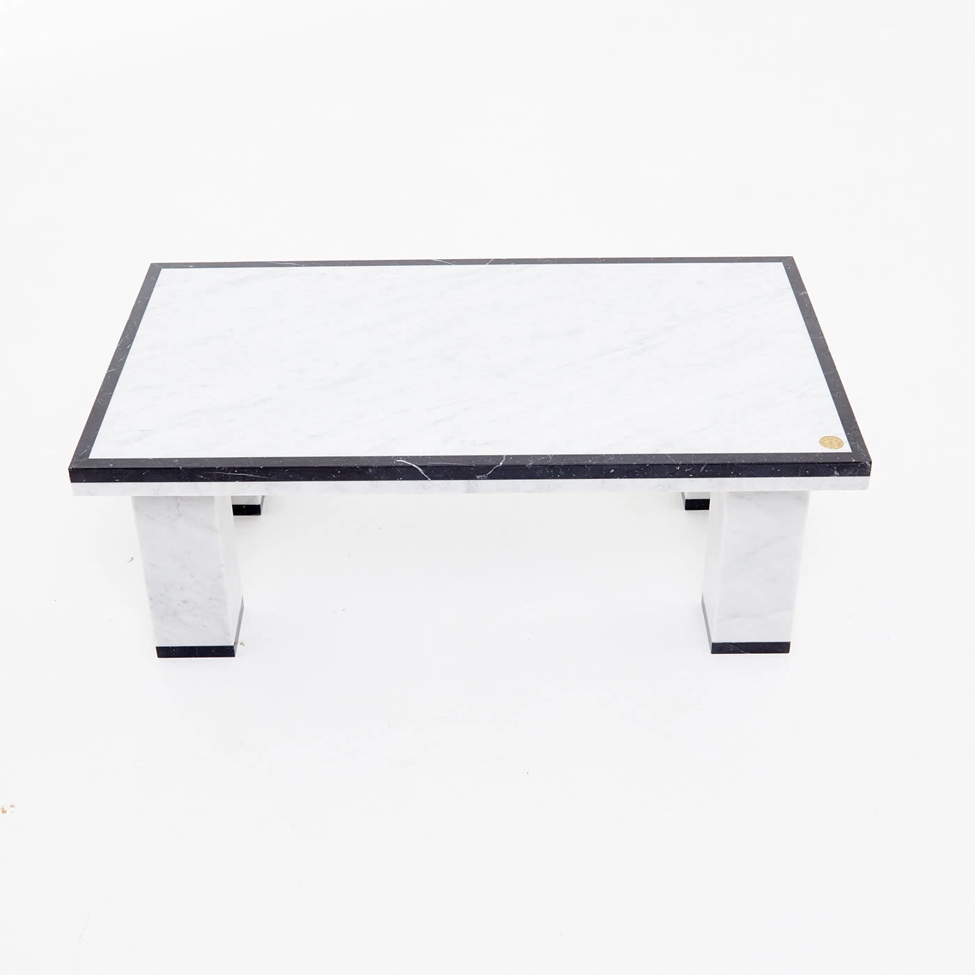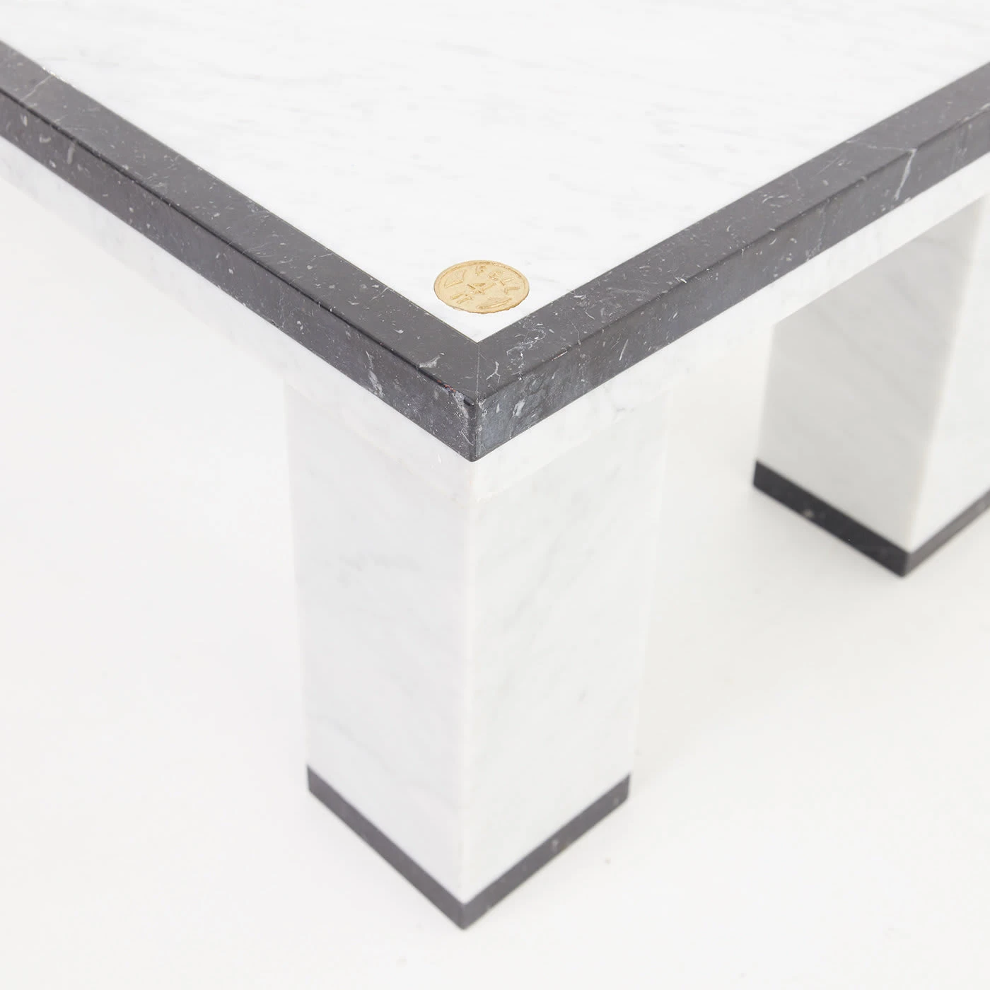 This impressive coffee table is made from white Carrara marble with delicately colored veins, while the edges of the table and its thick, rectangular legs are wrapped in a striking elegant Nero Marquina trim. This minimalist but imposing table is refined and will be a bold piece in any home or office space.