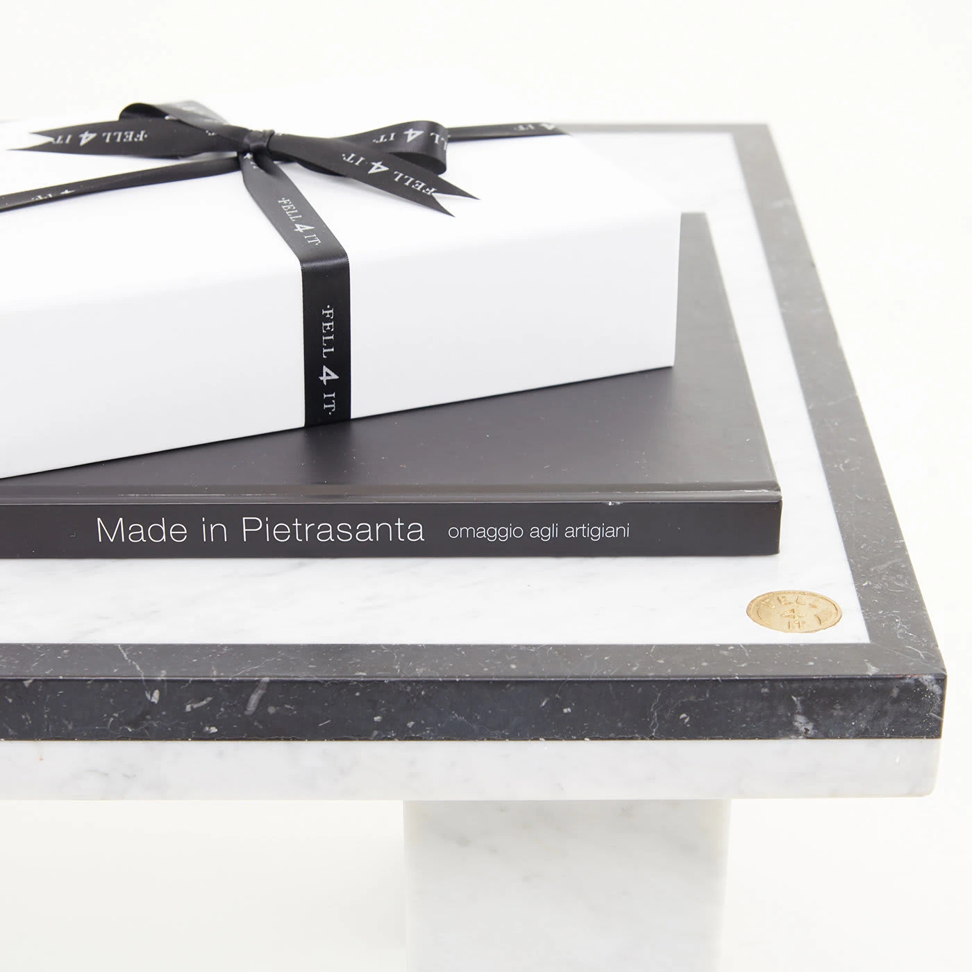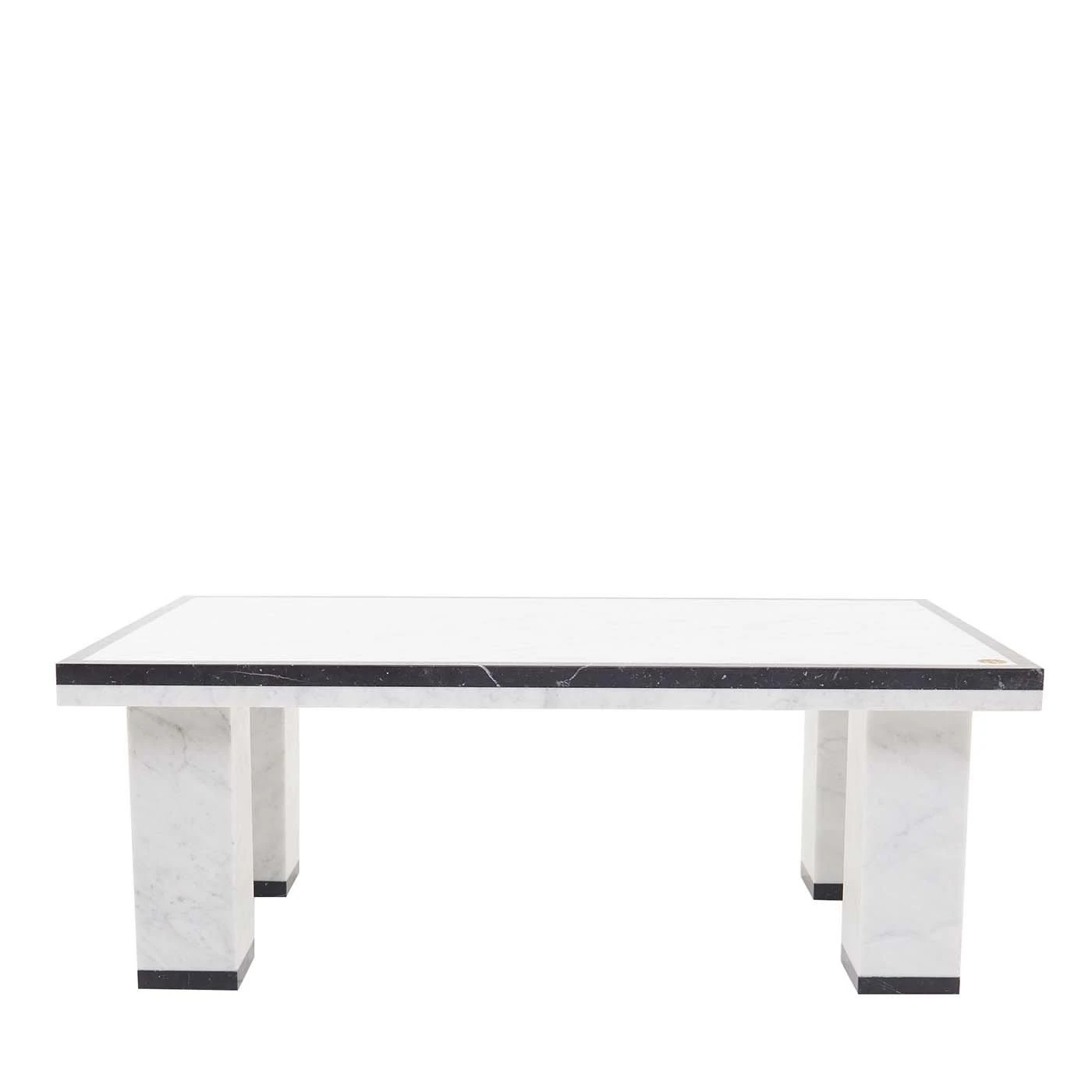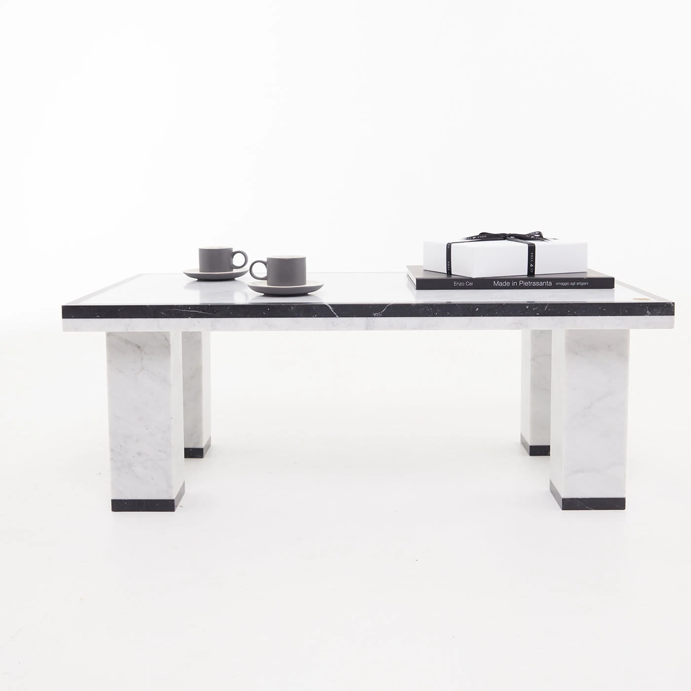 This impressive coffee table is made from white Carrara marble with delicately colored veins, while the edges of the table and its thick, rectangular legs are wrapped in a striking elegant Nero Marquina trim. This minimalist but imposing table is refined and will be a bold piece in any home or office space.
