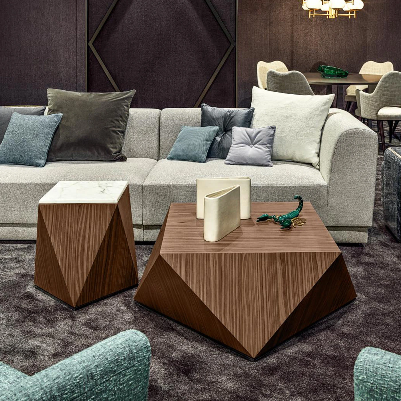 The geometry marks out the sculptural and essential aspect of this coffee table. The base is in black nickel finish. The support structure, in natural walnut, creates facets and plays on light. Piano Coffee Table Large can be coordinated with other items in the Piano collection, creating a play on different heights and scenic effects. Designed by Nava + Arosio.