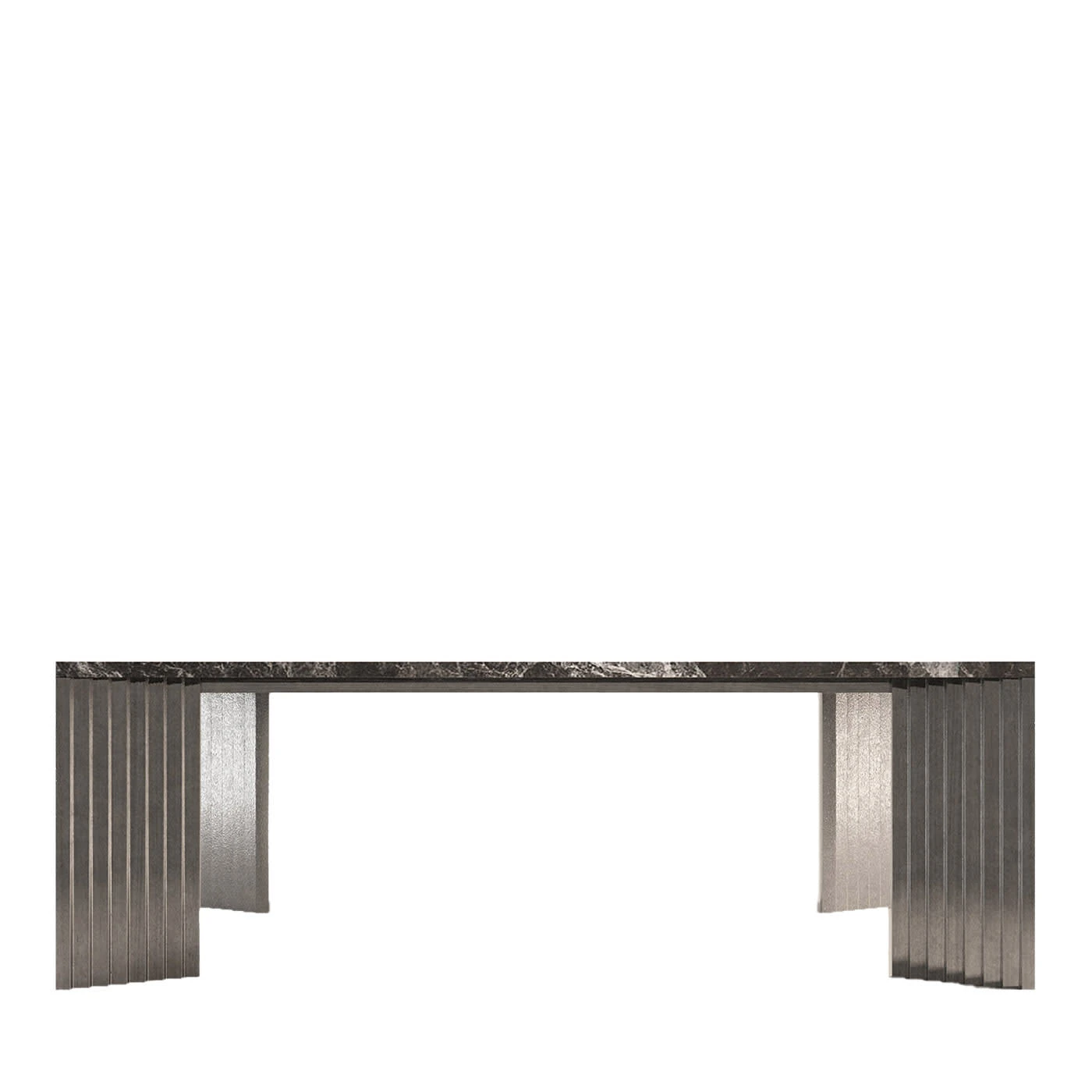 Born out of the desire to exploit the versatility of cast metal expressed through the thin stepped profiles of its bronze legs. Designed to appear differently from each angle, they appear once slender, then massive, as well as polished and rough. The top is in Emperador Grey, a marble that is quarried in Turkey. It presents with a grey background accented with darker gray patches and white smokey motions that give the stone a sophisticated look.