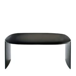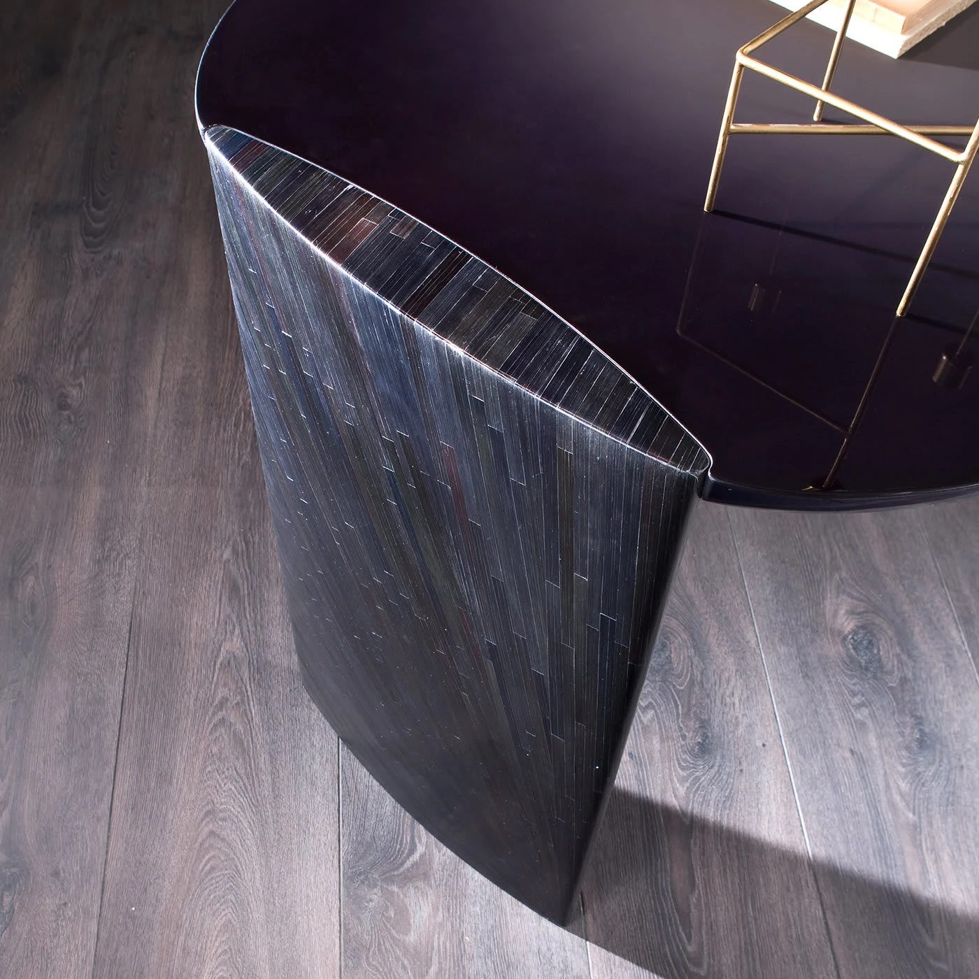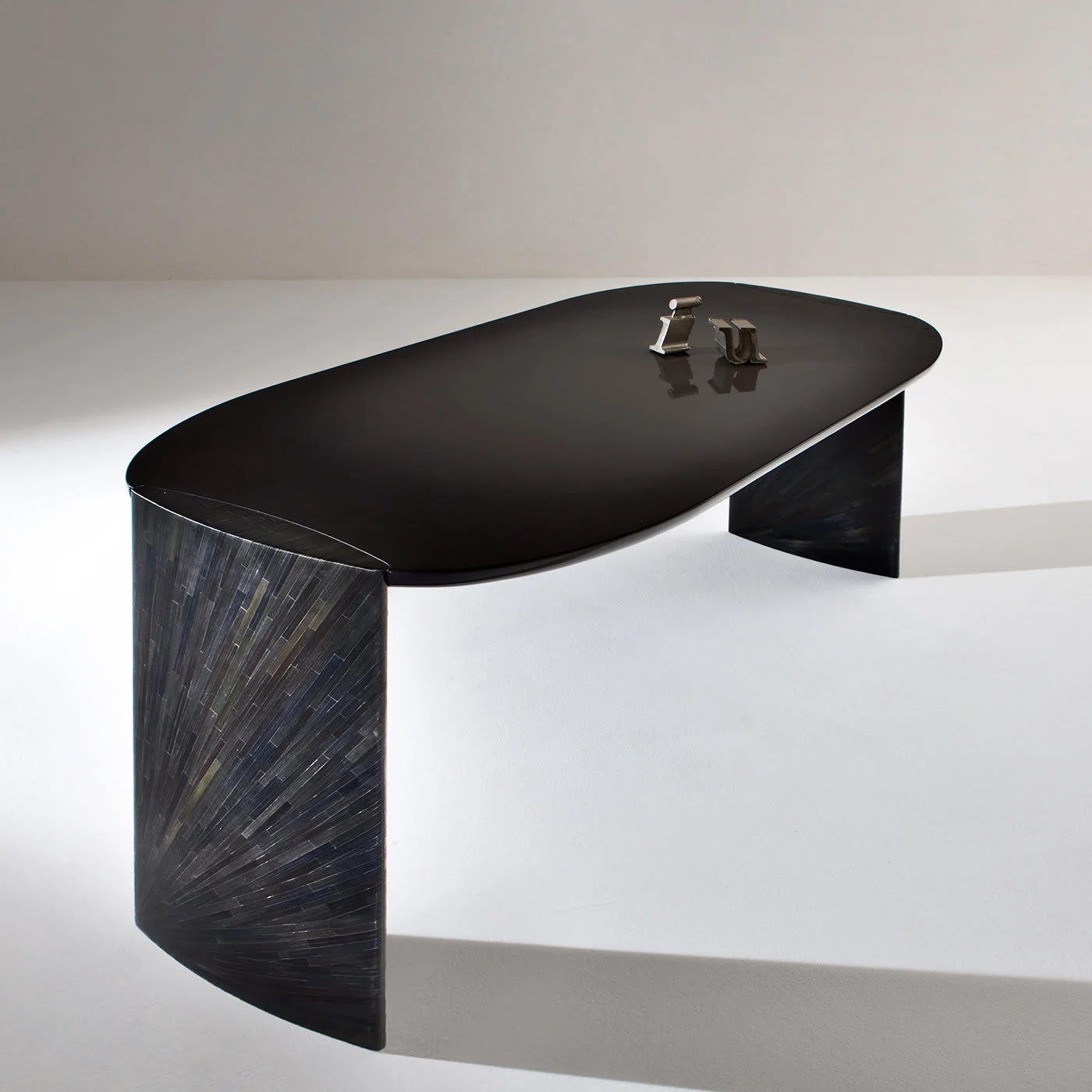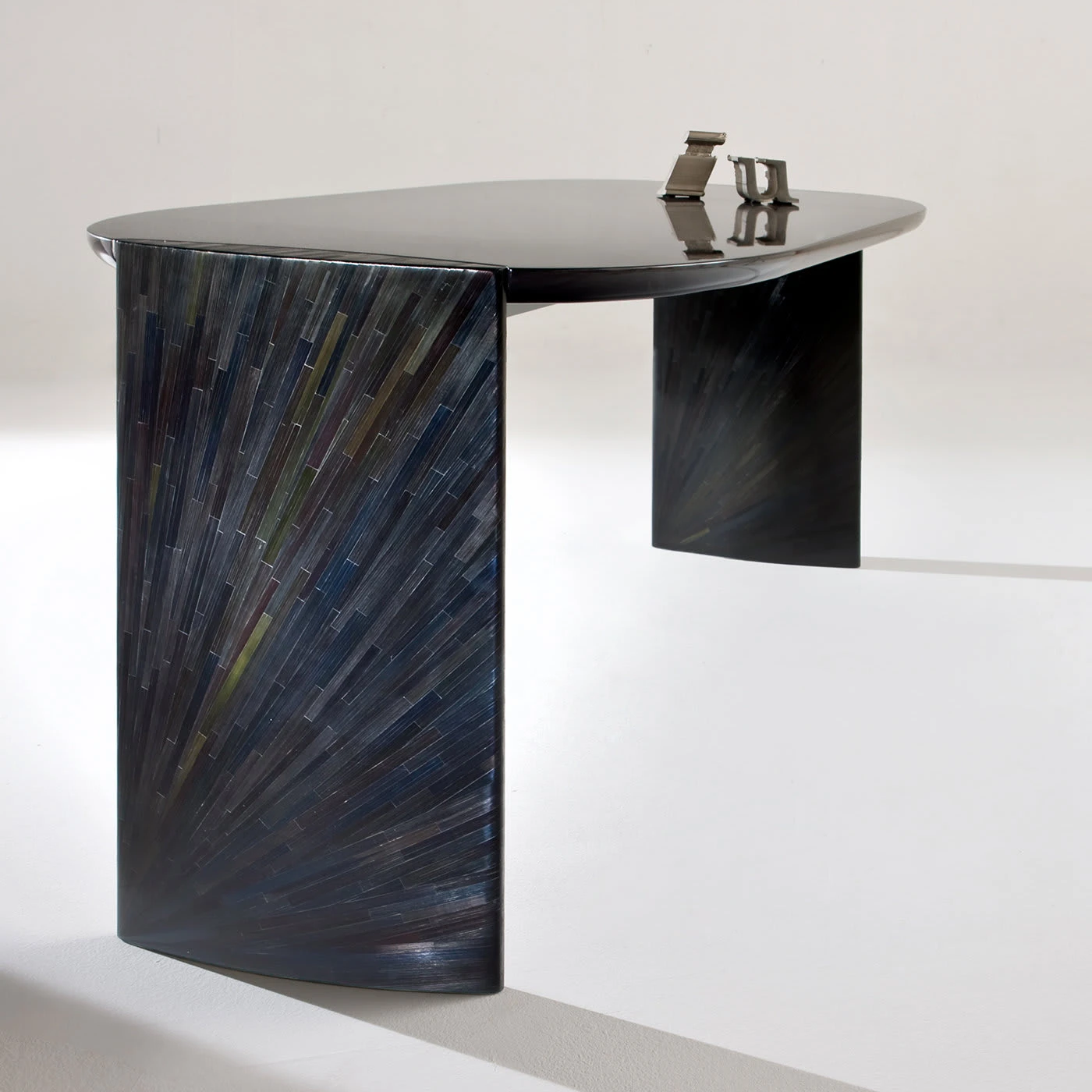Minimal and luxurious, this round desk is the ideal decor for a modern home. Fashioned of wood with a glossy shaded lacquer, the silhouette’s delicate curves of the irregular top boast a glossy shaded lacquer that strikingly contrasts with the linearity of the two solid legs in black rye straw. Placed in the center of a room or in a contemporary office to create a dynamic effect, this desk will exude sophistication and refined craftsmanship.