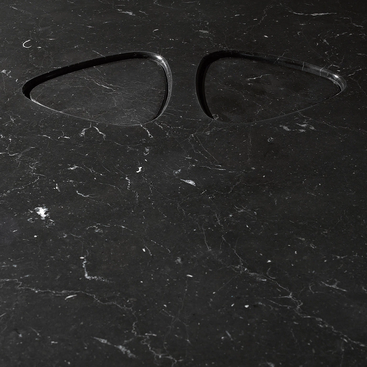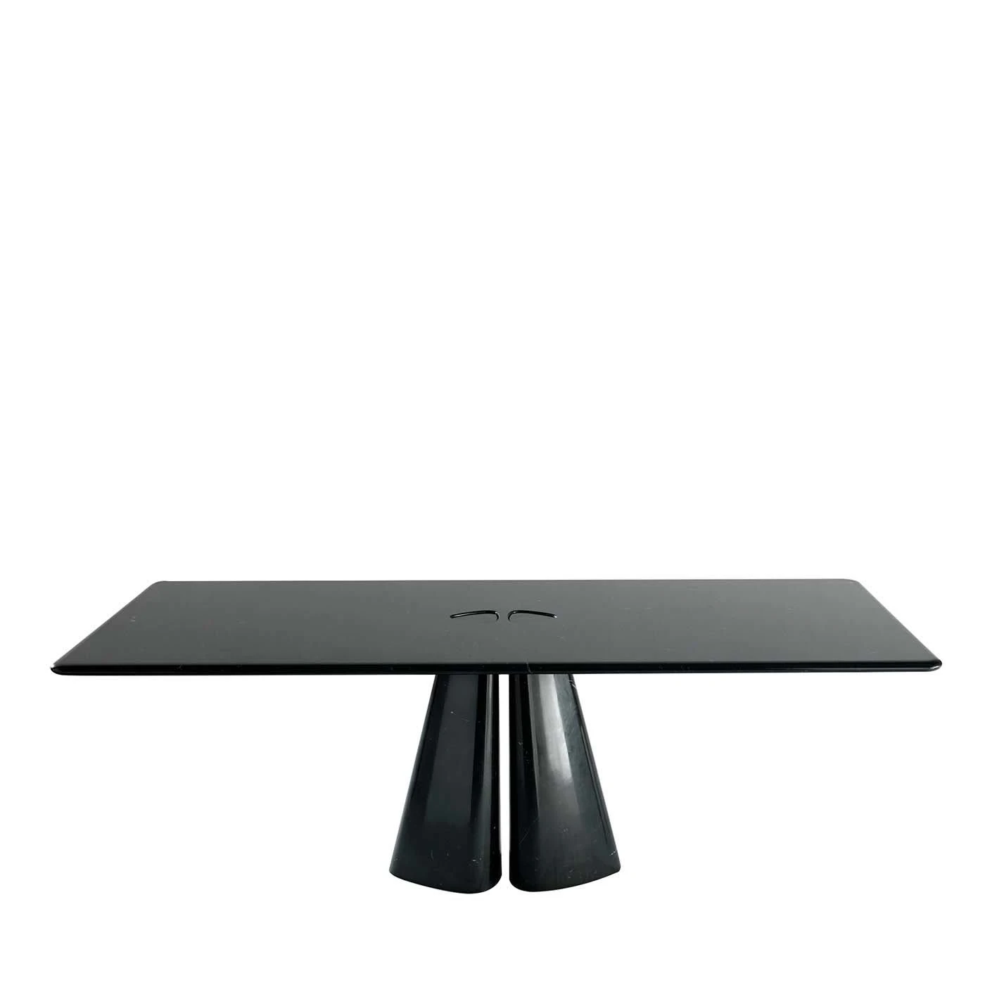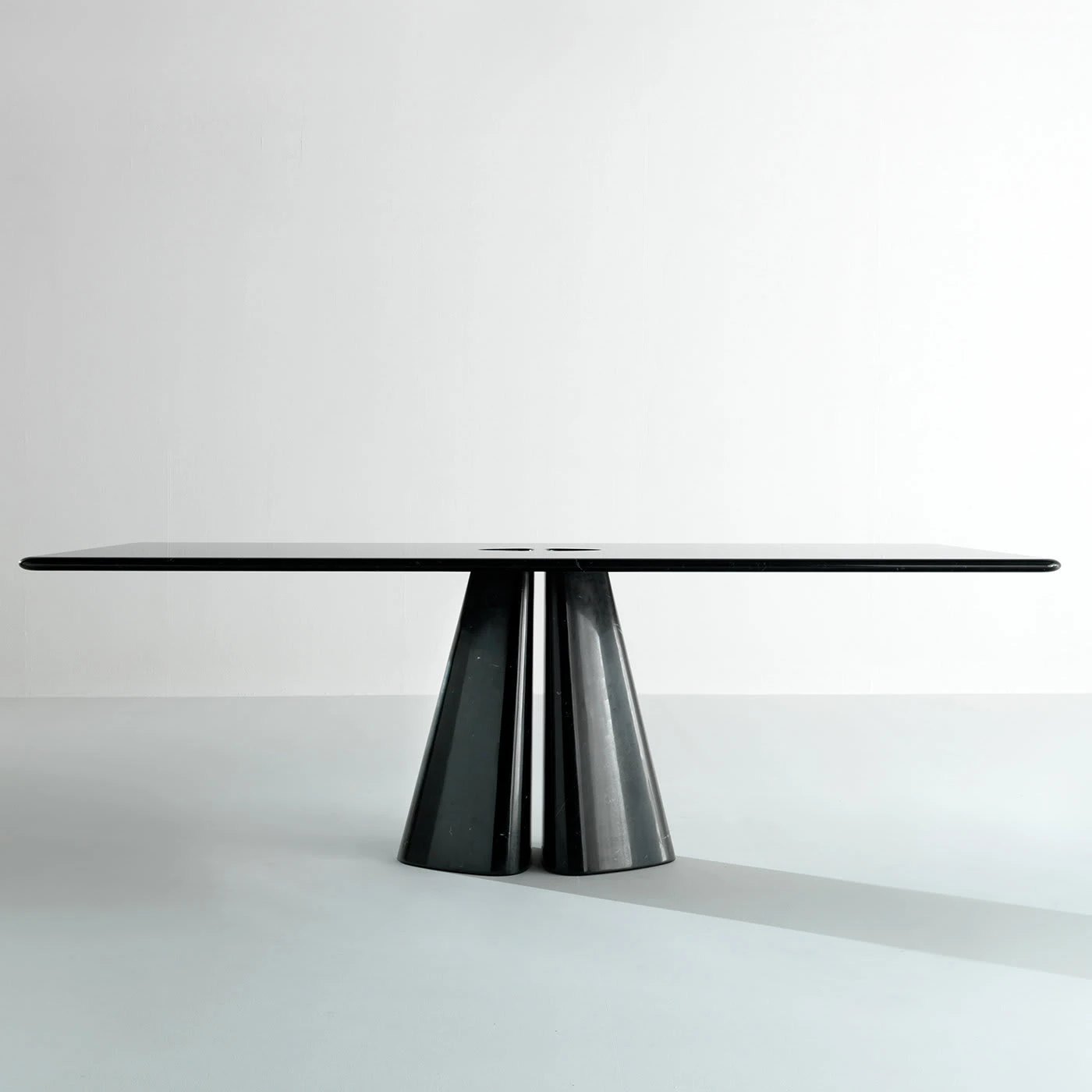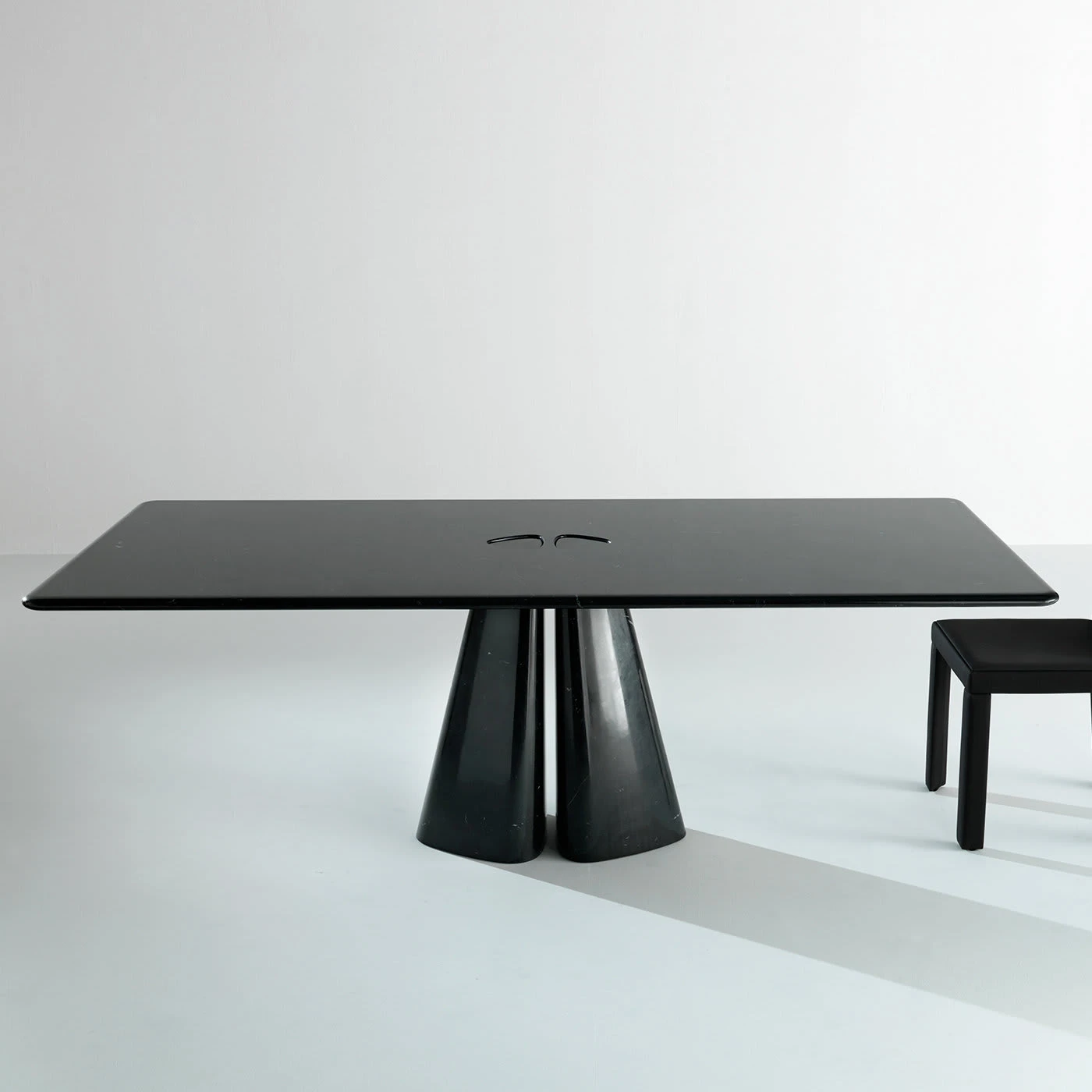 This stunning dining table is entirely made of black marble. A thick rectangular marble top with rounded edges is supported by a unique based formed by two thick angular blocks of the same marble as the top. This is a gorgeous piece that will be a perfect combination of utility and design in any dining space