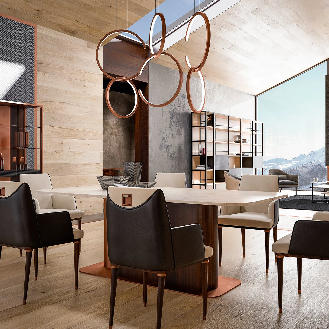 This dining table features bold sculptural pedestals and slim rectangular tops in a design that refines elegant solidity. Fashioned of white Calacatta marble, the rectangular top with rounded corners sits atop an elongated oval base placed on a rectangular metal plate with a brushed-brass finish. The pedestal is formed by the intersection of a brushed-brass metal element inserted into a larger section in eucalyptus-veneered wood in a masterful balance of textures. An impressive showcase of craftsmanship, this dining table will suit both modern and industrial-inspired dining room decors.