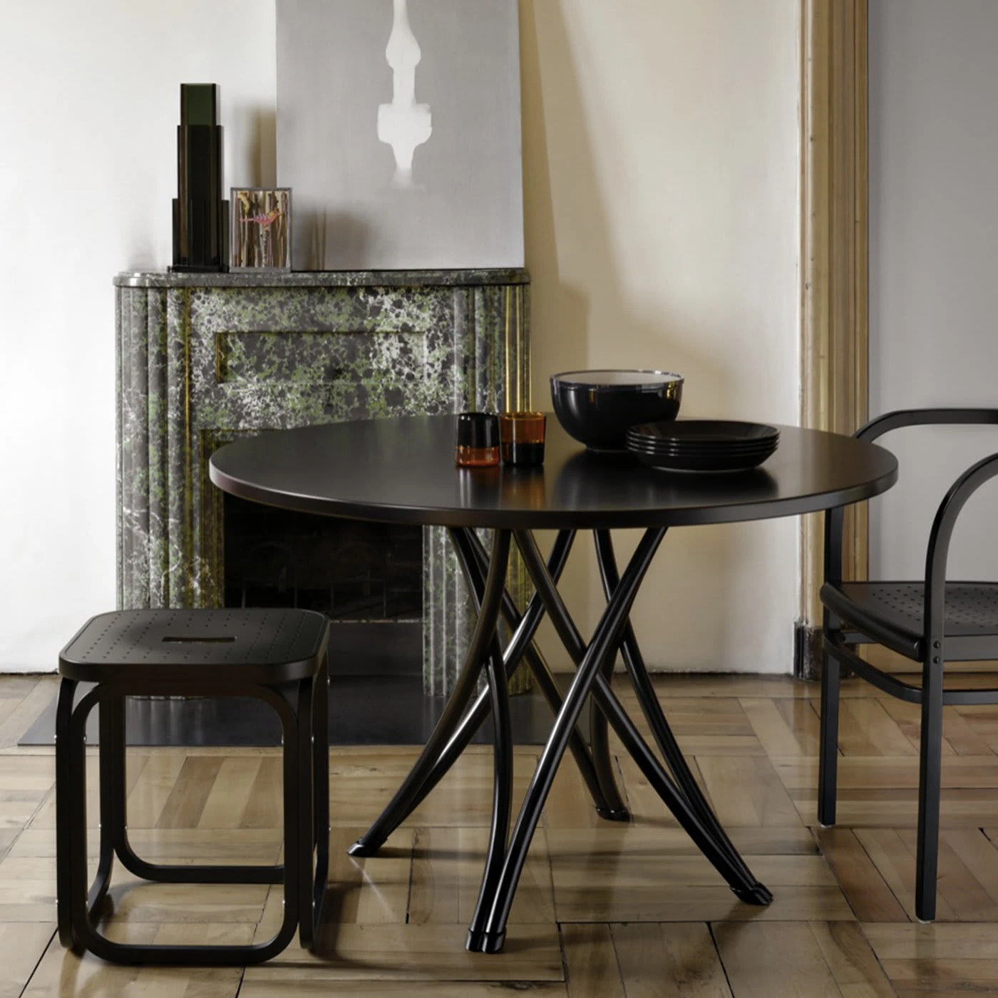 Part of the Rehbeintisch collection designed by Gebruder Thonet in 1888, this table combines a sense of lightness and movement in the elegant intersection of its slightly curved legs with a solid look that will add sophistication to any decor. The round top is in beechwood-veneered wood with a solid edge, while the standout element of the piece is its base, comprising four pairs of beechwood legs curved using the steaming technique developed by this brand since its inception. Plastic element protect the bottom of the feet.