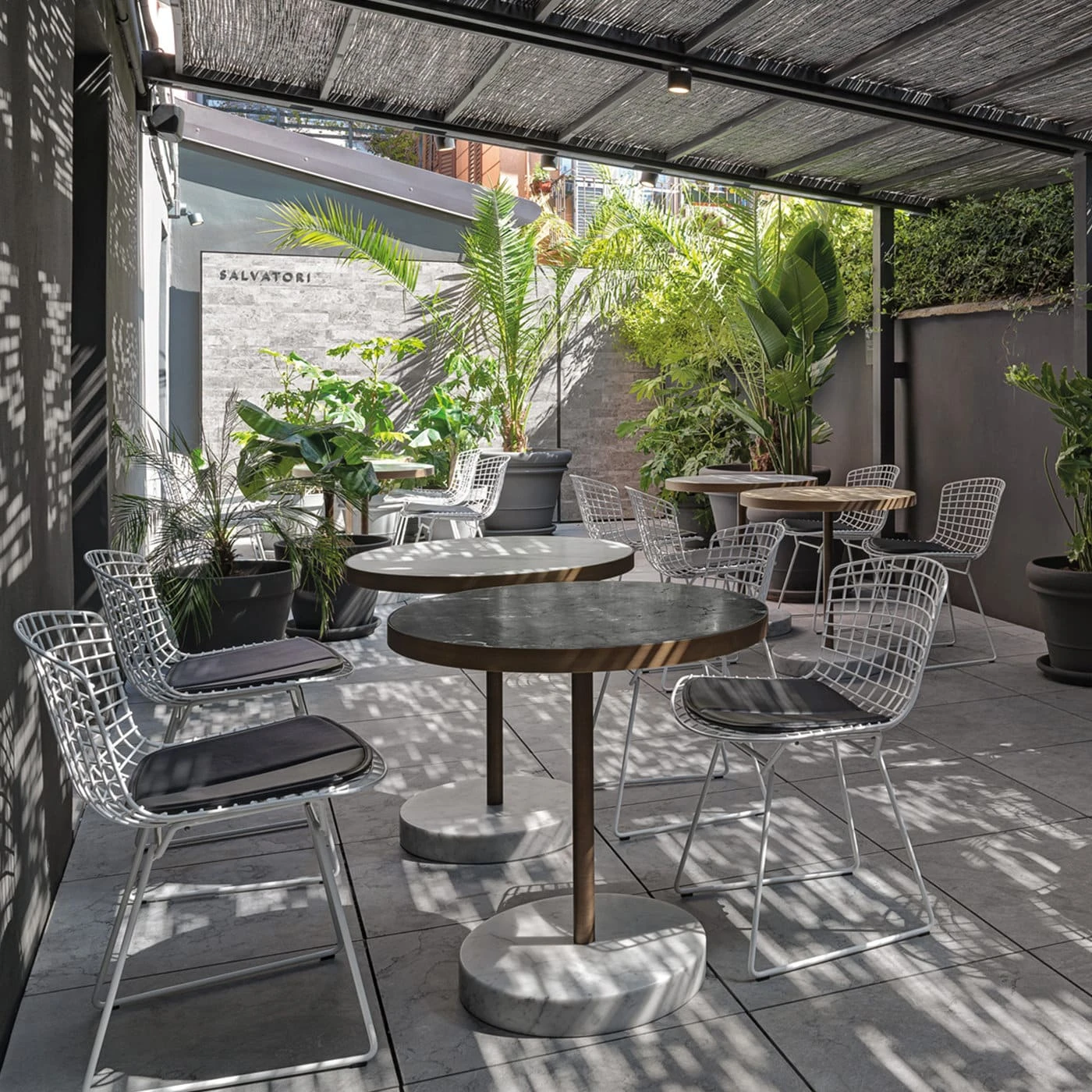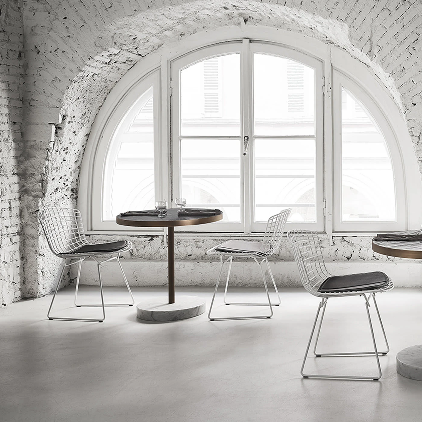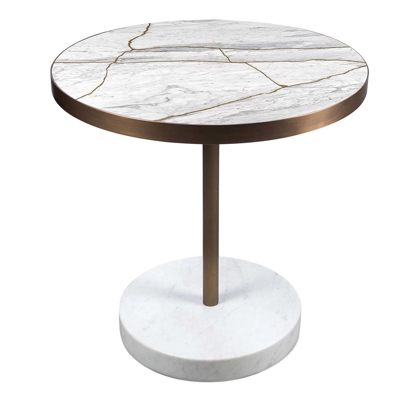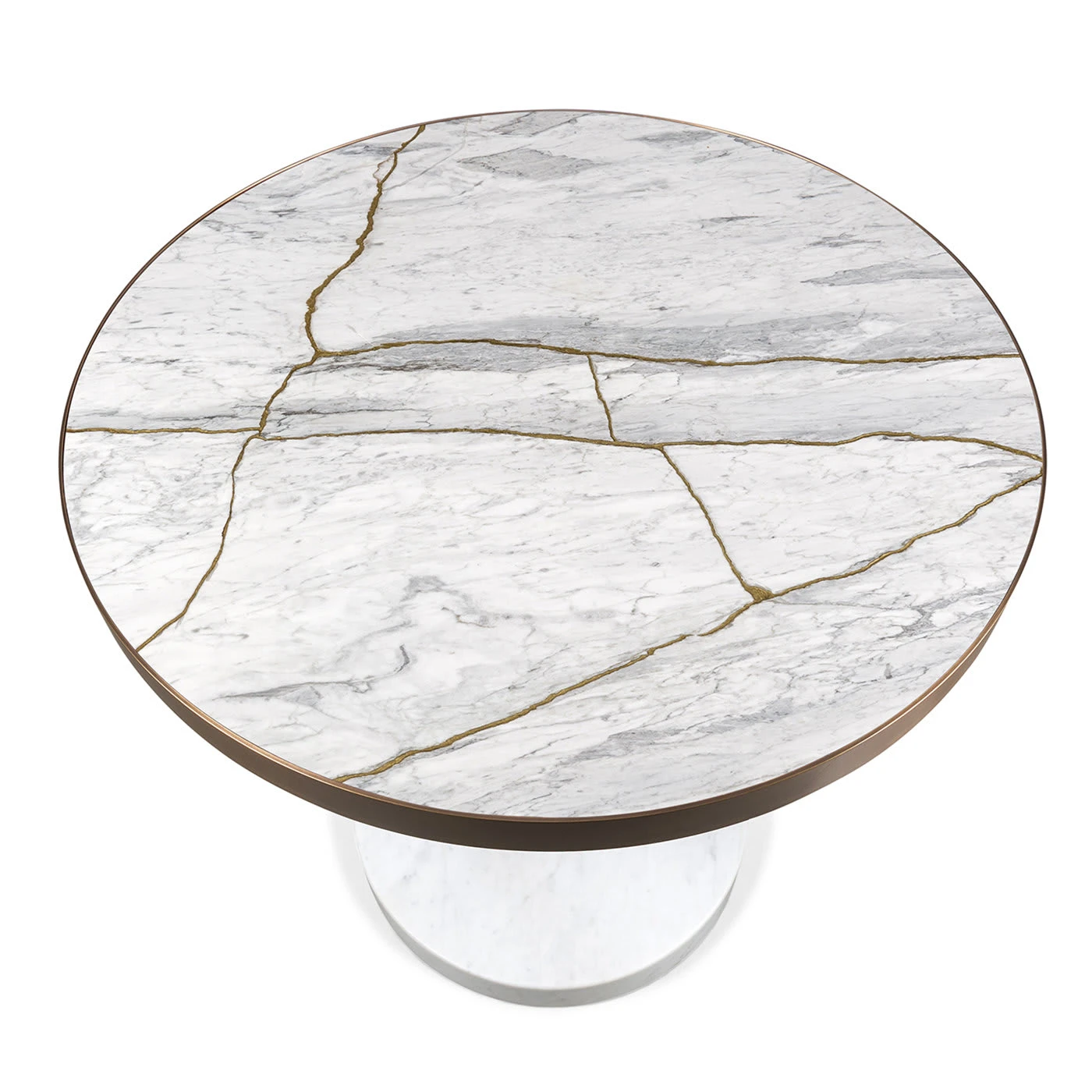 Featuring a timeless marble top in a heritage stone no longer quarried, the René Bistro Table’s surface is broken into small shards and mended together with gold. Piero Lissoni borrowed the technique from the Japanese Kintsugi technique, which views cracks in ceramics as a natural part of their life cycle.