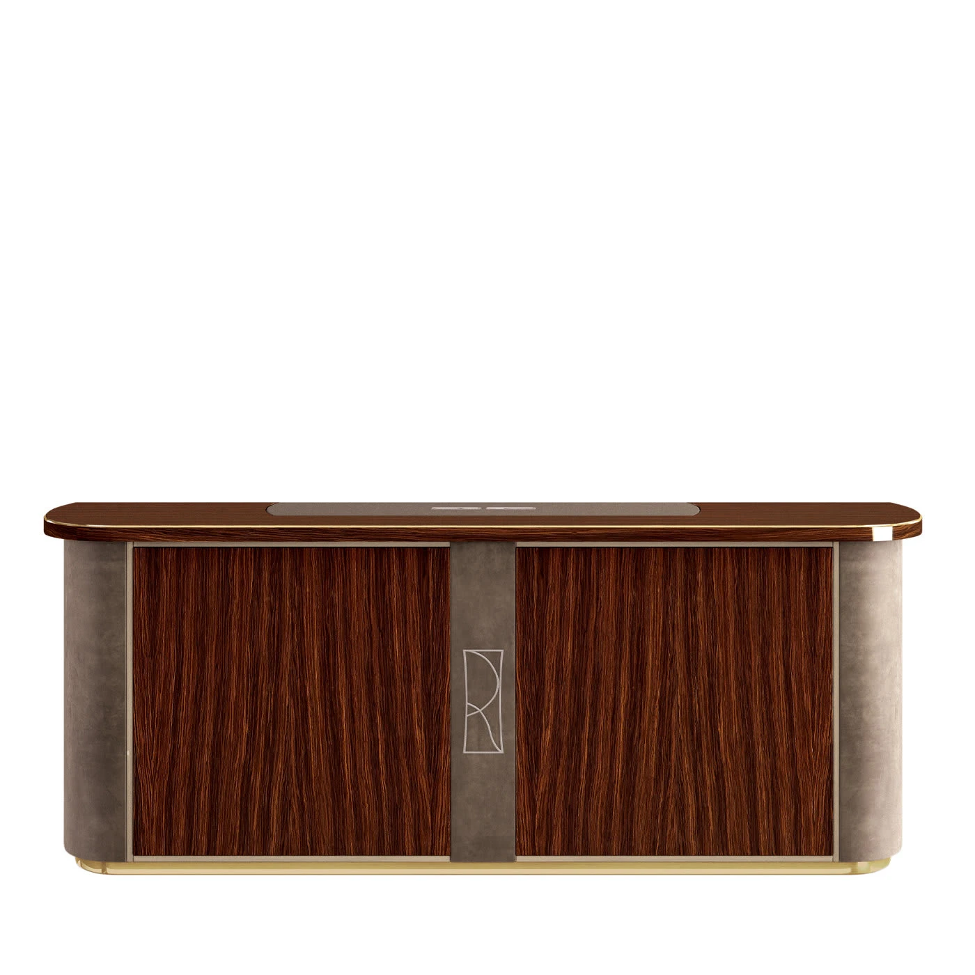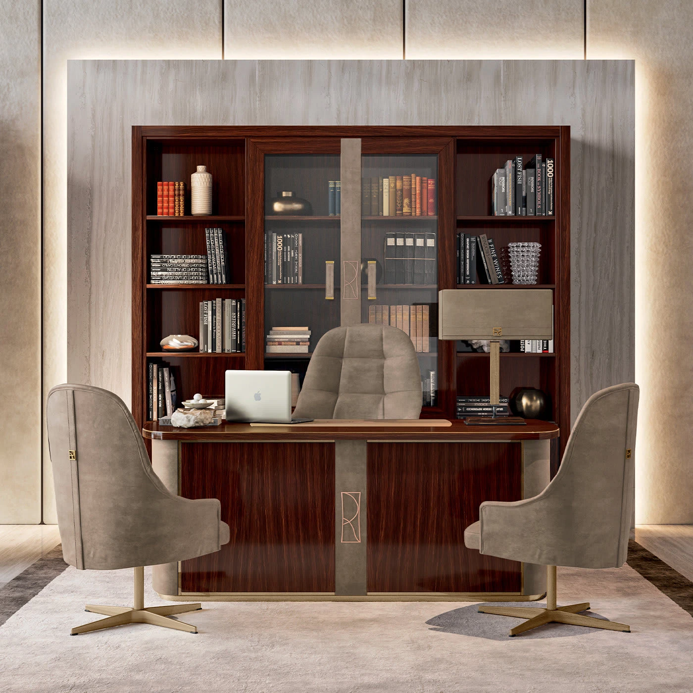 Fashioned of prized rosewood, this writing desk is marked by a versatile and timeless allure that makes it suitable for any type of office or private studio. Boasting a unique combination of fine materials and traditional lines, the piece flaunts a beige upholstery on the exterior of the paneled sides and three drawers, while the rest of the imposing structure showcases the stunning wood’s natural grain.