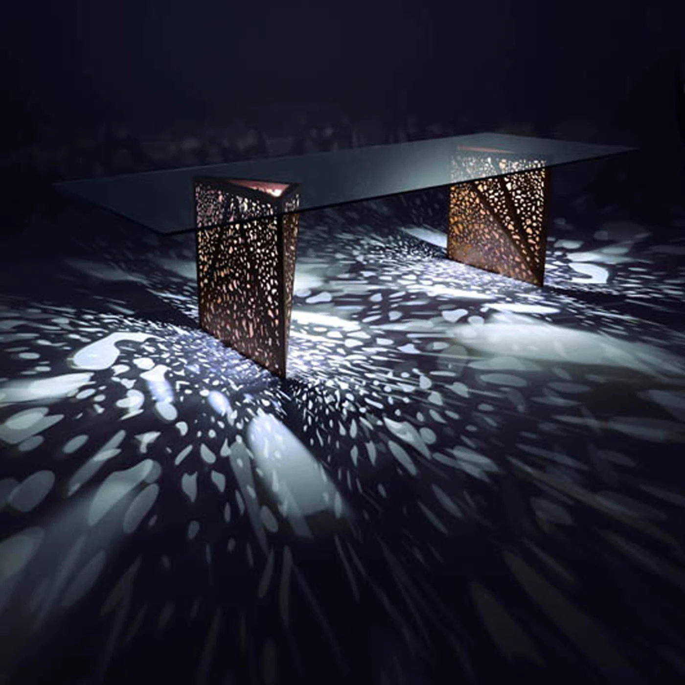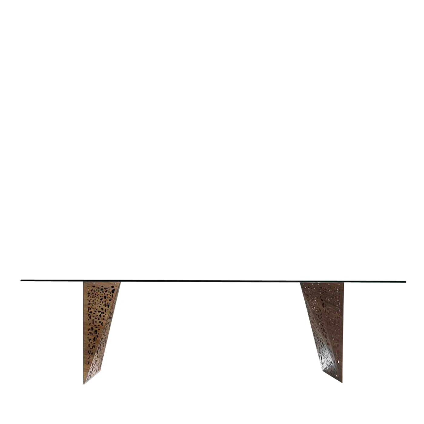Outstanding elements of this stunning and sculptural dining table are the origami-inspired legs which testify to its meticulous craftsmanship and innovative allure. In this design Steven Holl recreates the concept of porosity that he favors in most of his architectural works, showcasing striking legs made of thin layers of wood that allow the internal light to radiate in a myriad of shapes and shadows. Elegantly resting on these sculptural legs, the tempered glass rectangular top adds a sophisticated touch to the piece.