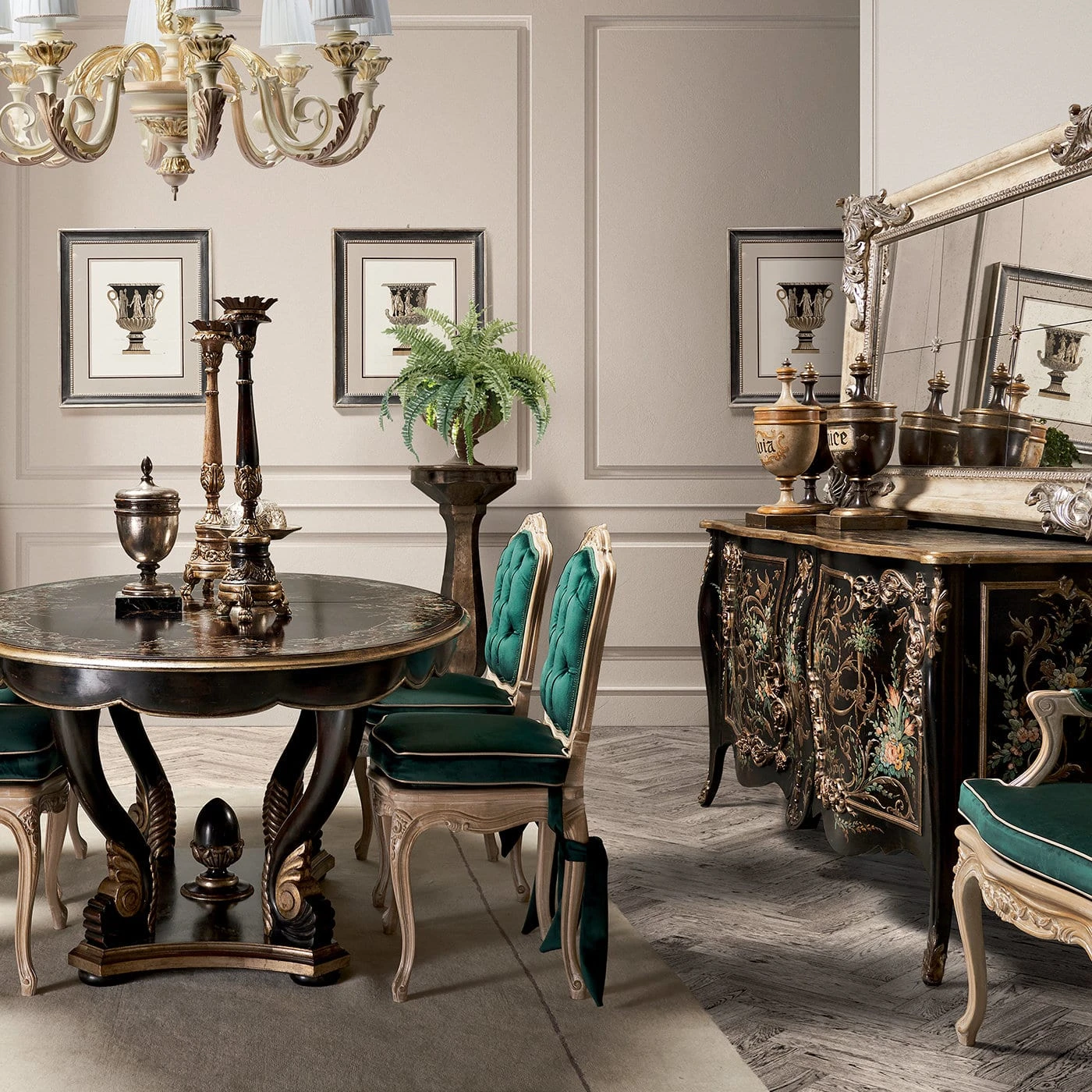 A masterful work of craftsmanship with utmost attention to detail, this refined dining table is made of solid lime wood and MDF with a black-lacquered finish and gold-colored details. The round top is magnificently supported with four sinuous legs resting on a four-footed base.