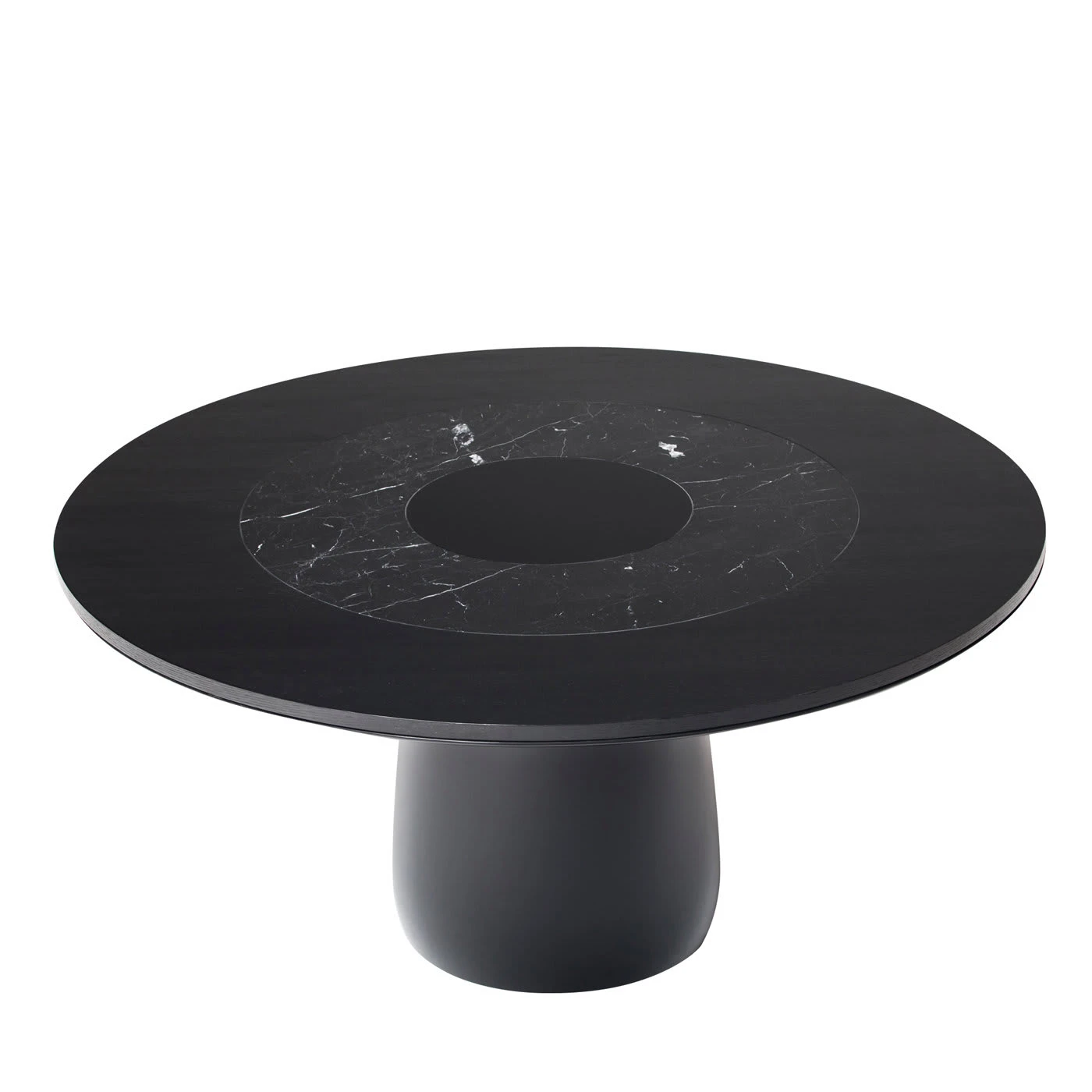 Designed by Claesson Koivisto Rune, this table has a sculptural silhouette defined by circular shapes. An elegant addition in a modern dining room, this table is finished in semi-gloss black lacquer and features a central leg in rigid structural polyurethane with a round wooden top marked by three concentric circles in color gradients that further accent the sinuous design. The table top is available also in red-lacquered tempered glass, semi-glossy black oak veneer, and black Marquina marble.