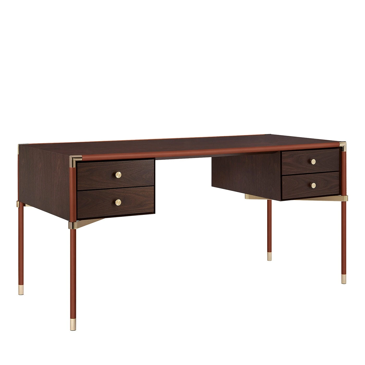 This elegant sleek desk presents the same features as the Olimpia bookcase and the Prestige sideboard: tubular elements clad in thick cognac leather are connected by metal ribbons in satin light brass, becoming decorative and functional details at the same time. Rousseau enhances the concept of lightness thanks to its thin top and the legs completed by metal feet. The desk is equipped with four drawers. Please contact the Concierge for other information.