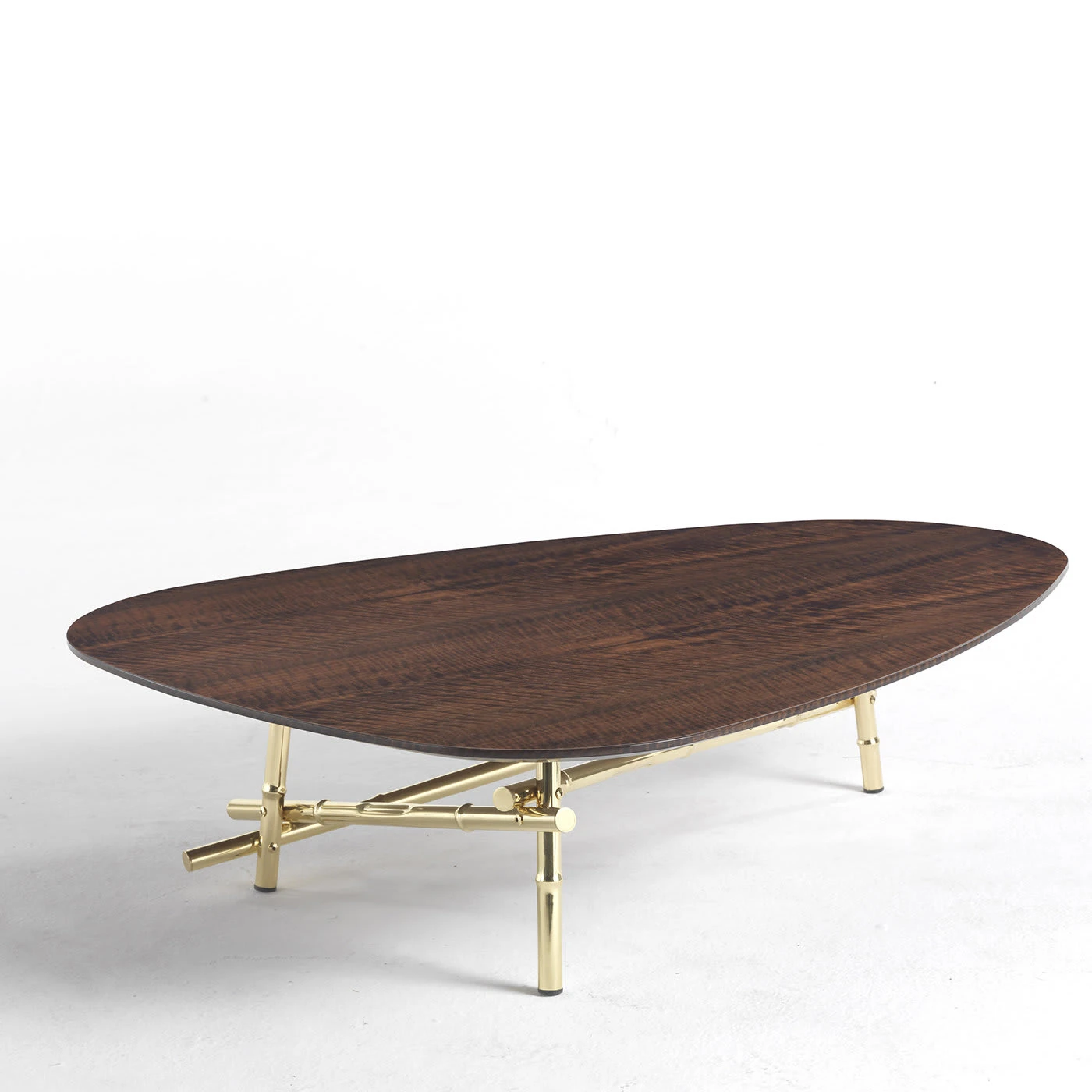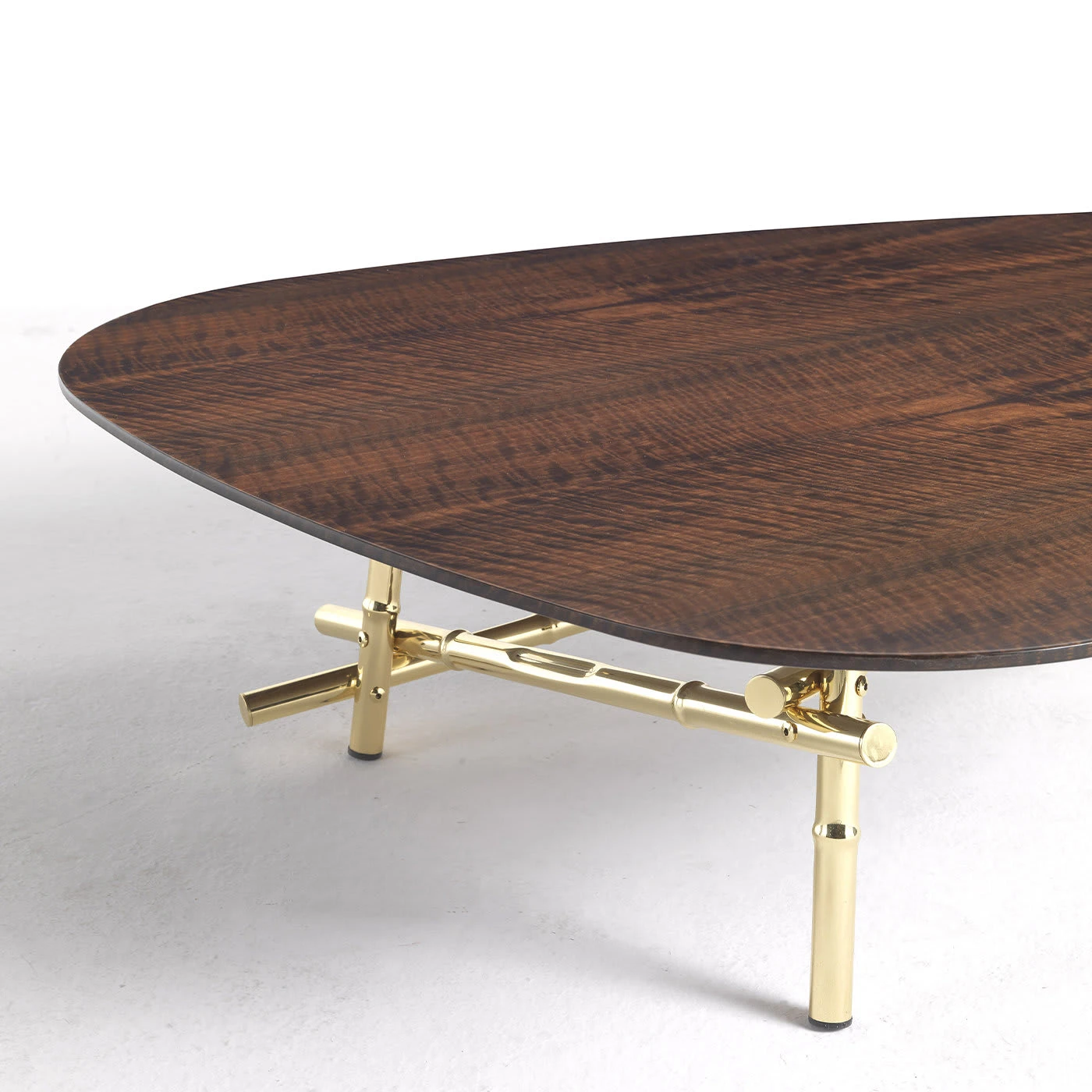 An elegant and evocative piece of furniture, the Samarcanda central table features a wooden top whose warm tones recall the charm of arid deserts and distant lands. A pleasant dynamic effect that contrasts with the base made up of a twist of bamboo canes, natural elements that turns into precious materials, able to give light to the environment. The Samarcanda central table can be used individually or combined with side tables of the same line for the creation of the personalized composition. Structure in polished brass. Top in smoked eucalyptus frisè wood. Please consult the Concierge for available customization options and size variants.