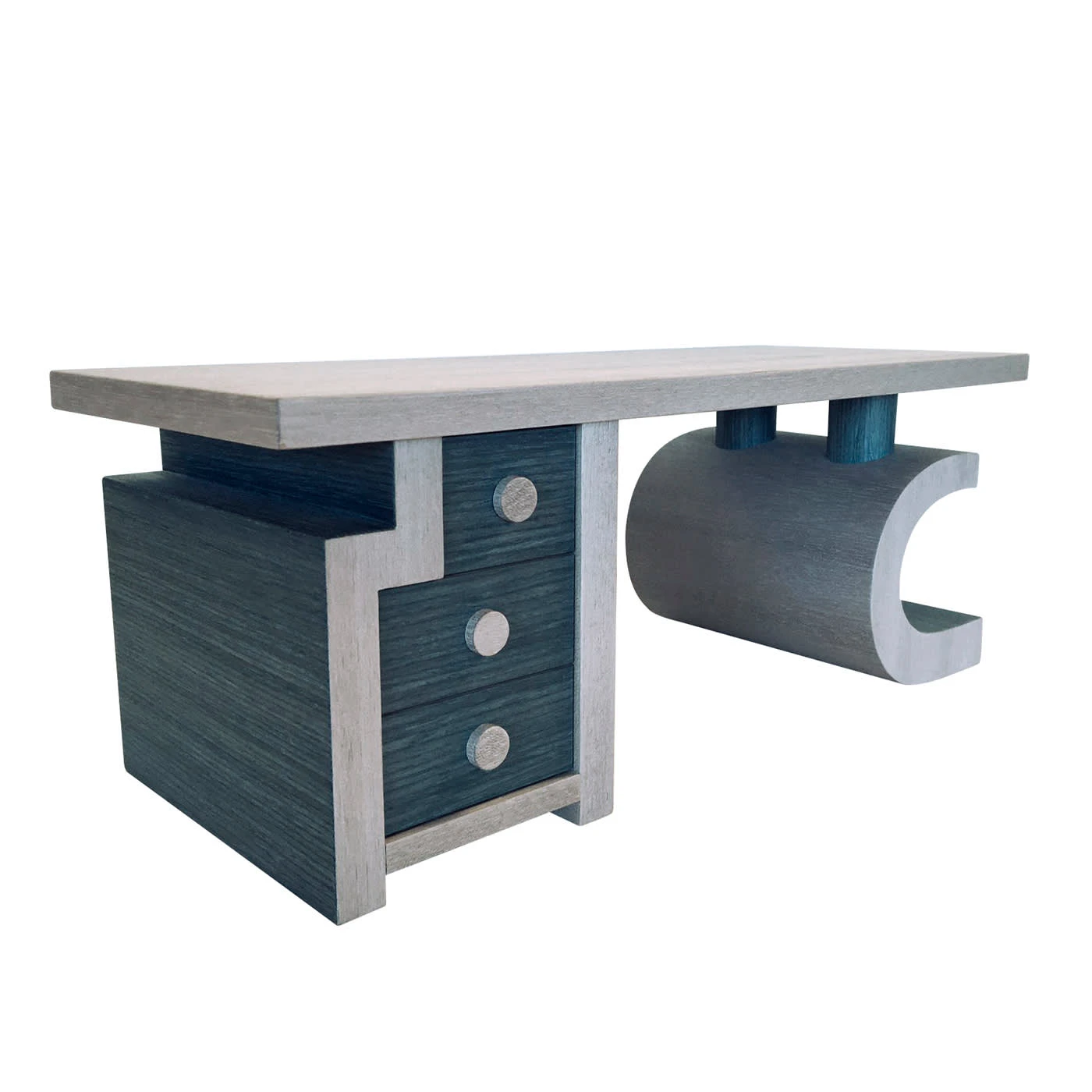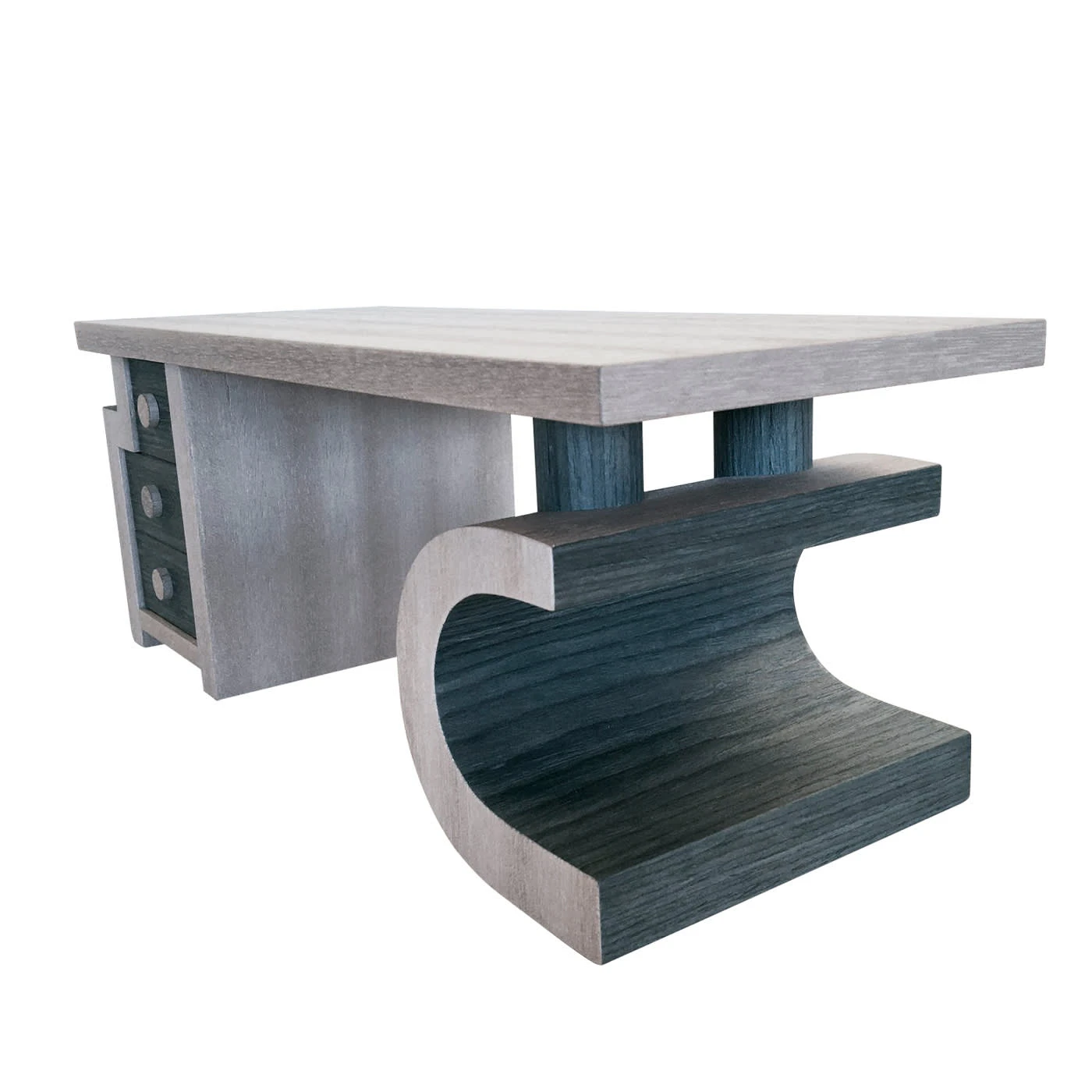 This desk coupling azure and gray wood will surely be a bold and playful statement in private studies and contemporary bedroom decors. Its daring asymmetrical design reveals a strong geometric inspiration that can be appreciated in every component, from the circular handles to the C-shaped legs. Please consult the Concierge for available finishing variants.